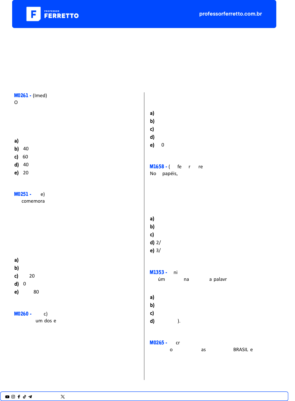 <p>Vestibulares</p><p>Análise Combinatória</p><p>Permutação</p><p>M0261 - (Imed)</p><p>O número de candidatos inscritos para realização do</p><p>úl�mo ves�bular de verão, em um determinado curso,</p><p>corresponde ao número de anagramas da palavra</p><p>VESTIBULAR que começam por VE e terminam por AR.</p><p>Esse número é igual a:</p><p>a) 120</p><p>b) 240</p><p>c) 360</p><p>d) 540</p><p>e) 720</p><p>M0251 - (Upe)</p><p>Na comemoração de suas Bodas de Ouro, Sr. Manuel e D.</p><p>Joaquina resolveram registrar o encontro com seus</p><p>familiares através de fotos. Uma delas sugerida pela</p><p>família foi dos avós com seus 8 netos. Por sugestão do</p><p>fotógrafo, na organização para a foto, todos os netos</p><p>deveriam ficar entre os seus avós.</p><p>De quantos modos dis�ntos Sr. Manuel e D. Joaquina</p><p>podem posar para essa foto com os seus netos?</p><p>a) 100</p><p>b) 800</p><p>c) 40 320</p><p>d) 80 640</p><p>e) 3 628 800</p><p>M0260 - (Fatec)</p><p>No Boxe, um dos esportes olímpicos, um pugilista tem à</p><p>sua disposição quatro golpes básicos: o jab, o direto, o</p><p>cruzado e o gancho. Suponha que um pugilista,</p><p>preparando-se para os Jogos Olímpicos do Rio, em 2016,</p><p>queira criar uma sequência com 6 golpes, empregando</p><p>necessariamente dois jabs, dois diretos, um cruzado e um</p><p>gancho.</p><p>Assim, o número máximo de sequências que ele poderá</p><p>criar será de</p><p>a) 180</p><p>b) 160</p><p>c) 140</p><p>d) 120</p><p>e) 100</p><p>M1658 - (Professor Ferre�o)</p><p>Nove papéis, brancos e idên�cos, foram numerados, cada</p><p>um, com os números 51 a 59 escritos em um de seus</p><p>lados. Após, foram embaralhados com as faces numéricas</p><p>voltadas para baixo. A probabilidade de, após o</p><p>embaralhamento, os papéis ficarem alternados entre</p><p>pares e ímpares é de</p><p>a) 1/126</p><p>b) 1/140</p><p>c) 1/154</p><p>d) 2/135</p><p>e) 3/136</p><p>M1353 - (Unicamp)</p><p>O número de anagramas da palavra REFLORESTAMENTO</p><p>que começam com a sequência FLORES é</p><p>a) 9!.</p><p>b) 9!/2!.</p><p>c) 9!/(2!2!).</p><p>d) 9!/(2!2!2!).</p><p>M0265 - (Pucrs)</p><p>O número de anagramas da palavra BRASIL em que as</p><p>vogais ficam lado a lado, e as consoantes também, é</p><p>1@professorferretto @prof_ferretto</p><p>a) 24</p><p>b) 48</p><p>c) 96</p><p>d) 240</p><p>e) 720</p><p>M0264 - (Uerj)</p><p>Uma criança ganhou seis picolés de três sabores</p><p>diferentes: baunilha, morango e chocolate,</p><p>representados, respec�vamente, pelas letras B, M e C. De</p><p>segunda a sábado, a criança consome um único picolé</p><p>por dia, formando uma sequência de consumo dos</p><p>sabores. Observe estas sequências, que correspondem a</p><p>diferentes modos de consumo:</p><p>(B, B, M, C, M, C) ou (B, M, M, C, B, C) ou (C, M, M, B, B,</p><p>C)</p><p>O número total de modos dis�ntos de consumir os</p><p>picolés equivale a:</p><p>a) 6</p><p>b) 90</p><p>c) 180</p><p>d) 720</p><p>M0263 - (Upe)</p><p>A vendedora de roupas está arrumando os cabides da</p><p>vitrine de uma loja. Ela deve pendurar 5 camisas, 3</p><p>bermudas e 2 casacos na vitrine, de modo que cada peça</p><p>fique uma do lado da outra sem sobreposição.</p><p>Quantas são as disposições possíveis nessa arrumação,</p><p>de modo que as peças de um mesmo �po fiquem sempre</p><p>juntas, lado a lado na vitrine?</p><p>a) 30</p><p>b) 120</p><p>c) 1440</p><p>d) 4320</p><p>e) 8640</p><p>M0262 - (Epcar)</p><p>Uma caixa contém 10 bolas das quais 3 são amarelas e</p><p>numeradas de 1 a 3; 3 verdes numeradas de 1 a 3 e mais</p><p>4 bolas de outras cores todas dis�ntas e sem numeração.</p><p>A quan�dade de formas dis�ntas de se enfileirar essas 10</p><p>bolas de modo que as bolas de mesmo número fiquem</p><p>juntas é</p><p>a) 8.7!</p><p>b) 7!</p><p>c) 5.4!</p><p>d) 10!</p><p>M0258 - (Unesp)</p><p>A figura mostra a planta de um bairro de uma cidade.</p><p>Uma pessoa quer caminhar do ponto A ao ponto B por</p><p>um dos percursos mais curtos. Assim, ela caminhará</p><p>sempre nos sen�dos “de baixo para cima” ou “da</p><p>esquerda para a direita”. O número de percursos</p><p>diferentes que essa pessoa poderá fazer de A até B é:</p><p>a) 95 040.</p><p>b) 40 635.</p><p>c) 924.</p><p>d) 792.</p><p>e) 35.</p><p>M1575 - (Professor Ferre�o)</p><p>Um parque é formado por caminhos formados por</p><p>triângulos equiláteros congruentes, conforme a</p><p>representação abaixo.</p><p>Uma pessoa se desloca do ponto A para o ponto B sobre</p><p>os lados dos triângulos, percorrendo n caminhos</p><p>dis�ntos, cujos comprimentos totais são todos iguais.</p><p>Sabendo que a distância será sempre a menor possível, n</p><p>equivale a:</p><p>a) 20</p><p>b) 15</p><p>c) 12</p><p>d) 10</p><p>2@professorferretto @prof_ferretto</p><p>M0259 - (Fuvest)</p><p>Um lotação possui três bancos para passageiros, cada um</p><p>com três lugares, e deve transportar os três membros da</p><p>família Sousa, o casal Lúcia e Mauro e mais quatro</p><p>pessoas. Além disso,</p><p>1. a família Sousa quer ocupar um mesmo banco;</p><p>2. Lúcia e Mauro querem sentar-se lado a lado.</p><p>Nessas condições, o número de maneiras dis�ntas de</p><p>dispor os nove passageiros no lotação é igual a</p><p>a) 928</p><p>b) 1152</p><p>c) 1828</p><p>d) 2412</p><p>e) 3456</p><p>M1655 - (Professor Ferre�o)</p><p>Um casal de namorados irá a um jantar de família na casa</p><p>da namorada. Par�ciparão do jantar eles dois mais os</p><p>pais e os dois irmãos da namorada, totalizando 6</p><p>pessoas. Esse casal, ao observar a mesa de jantar, que</p><p>está representada na imagem abaixo, decide sentar-se</p><p>um ao lado do outro. Sabendo que as seis cadeiras serão</p><p>ocupadas, de quantas formas dis�ntas os seis integrantes</p><p>do jantar poderão ocupar os lugares da mesa?</p><p>a) 96.</p><p>b) 120.</p><p>c) 192.</p><p>d) 384.</p><p>e) 720.</p><p>M0