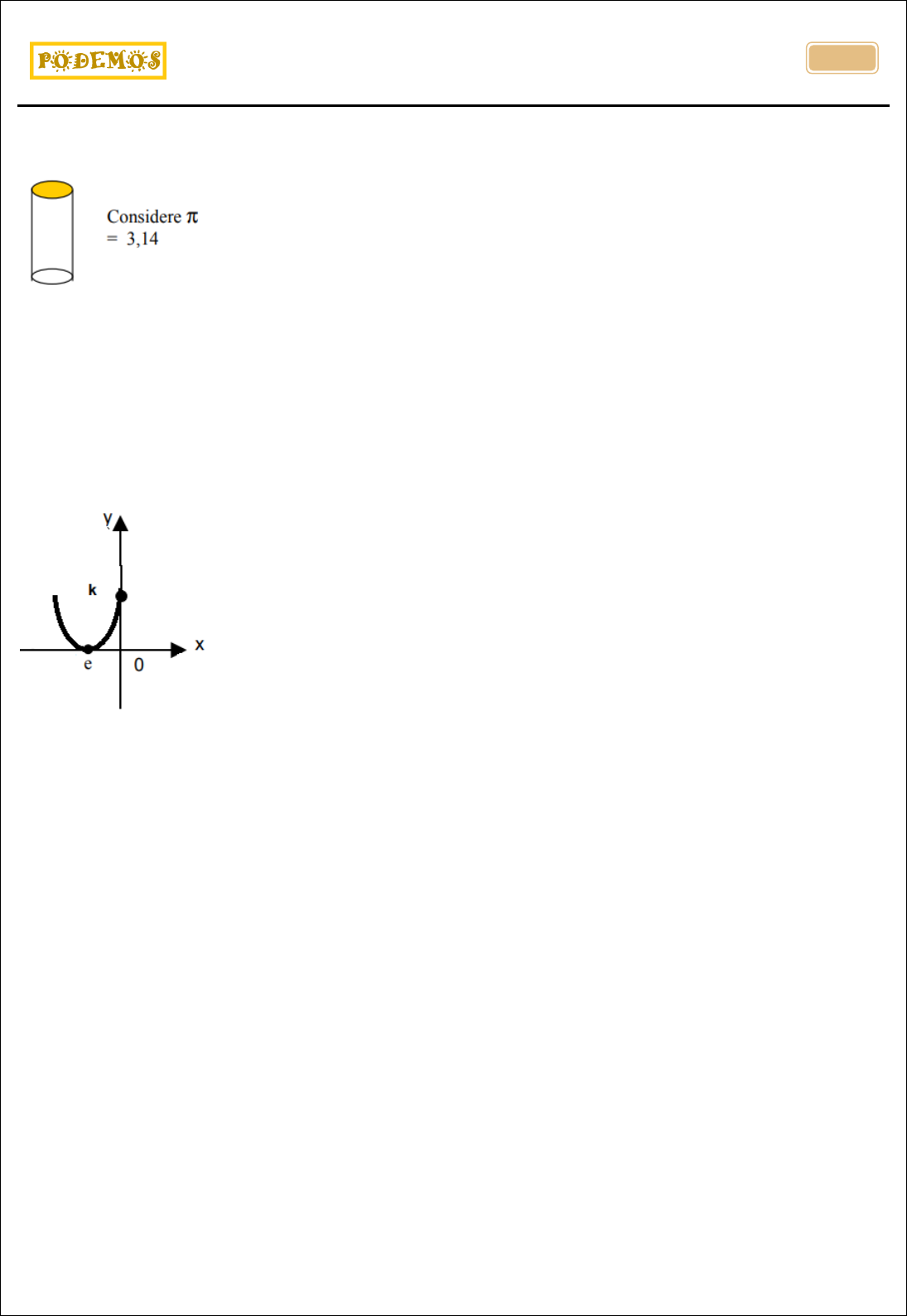 <p>AS QUESTÕES DO IFSULDEMINAS</p><p>Prof. Otávio Luciano Camargo Sales de Magalhães</p><p>.</p><p>38</p><p>8)(Vestibular – Escola Agrotécnica Federal de Muzambinho – Técnico e Ensino Médio – 2° ano – 1°</p><p>Semestre/2006) Um tubo de plástico tem 30 cm de comprimento e 10 cm de diâmetro. Ele se encontra numa</p><p>posição vertical com a extremidade inferior vedada. Se colocarmos dois litros de água nesse tubo</p><p>a) a água transborda.</p><p>b) a água não atinge a metade do tubo.</p><p>c) a água ultrapassa a metade do tubo.</p><p>d) a água enche completamente o tubo.</p><p>e) a água não atinge um terço do volume do tubo.</p><p>9)(Vestibular – Escola Agrotécnica Federal de Muzambinho – Técnico e Ensino Médio – 2° ano – 1°</p><p>Semestre/2006) Na figura temos o gráfico da função real definida por 𝑦 = 𝑥2 + 𝑚𝑥 + (15 – 𝑚). A</p><p>ordenada k do ponto de intersecção da parábola com o eixo Oy é</p><p>Observe que as duas raízes são iguais, 𝑥′ = 𝑥′′ e que, portanto, o discriminante é nulo.</p><p>a)−10</p><p>b)6</p><p>c)−6</p><p>d)0</p><p>e)9</p><p>10)(Vestibular – Escola Agrotécnica Federal de Muzambinho – Técnico e Ensino Médio – 2° ano – 1°</p><p>Semestre/2006) Um produtor de leite possui um rebanho de 120 cabras em lactação. A produção média por</p><p>cabra é de 3,0 litros de leite por dia e o período de lactação é de 310 dias. Baseado nestes dados, a produção</p><p>de cada cabra durante sua lactação e a produção total do rebanho durante a lactação são, respectivamente,</p><p>a) 360 litros/dia e 111600 litros.</p><p>b) 360 litros/dia e 11160 litros.</p><p>c) 3600 litros/dia e 11160 litros.</p><p>d) 930 litros/dia e 15250 litros.</p><p>e) 930 litros/dia e 111600 litros.</p>