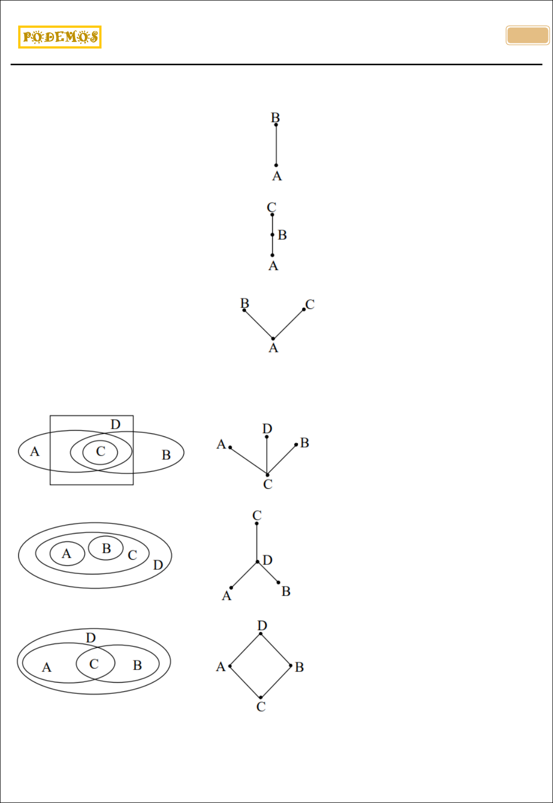 <p>VESTIBULAR EAFI – SUPERIOR – 2006/1</p><p>Prof. Otávio Luciano Camargo Sales de Magalhães</p><p>.</p><p>49</p><p>8)(Vestibular – Escola Agrotécnica Federal de Inconfidentes – Superior – 1° Semestre/2006) Um modo</p><p>prático e instrutivo de ilustrar as relações entre conjuntos é por meio dos chamados diagramas de linhas.</p><p>Se A é um subconjunto de B, 𝐴 ⊂ 𝐵, o diagrama é da forma:</p><p>Se 𝐴 ⊂ 𝐵 ⊂ 𝐶</p><p>Se 𝐴 ⊂ 𝐵, 𝐴 ⊂ 𝐶, 𝐵 ⊄ 𝐶, 𝐶 ⊄ 𝐵</p><p>Uma outra forma de expressar tais relações é o diagrama de Venn. Nas opções abaixo, o diagrama de</p><p>Venn está relacionado ao diagrama de linhas. Assinale a opção INCORRETA.</p><p>a)</p><p>b)</p><p>c)</p>