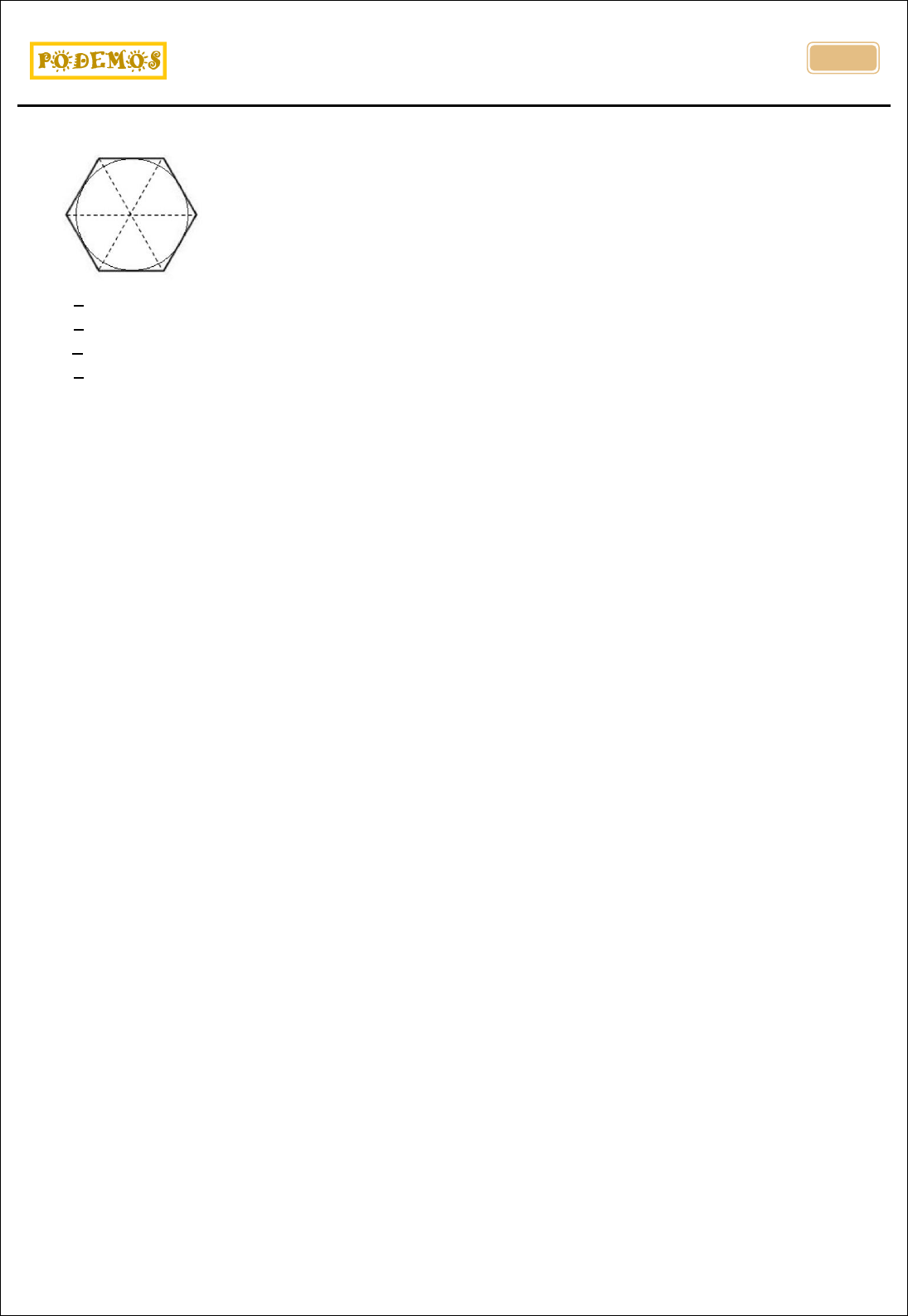 <p>AS QUESTÕES DO IFSULDEMINAS</p><p>Prof. Otávio Luciano Camargo Sales de Magalhães</p><p>.</p><p>136</p><p>hexagonal regular de 5 cm de altura, tendo o lado do hexágono da base 20 cm. Qual é o diâmetro da maior</p><p>pizza circular que cabe no interior da embalagem?</p><p>a) 20√3 cm</p><p>b) 25√3 cm</p><p>c) 20√6 cm</p><p>d) 25√6 cm</p>