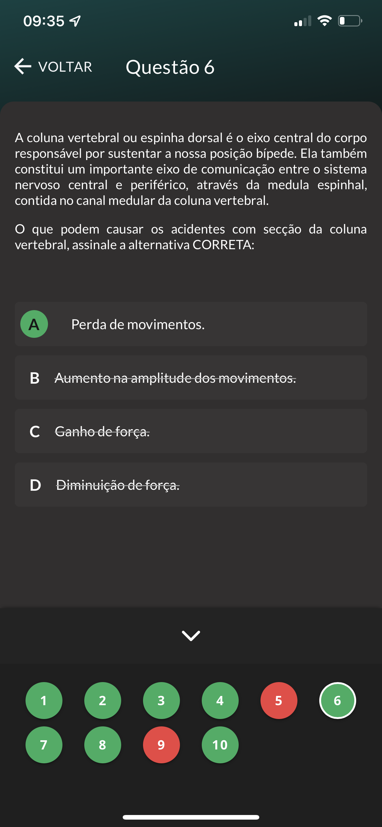 09:35 VOLTAR Questão 6 A coluna vertebral ou espinha dorsal é eixo central do corpo responsável por sustentar a nossa posição bípede. Ela também constitui um importante eixo de comunicação entre sistema nervoso central e periférico, através da medula espinhal, contida no canal medular da coluna vertebral. O que podem causar os acidentes com secção da coluna vertebral, assinale a alternativa CORRETA: A Perda de movimentos. Aumento na amplitude dos movimentos. C Ganho-de força. D Diminuição de força. 1 2 3 4 5 6 7 8 9 10