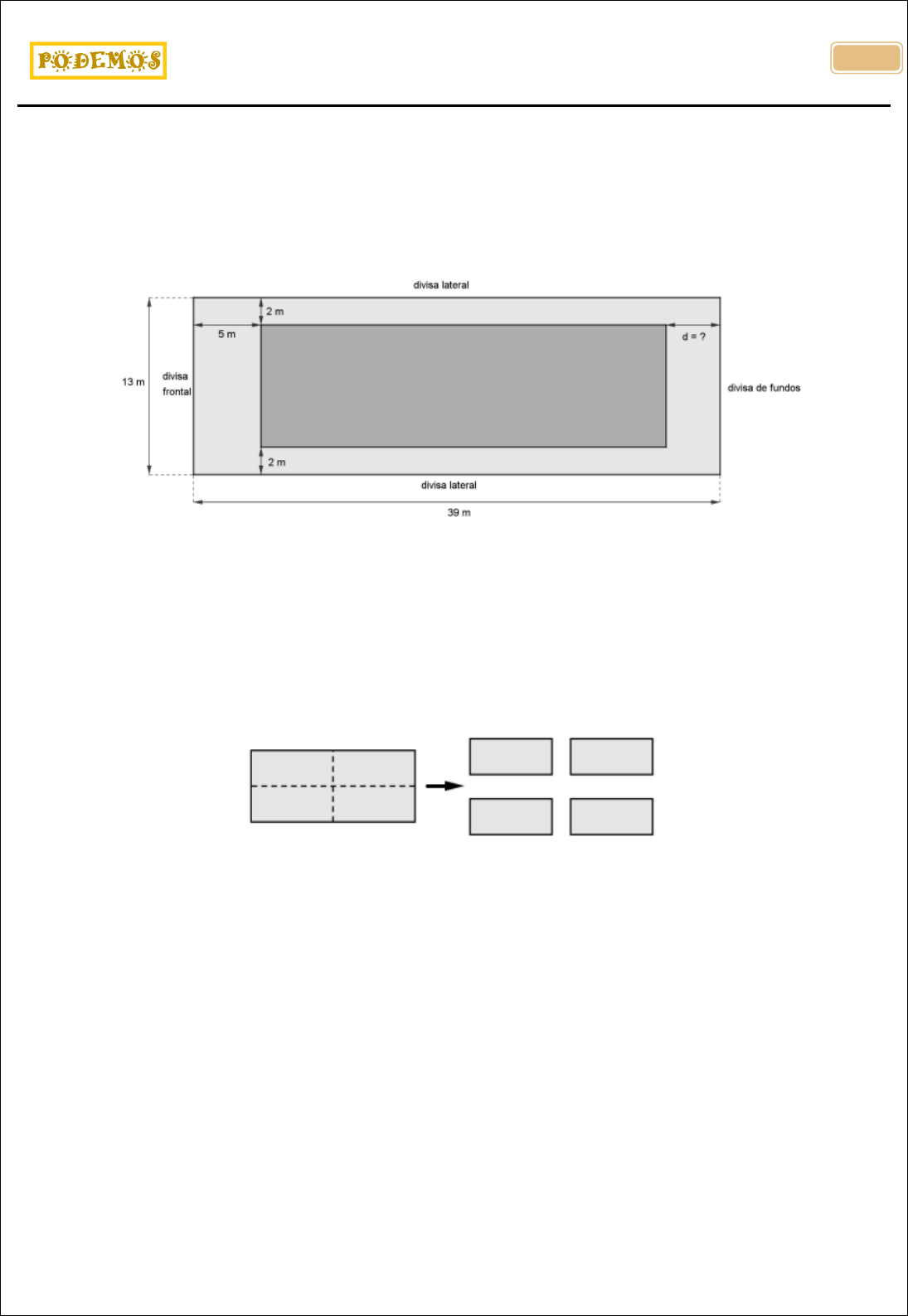<p>UFJF – Vestibular EaD – 2018</p><p>Prof. Otávio Luciano Camargo Sales de Magalhães</p><p>.</p><p>343</p><p>UFJF – Vestibular EaD – 2018</p><p>Concurso Vestibular para Curso de Graduação a Distância – 2018</p><p>1)(Vestibular EaD – UFJF 2018) Deseja-se construir uma casa em formato retangular, com 270 m², num</p><p>terreno retangular que tem 13 m de frente e 39 m de comprimento. Por normas da prefeitura, ao se fazer</p><p>essa construção, devem ser deixados 5 m de afastamento da casa em relação à divisa frontal do terreno e</p><p>2 m de afastamento em relação às fronteiras laterais.</p><p>O afastamento “d”, entre a casa e a fronteira com os fundos do terreno, em metros, deverá ser igual a</p><p>a)9</p><p>b)7</p><p>c)6</p><p>d)5</p><p>e)4</p><p>2)(Vestibular EaD – UFJF 2018) Uma folha retangular foi cortada em quatro partes, todas em formatos de</p><p>retângulos, todos idênticos, cada uma com perímetro igual a 34 cm, conforme ilustrado na figura abaixo.</p><p>O perímetro da folha retangular, em centímetros, antes dos cortes era</p><p>a)34</p><p>b)68</p><p>c)102</p><p>d)136</p><p>e)272</p>