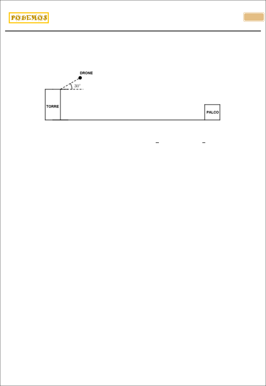 <p>UFJF – PISM – MÓDULO I – TRIÊNIO 2022/2024 – 2023</p><p>Prof. Otávio Luciano Camargo Sales de Magalhães</p><p>.</p><p>383</p><p>7)(Vestibular Seriado – PISM / UFJF – Triênio 2022/2024 – 1º ano do Ensino Médio – 2023) Um show é</p><p>realizado em um terreno plano onde estão localizados um palco e uma torre de 5 metros de altura. Durante</p><p>a realização do show um drone é acionado no ponto mais alto da torre aproximando-se do palco. Ele segue</p><p>uma trajetória retilínea ascendente e que forma ângulo de 30° com o solo. Após percorrer 30√3 metros, o</p><p>drone atinge o ponto mais alto deste trajeto, exatamente acima do ponto médio entre a base da torre e o</p><p>palco. A figura abaixo esquematiza a posição do drone após o início do movimento.</p><p>a) Qual é a distância entre a base da torre e o palco?</p><p>b) A que altura do solo o drone se encontra após percorrer 30√3 metros? (Utilize √3 = 1,7)</p>