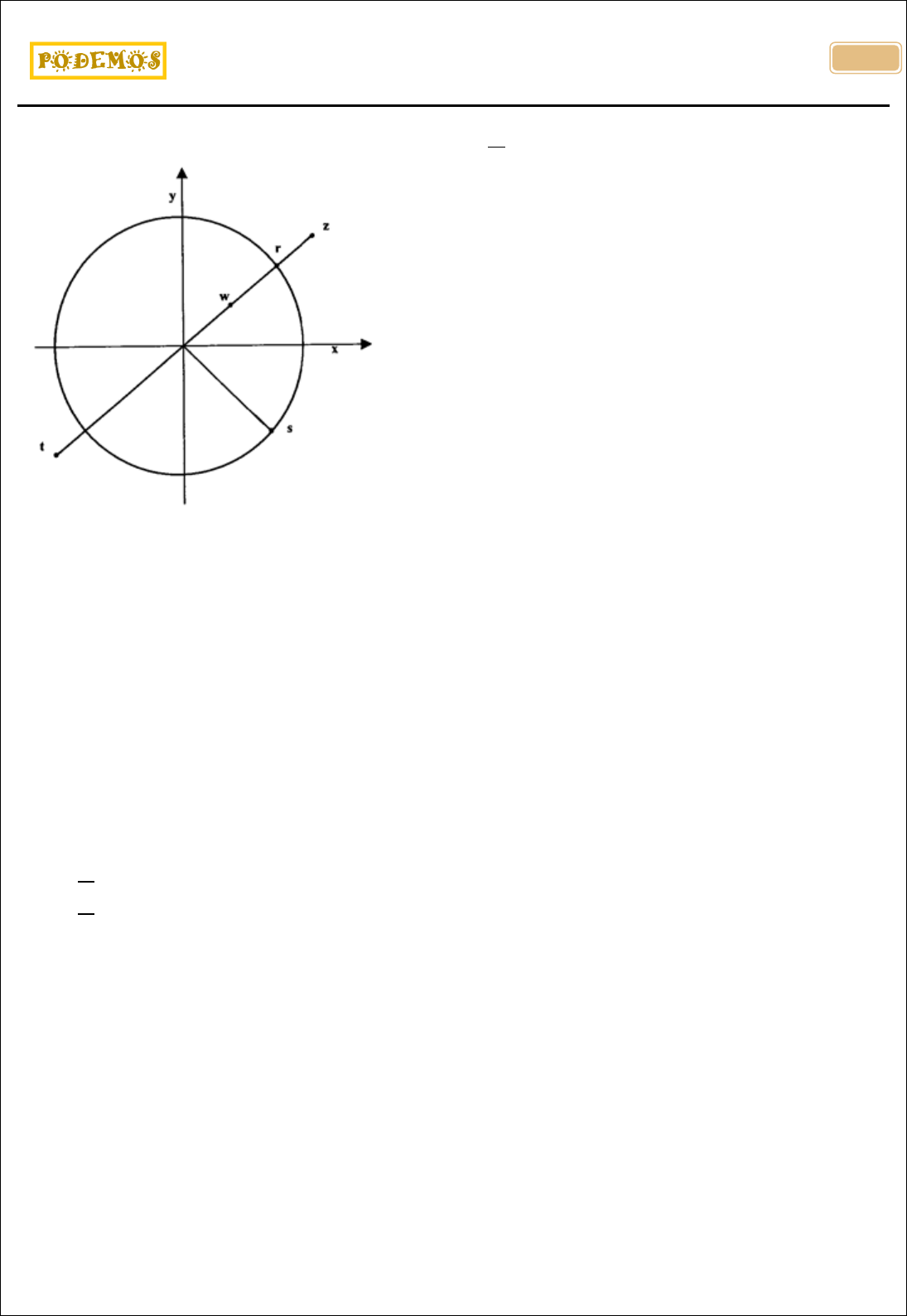 <p>UFJF – Vestibular 1999 – 1ª fase</p><p>Prof. Otávio Luciano Camargo Sales de Magalhães</p><p>.</p><p>31</p><p>15)(Vestibular – UFJF 1999 – 1ª fase) A figura abaixo mostra, no plano complexo, o círculo de raio 1 e os</p><p>afixos de cinco números complexos. O número complexo</p><p>𝑍</p><p>|𝑍|</p><p>é:</p><p>a) w;</p><p>b) r;</p><p>c) s;</p><p>d) t.</p><p>16)(Vestibular – UFJF 1999 – 1ª fase) Considere a matriz 𝐴 = [</p><p>−1 0</p><p>0 1</p><p>]. Então, podemos concluir que:</p><p>a) A100 = – I, onde I é a matriz identidade 2 x 2;</p><p>b) A100 = A;</p><p>c) A101 = A;</p><p>d) A101 = 0, onde 0 é a matriz nula 2 x 2.</p><p>17)(Vestibular – UFJF 1999 – 1ª fase) Seja S o conjunto solução da equação: senx + 2cosx = 3.</p><p>É CORRETO afirmar que:</p><p>a)𝑆 = {</p><p>7𝜋</p><p>8</p><p>}</p><p>b)𝑆 = {</p><p>8𝜋</p><p>10</p><p>}</p><p>c)𝑆 = ℜ</p><p>d)𝑆 = ∅</p><p>18)(Vestibular – UFJF 1999 – 1ª fase) Considere um triângulo de lados a = 5cm, b = 12cm e c = 13cm. É</p><p>CORRETO afirmar que este triângulo possui:</p><p>a) um ângulo reto;</p><p>b) os três ângulos internos agudos;</p><p>c) um ângulo interno obtuso;</p><p>d) dois ângulos internos obtusos.</p>