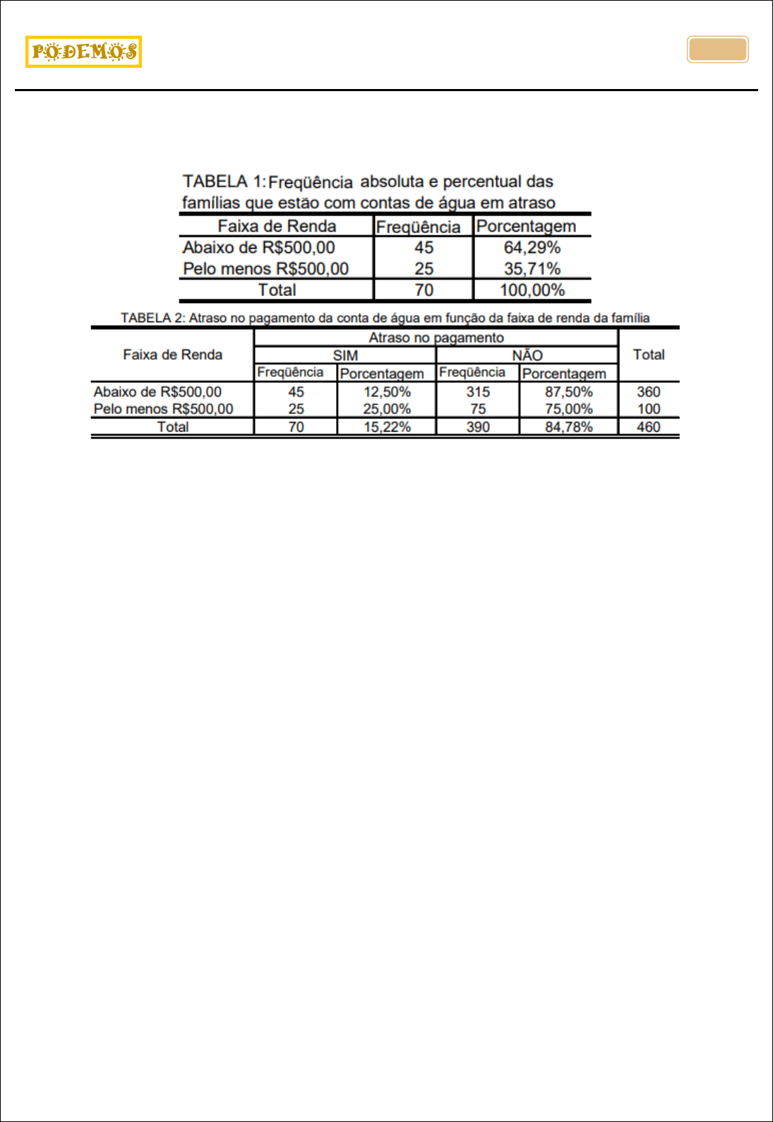<p>UFJF: PISM, Vestibulares e Concursos</p><p>Prof. Otávio Luciano Camargo Sales de Magalhães</p><p>.</p><p>398</p><p>8)(Concurso Público da CESAMA – Assistente Administrativo – 2007 – Banca COPESE/FGV) Em uma</p><p>pesquisa realizada pela empresa, um dos objetivos era verificar alguns fatores associados ao atraso no</p><p>pagamento da conta de água.</p><p>Considerando-se os dados da TABELA 2, pode-se afirmar:</p><p>a) Que o número de famílias com pagamento atrasado das contas é proporcionalmente MAIOR entre as</p><p>famílias de RENDA INFERIOR a R$500,00, visto que elas são 45 das 70 famílias com contas em atraso.</p><p>b) Que o número de famílias com pagamento atrasado das contas é proporcionalmente MENOR entre as</p><p>famílias de RENDA INFERIOR a R$500,00, visto que, das 360 nesta faixa de renda, apenas 12,50% têm</p><p>contas em atraso.</p><p>c) Que o número de famílias com pagamento atrasado das contas é proporcionalmente MAIOR entre</p><p>aquelas de RENDA INFERIOR a R$500,00, visto que, das famílias dessa faixa de renda, 12,50% estão com</p><p>contas em atraso ao passo que, das famílias de renda mais elevada, 25,00% estão em atraso.</p><p>d) Que o número de famílias com pagamento atrasado das contas é proporcionalmente MENOR entre as</p><p>famílias de RENDA SUPERIOR a R$500,00, visto que elas são 75 das 390 famílias que não têm contas em</p><p>atraso.</p><p>e) Nada se pode afirmar.</p>
