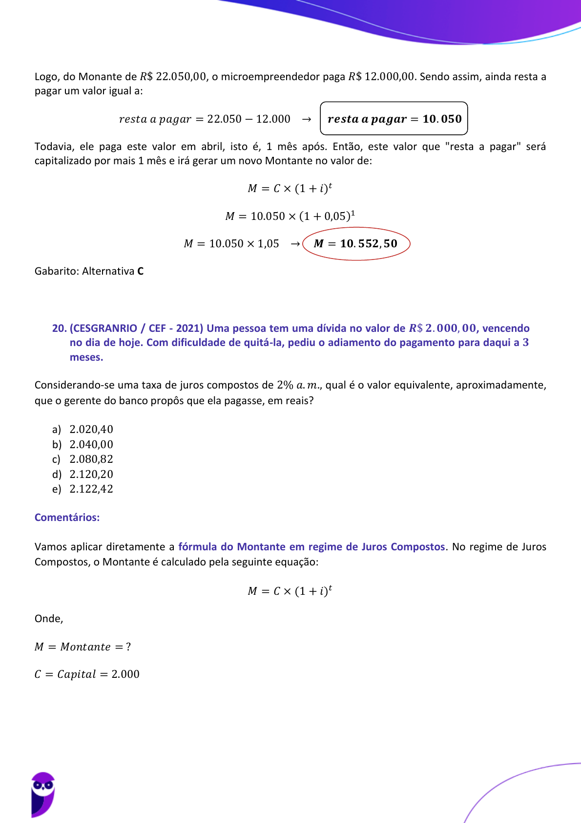 <p>28</p><p>Logo, do Monante de 𝑅$ 22.050,00, o microempreendedor paga 𝑅$ 12.000,00. Sendo assim, ainda resta a</p><p>pagar um valor igual a:</p><p>𝑟𝑒𝑠𝑡𝑎 𝑎 𝑝𝑎𝑔𝑎𝑟 = 22.050 − 12.000 → 𝒓𝒆𝒔𝒕𝒂 𝒂 𝒑𝒂𝒈𝒂𝒓 = 𝟏𝟎. 𝟎𝟓𝟎</p><p>Todavia, ele paga este valor em abril, isto é, 1 mês após. Então, este valor que "resta a pagar" será</p><p>capitalizado por mais 1 mês e irá gerar um novo Montante no valor de:</p><p>𝑀 = 𝐶 × (1 + 𝑖)𝑡</p><p>𝑀 = 10.050 × (1 + 0,05)1</p><p>𝑀 = 10.050 × 1,05 → 𝑴 = 𝟏𝟎. 𝟓𝟓𝟐, 𝟓𝟎</p><p>Gabarito: Alternativa C</p><p>20. (CESGRANRIO / CEF - 2021) Uma pessoa tem uma dívida no valor de 𝑹$ 𝟐. 𝟎𝟎𝟎, 𝟎𝟎, vencendo</p><p>no dia de hoje. Com dificuldade de quitá-la, pediu o adiamento do pagamento para daqui a 𝟑</p><p>meses.</p><p>Considerando-se uma taxa de juros compostos de 2% 𝑎. 𝑚., qual é o valor equivalente, aproximadamente,</p><p>que o gerente do banco propôs que ela pagasse, em reais?</p><p>a) 2.020,40</p><p>b) 2.040,00</p><p>c) 2.080,82</p><p>d) 2.120,20</p><p>e) 2.122,42</p><p>Comentários:</p><p>Vamos aplicar diretamente a fórmula do Montante em regime de Juros Compostos. No regime de Juros</p><p>Compostos, o Montante é calculado pela seguinte equação:</p><p>𝑀 = 𝐶 × (1 + 𝑖)𝑡</p><p>Onde,</p><p>𝑀 = 𝑀𝑜𝑛𝑡𝑎𝑛𝑡𝑒 = ?</p><p>𝐶 = 𝐶𝑎𝑝𝑖𝑡𝑎𝑙 = 2.000</p><p>Equipe Exatas Estratégia Concursos</p><p>Aula 01</p><p>PETROBRAS (Engenharia de Produção) Matemática Financeira - 2023 (Pré-Edital)</p><p>www.estrategiaconcursos.com.br</p><p>- Masterconcursos.com -Agradecemos a preferência</p><p>80</p><p>250</p>