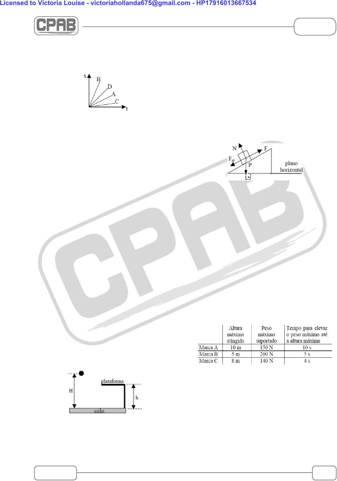 <p>Física</p><p>233</p><p>233</p><p>EEAr</p><p>208. (EEAR – 2007-2) Quatro objetos, de mesma</p><p>massa, apresentam movimentos descritos pelas curvas</p><p>A, B, C e D do gráfico. Para um determinado instante t,</p><p>o valor da energia cinética de cada objeto, ordenada de</p><p>forma crescente, é:</p><p>A) A, B, C e D</p><p>B) B, D, A e C</p><p>C) C, A, D e B</p><p>D) A, D, C e B</p><p>209. (EEAR – 2016-2) Um garoto com um estilingue</p><p>tenta acertar um alvo a alguns metros de distância.</p><p>(1) Primeiramente ele segura o estilingue com a pedra</p><p>a ser arremessada, esticando o elástico propulsor.</p><p>(2) Em seguida ele solta o elástico com a pedra.</p><p>(3) A pedra voa, subindo a grande altura.</p><p>(4) Na queda a pedra acerta o alvo com grande</p><p>violência.</p><p>Assinale os trechos do texto correspondentes às</p><p>análises físicas das energias, colocando a numeração</p><p>correspondente.</p><p>( ) Conversão da energia potencial elástica em energia</p><p>cinética.</p><p>( ) Energia cinética se convertendo em energia potencial</p><p>gravitacional.</p><p>( ) Energia potencial gravitacional se convertendo em</p><p>energia cinética.</p><p>( ) Usando a força para estabelecer a energia potencial</p><p>elástica.</p><p>A sequência que preenche corretamente os parênteses</p><p>é:</p><p>A) 1 – 2 – 3 – 4</p><p>B) 2 – 3 – 4 – 1</p><p>C) 3 – 4 – 1 – 2</p><p>D) 4 – 1 – 2 – 3</p><p>210. (EEAR – 2009-2) Um corpo de massa m está a uma</p><p>altura H em relação ao solo. Considerando uma</p><p>plataforma de altura h em relação ao solo, conforme a</p><p>figura, podemos afirmar, corretamente, que a energia</p><p>potencial gravitacional do copo, em relação à</p><p>plataforma, é dada por</p><p>A) mg (H-h)</p><p>B) mg (h + H)</p><p>C) mgh</p><p>D) mgH</p><p>211. (EEAR – 2011-2) Um disco de massa igual a 2,0</p><p>kg está em movimento retilíneo sobre uma superfície</p><p>horizontal com velocidade igual a 8,0 m/s, quando sua</p><p>velocidade gradativamente reduz para 4,0 m/s.</p><p>Determine o trabalho, em J, realizado pela força</p><p>resistente nesta situação.</p><p>A) – 48.</p><p>B) – 60.</p><p>C) + 60.</p><p>D) + 100.</p><p>212. (BCT ME – 2010)Considere um bloco subindo um</p><p>plano inclinado que oferece atrito. De todas as forças</p><p>que atuam no bloco quantas não realizam trabalho?</p><p>A) 1</p><p>B) 2</p><p>C) 3</p><p>D) 4</p><p>213. (BCT ME – 2012)Um guindaste eleva uma carga</p><p>de 3.103kg a uma altura de 12 m em 40 s. Se esse</p><p>guindaste fosse substituído por outro, com o dobro da</p><p>potência média, qual seria o tempo gasto para realizar</p><p>o mesmo trabalho? (considere g = 10 m/s2 e despreze</p><p>as perdas)</p><p>A) 10 s</p><p>B) 15 s</p><p>C) 20 s</p><p>D) 30 s</p><p>214. (BCT ME – 2011) Desejando comprar uma</p><p>empilhadeira um engenheiro obtém as seguintes</p><p>informações técnicas de três marcas A, B e C</p><p>diferentes:</p><p>Utilizando como critério para a escolha a empilhadeira</p><p>de maior potência e, considerando que as três marcas</p><p>de empilhadeira operam com velocidade constante, o</p><p>engenheiro deverá escolher a:</p><p>A) marca A</p><p>B) marca B</p><p>C) marca C</p><p>D) qualquer uma das marcas, pois as três possuem</p><p>a mesma potência.</p><p>Licensed to Victoria Louise - victoriahollanda675@gmail.com - HP17916013667534</p>
