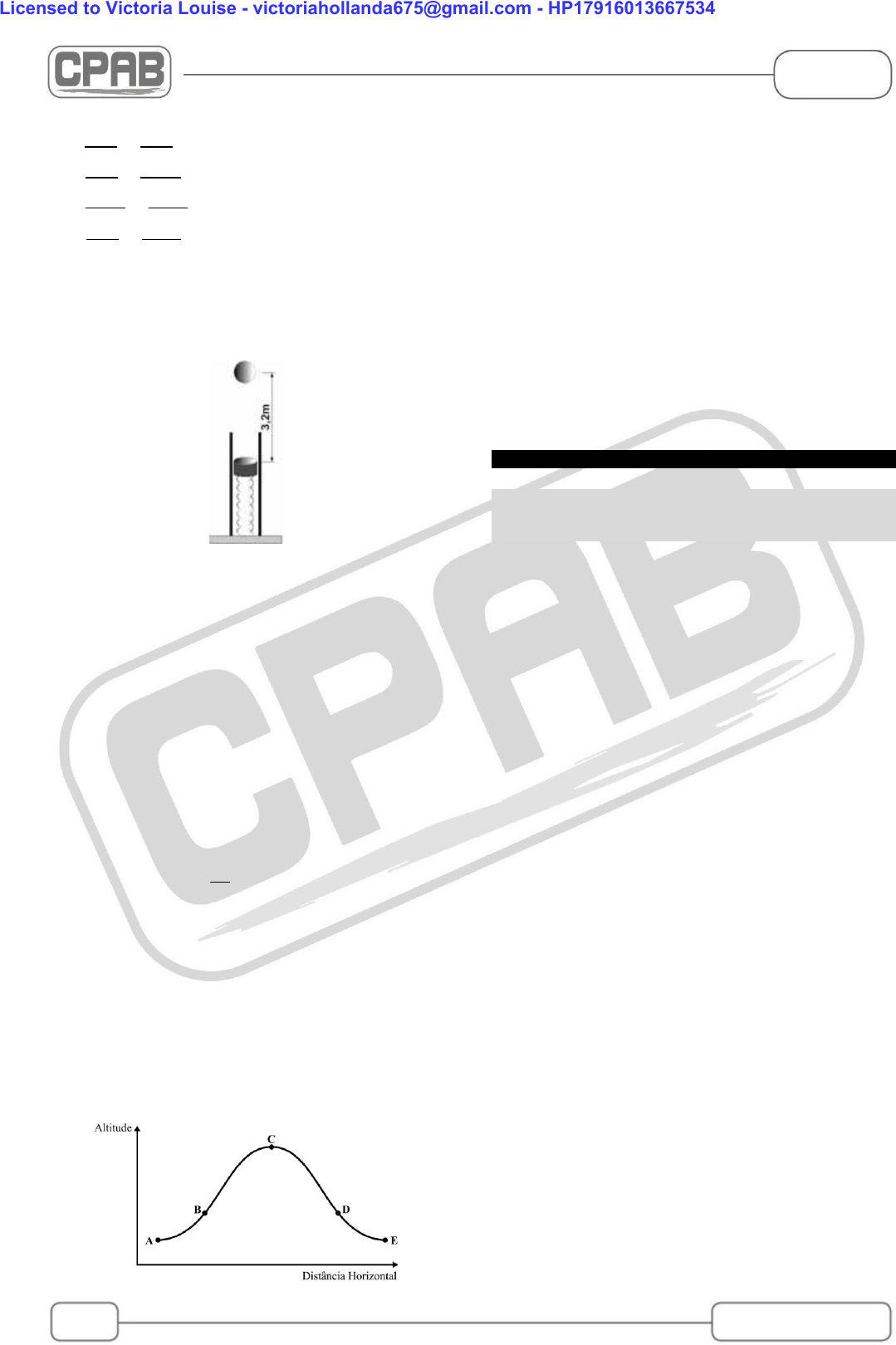 <p>Física</p><p>236</p><p>236</p><p>COLETÂNEA DE PROVAS</p><p>2 – o módulo da gravidade local (g) é constante.</p><p>A)</p><p>𝑚 .𝑣02</p><p>2</p><p>=</p><p>𝑚 .𝑣02</p><p>2</p><p>+ 𝑚 . 𝑔 . ℎ</p><p>B)</p><p>𝑚 .𝑣02</p><p>2</p><p>=</p><p>𝑚 .𝑣0𝑦2</p><p>2</p><p>+ 𝑚 . 𝑔 . ℎ</p><p>C)</p><p>𝑚 .𝑣0𝑦2</p><p>2</p><p>=</p><p>𝑚 .𝑣0𝑥2</p><p>2</p><p>+ 𝑚 . 𝑔 . ℎ</p><p>D)</p><p>𝑚 .𝑣02</p><p>2</p><p>=</p><p>𝑚 .𝑣0𝑥2</p><p>2</p><p>+ 𝑚 . 𝑔 . ℎ</p><p>229. (EEAR - 2017.1) Uma esfera de 5 kg cai de uma</p><p>altura de 3,2 metros sobre</p><p>um dispositivo provido de uma mola de constante</p><p>elástica 40N/m para amortecer sua queda, como</p><p>mostra a figura.</p><p>Adotando g = 10 m/s2 e desprezando o atrito no</p><p>sistema, pode-se afirmar que a velocidade (v) que a</p><p>esfera atinge o mecanismo, em m/s, e a contração da</p><p>mola (x), em metros, valem:</p><p>A) v = 8; x = 2</p><p>B) v = 16; x = 2</p><p>C) v = 8; x = 2 2</p><p>D) v = 16; x = 2 2</p><p>230.(EEAr – 2020.2) Um professor cronometra o tempo</p><p>“𝑡𝑠” que um objeto (considerado um ponto material)</p><p>lançado a partir do solo, verticalmente para cima e com</p><p>uma velocidade inicial, leva para realizar um</p><p>deslocamento ∆𝑥𝑆até atingir a altura máxima. Em</p><p>seguida, o professor mede, em relação à altura máxima,</p><p>o deslocamento de descida ∆𝑥𝐷 ocorrido em um</p><p>intervalo de tempo igual a 1/4 de “𝑡𝑠” cronometrado</p><p>inicialmente. A razão</p><p>∆𝑥𝑆</p><p>∆𝑥𝐷</p><p>é igual a ______. Considere o</p><p>módulo da aceleração da gravidade constante e que,</p><p>durante todo o movimento do objeto, não há nenhum</p><p>tipo de atrito.</p><p>A) 2</p><p>B) 4</p><p>C) 8</p><p>D) 16</p><p>231.(EEAr – 2020.2) Uma empresa europeia realiza</p><p>voos com o objetivo de simular a ausência de gravidade</p><p>para uma pessoa que está dentro do avião. Um voo</p><p>típico dessa simulação está representado a seguir:</p><p>O avião atinge uma determinada altitude (ponto A) e a</p><p>partir dela aumenta sua velocidade sob uma aceleração</p><p>de 2 vezes o módulo da aceleração da gravidade.</p><p>Próximo de atingir o ponto B, o avião diminui o módulo</p><p>da força produzida pelo motor até se igualar a</p><p>resistência do ar e, a partir do ponto B, inicia um</p><p>lançamento oblíquo até D.</p><p>Uma vez que a pessoa não está presa a nenhuma parte</p><p>do avião e que também realiza um lançamento oblíquo</p><p>com a mesma velocidade inicial do avião a partir de B,</p><p>pode-se afirmar corretamente que o módulo da força</p><p>normal do piso do avião contra a força peso da pessoa</p><p>no trecho de B a D é ______.</p><p>A) igual a zero.</p><p>B) igual a força peso que atua na pessoa.</p><p>C) maior que a força peso que atua na pessoa.</p><p>D) menor que a força peso que atua na pessoa.</p><p>IMPULSO E QUANTIDADE DE MOVIMENTO</p><p>IMPULSO, QUANTIDADE DE MOVIMENTO,</p><p>COLISÕES, CONSERVAÇÃO DA QUANTIDADE DE</p><p>MOVIMENTO</p><p>232. (EEAR – 2007-1)Atualmente, os carros são feitos</p><p>com materiais deformáveis de maneira que, em caso de</p><p>colisões, para uma mesma variação da quantidade de</p><p>movimento linear do carro, a força que o cinto exerce</p><p>sobre os passageiros seja _____ devido ao _____</p><p>intervalo de tempo durante o impacto.</p><p>A) maior; maior</p><p>B) menor; menor</p><p>C) menor; maior</p><p>D) maior; menor</p><p>233.(EEAR – 2008) Uma pequena aeronave, de massa</p><p>igual a 1500 kg, movimenta-se, em uma pista retilínea,</p><p>com uma velocidade constante de 20 m/s, em relação</p><p>a torre de controle (referencial inercial). Quando o piloto</p><p>decide parar a aeronave faz acionar o sistema de freio</p><p>que aplica uma força constante de 1000 N, na mesma</p><p>direção e em sentido contrário ao do movimento.</p><p>Quanto tempo, em segundos, aeronave levará para</p><p>parar completamente?</p><p>A) 5</p><p>B) 15</p><p>C) 30</p><p>D) 60</p><p>234. (EEAR – 2010-2) Um soldado lança verticalmente</p><p>para cima uma granada que é detonada ao atingir a</p><p>altura máxima. Considerando que a granada, após a</p><p>explosão seja um sistema isolado, pode se afirmar que</p><p>A) Os fragmentos da granada movem-se todos na</p><p>vertical</p><p>B) Os fragmentos da granada movem-se todos na</p><p>horizontal</p><p>C) A soma vetorial da quantidade de movimento de</p><p>todos os fragmentos da granada é diferente de zero</p><p>D) A soma vetorial da quantidade de movimento de</p><p>todos os fragmentos da granada é igual de zero</p><p>Licensed to Victoria Louise - victoriahollanda675@gmail.com - HP17916013667534</p>
