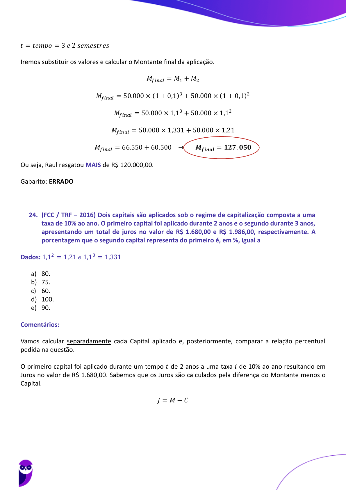 <p>34</p><p>𝑡 = 𝑡𝑒𝑚𝑝𝑜 = 3 𝑒 2 𝑠𝑒𝑚𝑒𝑠𝑡𝑟𝑒𝑠</p><p>Iremos substituir os valores e calcular o Montante final da aplicação.</p><p>𝑀𝑓𝑖𝑛𝑎𝑙 = 𝑀1 + 𝑀2</p><p>𝑀𝑓𝑖𝑛𝑎𝑙 = 50.000 × (1 + 0,1)3 + 50.000 × (1 + 0,1)2</p><p>𝑀𝑓𝑖𝑛𝑎𝑙 = 50.000 × 1,13 + 50.000 × 1,12</p><p>𝑀𝑓𝑖𝑛𝑎𝑙 = 50.000 × 1,331 + 50.000 × 1,21</p><p>𝑀𝑓𝑖𝑛𝑎𝑙 = 66.550 + 60.500 → 𝑴𝒇𝒊𝒏𝒂𝒍 = 𝟏𝟐𝟕. 𝟎𝟓𝟎</p><p>Ou seja, Raul resgatou MAIS de R$ 120.000,00.</p><p>Gabarito: ERRADO</p><p>24. (FCC / TRF – 2016) Dois capitais são aplicados sob o regime de capitalização composta a uma</p><p>taxa de 10% ao ano. O primeiro capital foi aplicado durante 2 anos e o segundo durante 3 anos,</p><p>apresentando um total de juros no valor de R$ 1.680,00 e R$ 1.986,00, respectivamente. A</p><p>porcentagem que o segundo capital representa do primeiro é, em %, igual a</p><p>Dados: 1,12 = 1,21 𝑒 1,13 = 1,331</p><p>a) 80.</p><p>b) 75.</p><p>c) 60.</p><p>d) 100.</p><p>e) 90.</p><p>Comentários:</p><p>Vamos calcular separadamente cada Capital aplicado e, posteriormente, comparar a relação percentual</p><p>pedida na questão.</p><p>O primeiro capital foi aplicado durante um tempo 𝑡 de 2 anos a uma taxa 𝑖 de 10% ao ano resultando em</p><p>Juros no valor de R$ 1.680,00. Sabemos que os Juros são calculados pela diferença do Montante menos o</p><p>Capital.</p><p>𝐽 = 𝑀 − 𝐶</p><p>Equipe Exatas Estratégia Concursos</p><p>Aula 01</p><p>PETROBRAS (Engenharia de Produção) Matemática Financeira - 2023 (Pré-Edital)</p><p>www.estrategiaconcursos.com.br</p><p>- Masterconcursos.com -Agradecemos a preferência</p><p>86</p><p>250</p>