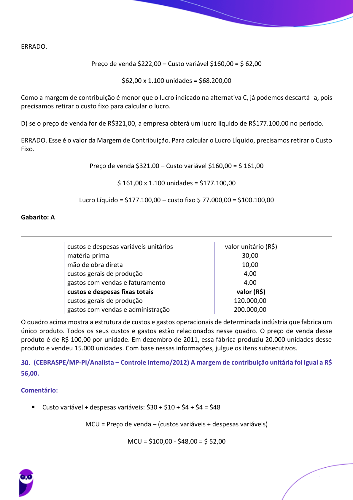 <p>ERRADO.</p><p>Preço de venda $222,00 – Custo variável $160,00 = $ 62,00</p><p>$62,00 x 1.100 unidades = $68.200,00</p><p>Como a margem de contribuição é menor que o lucro indicado na alternativa C, já podemos descartá-la, pois</p><p>precisamos retirar o custo fixo para calcular o lucro.</p><p>D) se o preço de venda for de R$321,00, a empresa obterá um lucro líquido de R$177.100,00 no período.</p><p>ERRADO. Esse é o valor da Margem de Contribuição. Para calcular o Lucro Líquido, precisamos retirar o Custo</p><p>Fixo.</p><p>Preço de venda $321,00 – Custo variável $160,00 = $ 161,00</p><p>$ 161,00 x 1.100 unidades = $177.100,00</p><p>Lucro Líquido = $177.100,00 – custo fixo $ 77.000,00 = $100.100,00</p><p>Gabarito: A</p><p>custos e despesas variáveis unitários valor unitário (R$)</p><p>matéria-prima 30,00</p><p>mão de obra direta 10,00</p><p>custos gerais de produção 4,00</p><p>gastos com vendas e faturamento 4,00</p><p>custos e despesas fixas totais valor (R$)</p><p>custos gerais de produção 120.000,00</p><p>gastos com vendas e administração 200.000,00</p><p>O quadro acima mostra a estrutura de custos e gastos operacionais de determinada indústria que fabrica um</p><p>único produto. Todos os seus custos e gastos estão relacionados nesse quadro. O preço de venda desse</p><p>produto é de R$ 100,00 por unidade. Em dezembro de 2011, essa fábrica produziu 20.000 unidades desse</p><p>produto e vendeu 15.000 unidades. Com base nessas informações, julgue os itens subsecutivos.</p><p>(CEBRASPE/MP-PI/Analista – Controle Interno/2012) A margem de contribuição unitária foi igual a R$</p><p>56,00.</p><p>Comentário:</p><p>▪ Custo variável + despesas variáveis: $30 + $10 + $4 + $4 = $48</p><p>MCU = Preço de venda – (custos variáveis + despesas variáveis)</p><p>MCU = $100,00 - $48,00 = $ 52,00</p><p>Luciano Rosa, Júlio Cardozo</p><p>Aula 05</p><p>SEFAZ-MG (Auditor Fiscal - área Auditoria e Fiscalização) Contabilidade de Custos - 2022 (Pós-Edital) (Prof Julio e Luciano)</p><p>www.estrategiaconcursos.com.br</p><p>68857100346813379 - Naiara Braz Sidrim Nogueira</p><p>41</p><p>200</p><p>==a81bb==</p>