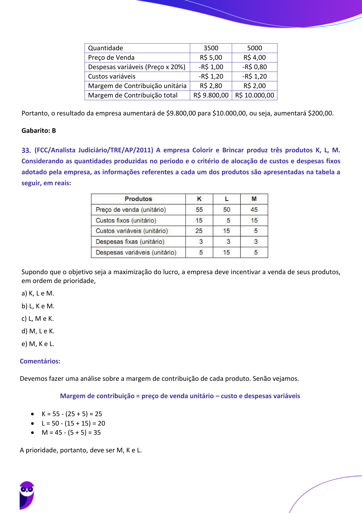 <p>Quantidade 3500 5000</p><p>Preço de Venda R$ 5,00 R$ 4,00</p><p>Despesas variáveis (Preço x 20%) -R$ 1,00 -R$ 0,80</p><p>Custos variáveis -R$ 1,20 -R$ 1,20</p><p>Margem de Contribuição unitária R$ 2,80 R$ 2,00</p><p>Margem de Contribuição total R$ 9.800,00 R$ 10.000,00</p><p>Portanto, o resultado da empresa aumentará de $9.800,00 para $10.000,00, ou seja, aumentará $200,00.</p><p>Gabarito: B</p><p>(FCC/Analista Judiciário/TRE/AP/2011) A empresa Colorir e Brincar produz três produtos K, L, M.</p><p>Considerando as quantidades produzidas no período e o critério de alocação de custos e despesas fixos</p><p>adotado pela empresa, as informações referentes a cada um dos produtos são apresentadas na tabela a</p><p>seguir, em reais:</p><p>Supondo que o objetivo seja a maximização do lucro, a empresa deve incentivar a venda de seus produtos,</p><p>em ordem de prioridade,</p><p>a) K, L e M.</p><p>b) L, K e M.</p><p>c) L, M e K.</p><p>d) M, L e K.</p><p>e) M, K e L.</p><p>Comentários:</p><p>Devemos fazer uma análise sobre a margem de contribuição de cada produto. Senão vejamos.</p><p>Margem de contribuição = preço de venda unitário – custo e despesas variáveis</p><p>• K = 55 - (25 + 5) = 25</p><p>• L = 50 - (15 + 15) = 20</p><p>• M = 45 - (5 + 5) = 35</p><p>A prioridade, portanto, deve ser M, K e L.</p><p>Luciano Rosa, Júlio Cardozo</p><p>Aula 05</p><p>SEFAZ-MG (Auditor Fiscal - área Auditoria e Fiscalização) Contabilidade de Custos - 2022 (Pós-Edital) (Prof Julio e Luciano)</p><p>www.estrategiaconcursos.com.br</p><p>68857100346813379 - Naiara Braz Sidrim Nogueira</p><p>43</p><p>200</p>