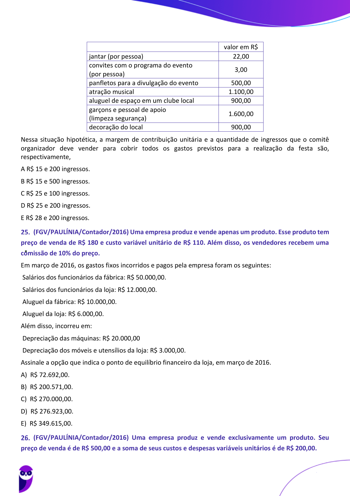 <p>valor em R$</p><p>jantar (por pessoa) 22,00</p><p>convites com o programa do evento</p><p>(por pessoa)</p><p>3,00</p><p>panfletos para a divulgação do evento 500,00</p><p>atração musical 1.100,00</p><p>aluguel de espaço em um clube local 900,00</p><p>garçons e pessoal de apoio</p><p>(limpeza segurança)</p><p>1.600,00</p><p>decoração do local 900,00</p><p>Nessa situação hipotética, a margem de contribuição unitária e a quantidade de ingressos que o comitê</p><p>organizador deve vender para cobrir todos os gastos previstos para a realização da festa são,</p><p>respectivamente,</p><p>A R$ 15 e 200 ingressos.</p><p>B R$ 15 e 500 ingressos.</p><p>C R$ 25 e 100 ingressos.</p><p>D R$ 25 e 200 ingressos.</p><p>E R$ 28 e 200 ingressos.</p><p>(FGV/PAULÍNIA/Contador/2016) Uma empresa produz e vende apenas um produto. Esse produto tem</p><p>preço de venda de R$ 180 e custo variável unitário de R$ 110. Além disso, os vendedores recebem uma</p><p>comissão de 10% do preço.</p><p>Em março de 2016, os gastos fixos incorridos e pagos pela empresa foram os seguintes:</p><p>Salários dos funcionários da fábrica: R$ 50.000,00.</p><p>Salários dos funcionários da loja: R$ 12.000,00.</p><p>Aluguel da fábrica: R$ 10.000,00.</p><p>Aluguel da loja: R$ 6.000,00.</p><p>Além disso, incorreu em:</p><p>Depreciação das máquinas: R$ 20.000,00</p><p>Depreciação dos móveis e utensílios da loja: R$ 3.000,00.</p><p>Assinale a opção que indica o ponto de equilíbrio financeiro da loja, em março de 2016.</p><p>A) R$ 72.692,00.</p><p>B) R$ 200.571,00.</p><p>C) R$ 270.000,00.</p><p>D) R$ 276.923,00.</p><p>E) R$ 349.615,00.</p><p>(FGV/PAULÍNIA/Contador/2016) Uma empresa produz e vende exclusivamente um produto. Seu</p><p>preço de venda é de R$ 500,00 e a soma de seus custos e despesas variáveis unitários é de R$ 200,00.</p><p>Luciano Rosa, Júlio Cardozo</p><p>Aula 05</p><p>SEFAZ-MG (Auditor Fiscal - área Auditoria e Fiscalização) Contabilidade de Custos - 2022 (Pós-Edital) (Prof Julio e Luciano)</p><p>www.estrategiaconcursos.com.br</p><p>68857100346813379 - Naiara Braz Sidrim Nogueira</p><p>180</p><p>200</p>