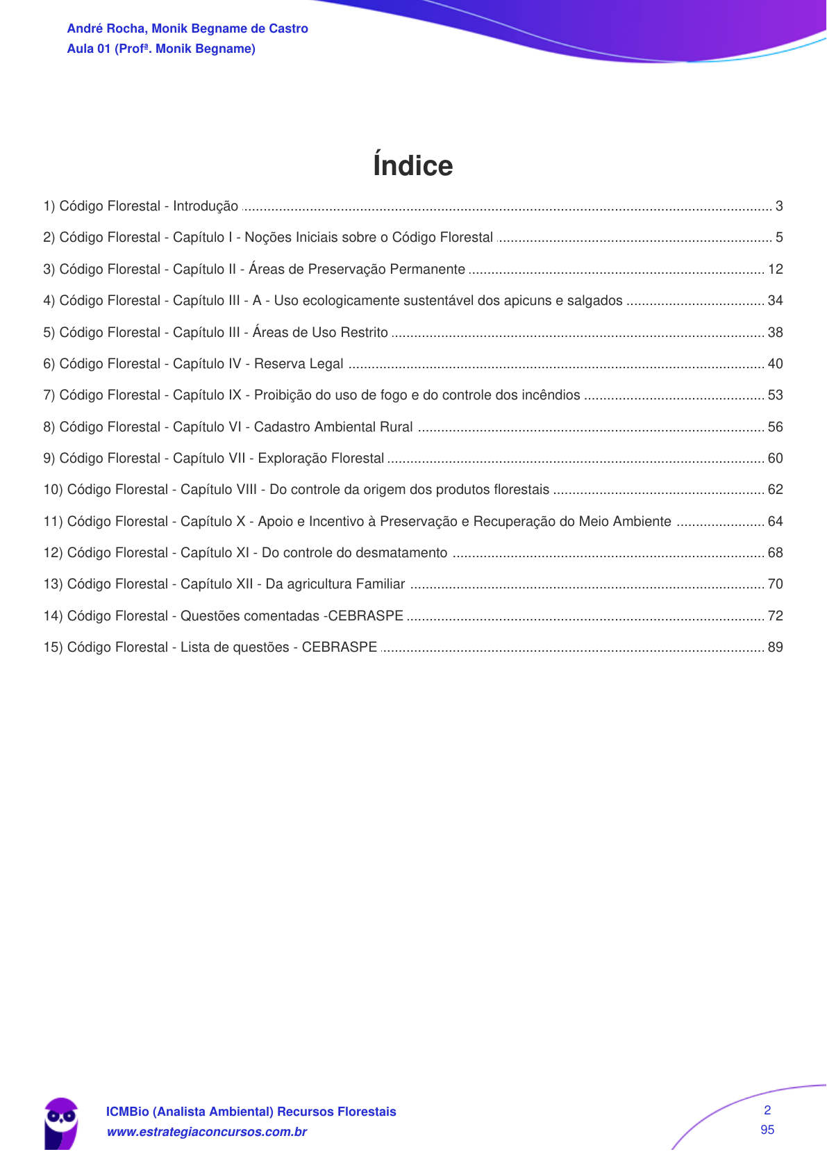 <p>André Rocha, Monik Begname de Castro</p><p>Aula 01 (Profª. Monik Begname)</p><p>Índice</p><p>..............................................................................................................................................................................................1) Código Florestal - Introdução 3</p><p>..............................................................................................................................................................................................2) Código Florestal - Capítulo I - Noções Iniciais sobre o Código Florestal 5</p><p>..............................................................................................................................................................................................3) Código Florestal - Capítulo II - Áreas de Preservação Permanente 12</p><p>..............................................................................................................................................................................................4) Código Florestal - Capítulo III - A - Uso ecologicamente sustentável dos apicuns e salgados 34</p><p>..............................................................................................................................................................................................5) Código Florestal - Capítulo III - Áreas de Uso Restrito 38</p><p>..............................................................................................................................................................................................6) Código Florestal - Capítulo IV - Reserva Legal 40</p><p>..............................................................................................................................................................................................7) Código Florestal - Capítulo IX - Proibição do uso de fogo e do controle dos incêndios 53</p><p>..............................................................................................................................................................................................8) Código Florestal - Capítulo VI - Cadastro Ambiental Rural 56</p><p>..............................................................................................................................................................................................9) Código Florestal - Capítulo VII - Exploração Florestal 60</p><p>..............................................................................................................................................................................................10) Código Florestal - Capítulo VIII - Do controle da origem dos produtos florestais 62</p><p>..............................................................................................................................................................................................11) Código Florestal - Capítulo X - Apoio e Incentivo à Preservação e Recuperação do Meio Ambiente 64</p><p>..............................................................................................................................................................................................12) Código Florestal - Capítulo XI - Do controle do desmatamento 68</p><p>..............................................................................................................................................................................................13) Código Florestal - Capítulo XII - Da agricultura Familiar 70</p><p>..............................................................................................................................................................................................14) Código Florestal - Questões comentadas -CEBRASPE 72</p><p>..............................................................................................................................................................................................15) Código Florestal - Lista de questões - CEBRASPE 89</p><p>ICMBio (Analista Ambiental) Recursos Florestais</p><p>www.estrategiaconcursos.com.br</p><p>2</p><p>95</p><p>Adquira uma Assinatura em @Xinyuu_bot - Telegram</p><p>INTRODUÇÃO</p><p>Olá, Estrategístas! Tudo bem?</p><p>Nesta aula estudaremos o Código Florestal, Lei nº 12.651/2012 e Lei nº 12.727/2012 e suas</p><p>alterações.</p><p>O Código Florestal é uma das leis ambientais mais importante, por isso, com o intuito de ajudá-los,</p><p>fiz um levantamento dos capítulos do código mais cobrados em provas anteriores. Vejam no quadro abaixo</p><p>quais são os capítulos que mais apareceram:</p><p>Lei n° 12.651/2012 (Código Florestal)</p><p>Capítulos N° questões %</p><p>Capítulo I Disposições Gerais (arts. 1° a 3°) 24 18,05</p><p>Capítulo II</p><p>Das Áreas de Preservação Permanente (arts. 4º a</p><p>9º)</p><p>62 46,62</p><p>Capítulo III Das Áreas de Uso Restrito (arts. 10 e 11) 1 0,75</p><p>Capítulo III</p><p>-A</p><p>Do Uso Ecologicamente Sustentável dos Apicuns e</p><p>Salgados (art. 11-A)</p><p>0 0,00</p><p>Capítulo IV Da Área de Reserva Legal (art. 12 a 25) 29 21,80</p><p>Capítulo VI Do Cadastro Ambiental Rural (arts. 29 e 30) 6 4,51</p><p>Capítulo VII Da Exploração Vegetal (arts. 31 a 34) 0 0,00</p><p>Capítulo IX</p><p>Da Proibição do Uso de Fogo e do Controle dos</p><p>Incêndios (arts. 38 a 40)</p><p>2 1,50</p><p>Capítulo X</p><p>Do Programa de Apoio e Incentivo à Pres. e Rec. do</p><p>Meio Amb. (arts. 41 a 50)</p><p>0 0,00</p><p>Capítulo XII Da Agricultura Familiar (arts. 52 a 58) 2 1,50</p><p>Capítulo</p><p>XIII</p><p>Disposições Transitórias (arts. 59 a 68) 7 5,26</p><p>Total 133 100%</p><p>Note que os capítulos I, II e IV, Disposições Gerais, Área de Preservação Permanente e Área de</p><p>Reserva Legal, respectivamente, foram os que tiveram maior incidência. Esses três c
