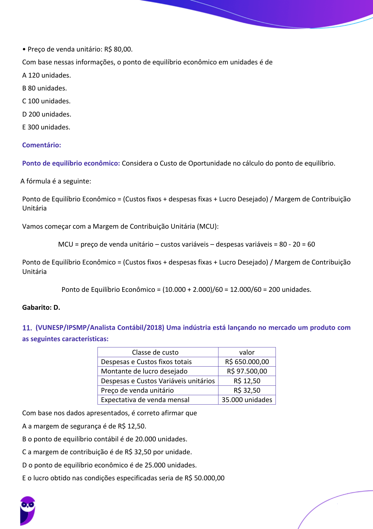 <p>• Preço de venda unitário: R$ 80,00.</p><p>Com base nessas informações, o ponto de equilíbrio econômico em unidades é de</p><p>A 120 unidades.</p><p>B 80 unidades.</p><p>C 100 unidades.</p><p>D 200 unidades.</p><p>E 300 unidades.</p><p>Comentário:</p><p>Ponto de equilíbrio econômico: Considera o Custo de Oportunidade no cálculo do ponto de equilíbrio.</p><p>A fórmula é a seguinte:</p><p>Ponto de Equilíbrio Econômico = (Custos fixos + despesas fixas + Lucro Desejado) / Margem de Contribuição</p><p>Unitária</p><p>Vamos começar com a Margem de Contribuição Unitária (MCU):</p><p>MCU = preço de venda unitário – custos variáveis – despesas variáveis = 80 - 20 = 60</p><p>Ponto de Equilíbrio Econômico = (Custos fixos + despesas fixas + Lucro Desejado) / Margem de Contribuição</p><p>Unitária</p><p>Ponto de Equilíbrio Econômico = (10.000 + 2.000)/60 = 12.000/60 = 200 unidades.</p><p>Gabarito: D.</p><p>(VUNESP/IPSMP/Analista Contábil/2018) Uma indústria está lançando no mercado um produto com</p><p>as seguintes características:</p><p>Classe de custo valor</p><p>Despesas e Custos fixos totais R$ 650.000,00</p><p>Montante de lucro desejado R$ 97.500,00</p><p>Despesas e Custos Variáveis unitários R$ 12,50</p><p>Preço de venda unitário R$ 32,50</p><p>Expectativa de venda mensal 35.000 unidades</p><p>Com base nos dados apresentados, é correto afirmar que</p><p>A a margem de segurança é de R$ 12,50.</p><p>B o ponto de equilíbrio contábil é de 20.000 unidades.</p><p>C a margem de contribuição é de R$ 32,50 por unidade.</p><p>D o ponto de equilíbrio econômico é de 25.000 unidades.</p><p>E o lucro obtido nas condições especificadas seria de R$ 50.000,00</p><p>Luciano Rosa, Júlio Cardozo</p><p>Aula 05</p><p>SEFAZ-MG (Auditor Fiscal - área Auditoria e Fiscalização) Contabilidade de Custos - 2022 (Pós-Edital) (Prof Julio e Luciano)</p><p>www.estrategiaconcursos.com.br</p><p>68857100346813379 - Naiara Braz Sidrim Nogueira</p><p>78</p><p>200</p>