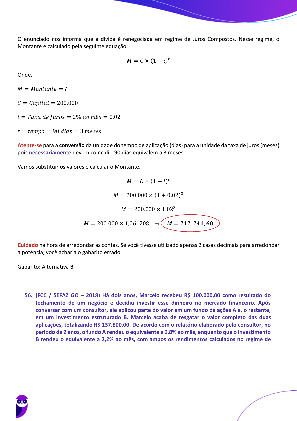 <p>81</p><p>O enunciado nos informa que a dívida é renegociada em regime de Juros Compostos. Nesse regime, o</p><p>Montante é calculado pela seguinte equação:</p><p>𝑀 = 𝐶 × (1 + 𝑖)𝑡</p><p>Onde,</p><p>𝑀 = 𝑀𝑜𝑛𝑡𝑎𝑛𝑡𝑒 = ?</p><p>𝐶 = 𝐶𝑎𝑝𝑖𝑡𝑎𝑙 = 200.000</p><p>𝑖 = 𝑇𝑎𝑥𝑎 𝑑𝑒 𝐽𝑢𝑟𝑜𝑠 = 2% 𝑎𝑜 𝑚ê𝑠 = 0,02</p><p>𝑡 = 𝑡𝑒𝑚𝑝𝑜 = 90 𝑑𝑖𝑎𝑠 = 3 𝑚𝑒𝑠𝑒𝑠</p><p>Atente-se para a conversão da unidade do tempo de aplicação (dias) para a unidade da taxa de juros (meses)</p><p>pois necessariamente devem coincidir. 90 dias equivalem a 3 meses.</p><p>Vamos substituir os valores e calcular o Montante.</p><p>𝑀 = 𝐶 × (1 + 𝑖)𝑡</p><p>𝑀 = 200.000 × (1 + 0,02)3</p><p>𝑀 = 200.000 × 1,023</p><p>𝑀 = 200.000 × 1,061208 → 𝑴 = 𝟐𝟏𝟐. 𝟐𝟒𝟏, 𝟔𝟎</p><p>Cuidado na hora de arredondar as contas. Se você tivesse utilizado apenas 2 casas decimais para arredondar</p><p>a potência, você acharia o gabarito errado.</p><p>Gabarito: Alternativa B</p><p>56. (FCC / SEFAZ GO – 2018) Há dois anos, Marcelo recebeu R$ 100.000,00 como resultado do</p><p>fechamento de um negócio e decidiu investir esse dinheiro no mercado financeiro. Após</p><p>conversar com um consultor, ele aplicou parte do valor em um fundo de ações A e, o restante,</p><p>em um investimento estruturado B. Marcelo acaba de resgatar o valor completo das duas</p><p>aplicações, totalizando R$ 137.800,00. De acordo com o relatório elaborado pelo consultor, no</p><p>período de 2 anos, o fundo A rendeu o equivalente a 0,8% ao mês, enquanto que o investimento</p><p>B rendeu o equivalente a 2,2% ao mês, com ambos os rendimentos calculados no regime de</p><p>Equipe Exatas Estratégia Concursos</p><p>Aula 01</p><p>PETROBRAS (Engenharia de Produção) Matemática Financeira - 2023 (Pré-Edital)</p><p>www.estrategiaconcursos.com.br</p><p>- Masterconcursos.com -Agradecemos a preferência</p><p>133</p><p>250</p>