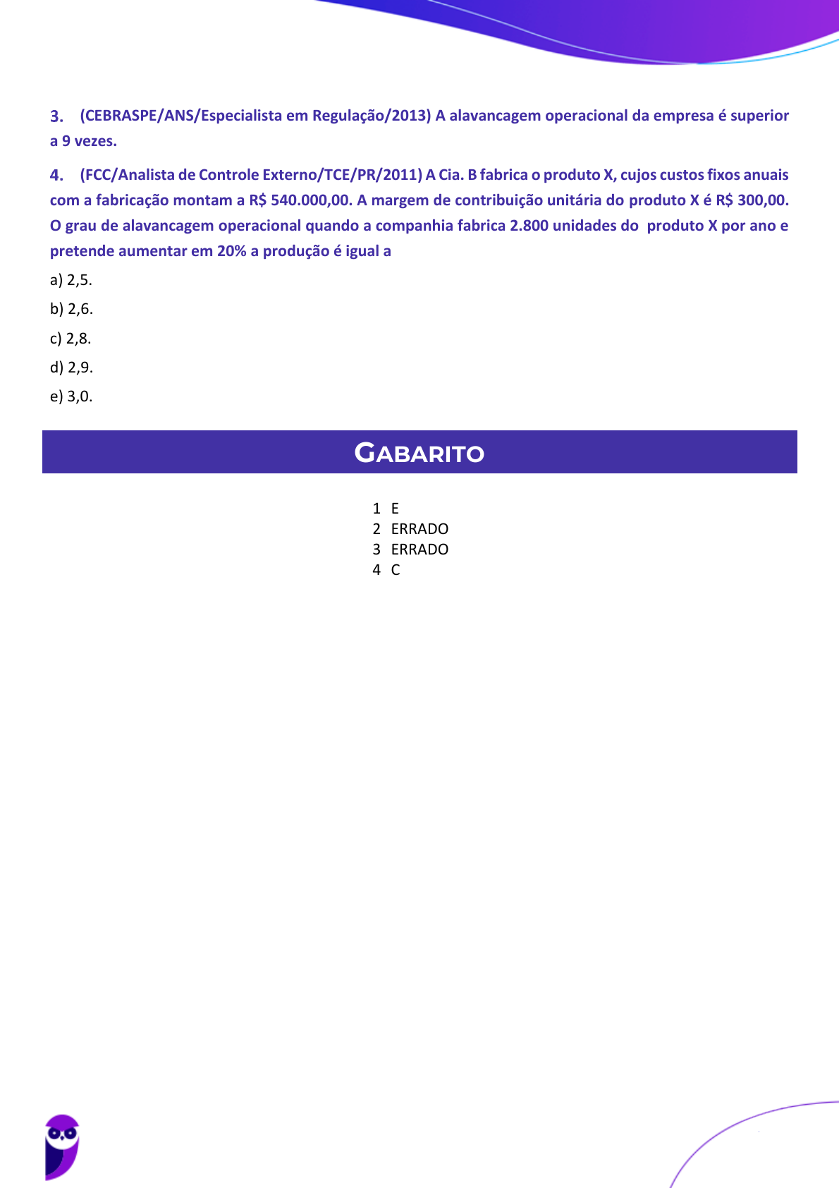 <p>(CEBRASPE/ANS/Especialista em Regulação/2013) A alavancagem operacional da empresa é superior</p><p>a 9 vezes.</p><p>(FCC/Analista de Controle Externo/TCE/PR/2011) A Cia. B fabrica o produto X, cujos custos fixos anuais</p><p>com a fabricação montam a R$ 540.000,00. A margem de contribuição unitária do produto X é R$ 300,00.</p><p>O grau de alavancagem operacional quando a companhia fabrica 2.800 unidades do produto X por ano e</p><p>pretende aumentar em 20% a produção é igual a</p><p>a) 2,5.</p><p>b) 2,6.</p><p>c) 2,8.</p><p>d) 2,9.</p><p>e) 3,0.</p><p>GABARITO</p><p>1 E</p><p>2 ERRADO</p><p>3 ERRADO</p><p>4 C</p><p>Luciano Rosa, Júlio Cardozo</p><p>Aula 05</p><p>SEFAZ-MG (Auditor Fiscal - área Auditoria e Fiscalização) Contabilidade de Custos - 2022 (Pós-Edital) (Prof Julio e Luciano)</p><p>www.estrategiaconcursos.com.br</p><p>68857100346813379 - Naiara Braz Sidrim Nogueira</p><p>199</p><p>200</p><p>==a81bb==</p>