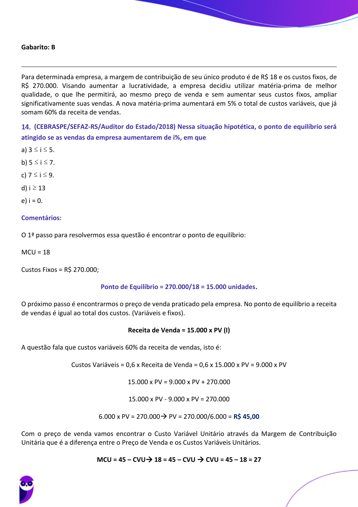 <p>Gabarito: B</p><p>Para determinada empresa, a margem de contribuição de seu único produto é de R$ 18 e os custos fixos, de</p><p>R$ 270.000. Visando aumentar a lucratividade, a empresa decidiu utilizar matéria-prima de melhor</p><p>qualidade, o que lhe permitirá, ao mesmo preço de venda e sem aumentar seus custos fixos, ampliar</p><p>significativamente suas vendas. A nova matéria-prima aumentará em 5% o total de custos variáveis, que já</p><p>somam 60% da receita de vendas.</p><p>(CEBRASPE/SEFAZ-RS/Auditor do Estado/2018) Nessa situação hipotética, o ponto de equilíbrio será</p><p>atingido se as vendas da empresa aumentarem de i%, em que</p><p>a) 3 ≤ i ≤ 5.</p><p>b) 5 ≤ i ≤ 7.</p><p>c) 7 ≤ i ≤ 9.</p><p>d) i ≥ 13</p><p>e) i = 0.</p><p>Comentários:</p><p>O 1ª passo para resolvermos essa questão é encontrar o ponto de equilíbrio:</p><p>MCU = 18</p><p>Custos Fixos = R$ 270.000;</p><p>Ponto de Equilíbrio = 270.000/18 = 15.000 unidades.</p><p>O próximo passo é encontrarmos o preço de venda praticado pela empresa. No ponto de equilíbrio a receita</p><p>de vendas é igual ao total dos custos. (Variáveis e fixos).</p><p>Receita de Venda = 15.000 x PV (I)</p><p>A questão fala que custos variáveis 60% da receita de vendas, isto é:</p><p>Custos Variáveis = 0,6 x Receita de Venda = 0,6 x 15.000 x PV = 9.000 x PV</p><p>15.000 x PV = 9.000 x PV + 270.000</p><p>15.000 x PV - 9.000 x PV = 270.000</p><p>6.000 x PV = 270.000→ PV = 270.000/6.000 = R$ 45,00</p><p>Com o preço de venda vamos encontrar o Custo Variável Unitário através da Margem de Contribuição</p><p>Unitária que é a diferença entre o Preço de Venda e os Custos Variáveis Unitários.</p><p>MCU = 45 – CVU→ 18 = 45 – CVU → CVU = 45 – 18 = 27</p><p>Luciano Rosa, Júlio Cardozo</p><p>Aula 05</p><p>SEFAZ-MG (Auditor Fiscal - área Auditoria e Fiscalização) Contabilidade de Custos - 2022 (Pós-Edital) (Prof Julio e Luciano)</p><p>www.estrategiaconcursos.com.br</p><p>68857100346813379 - Naiara Braz Sidrim Nogueira</p><p>82</p><p>200</p>