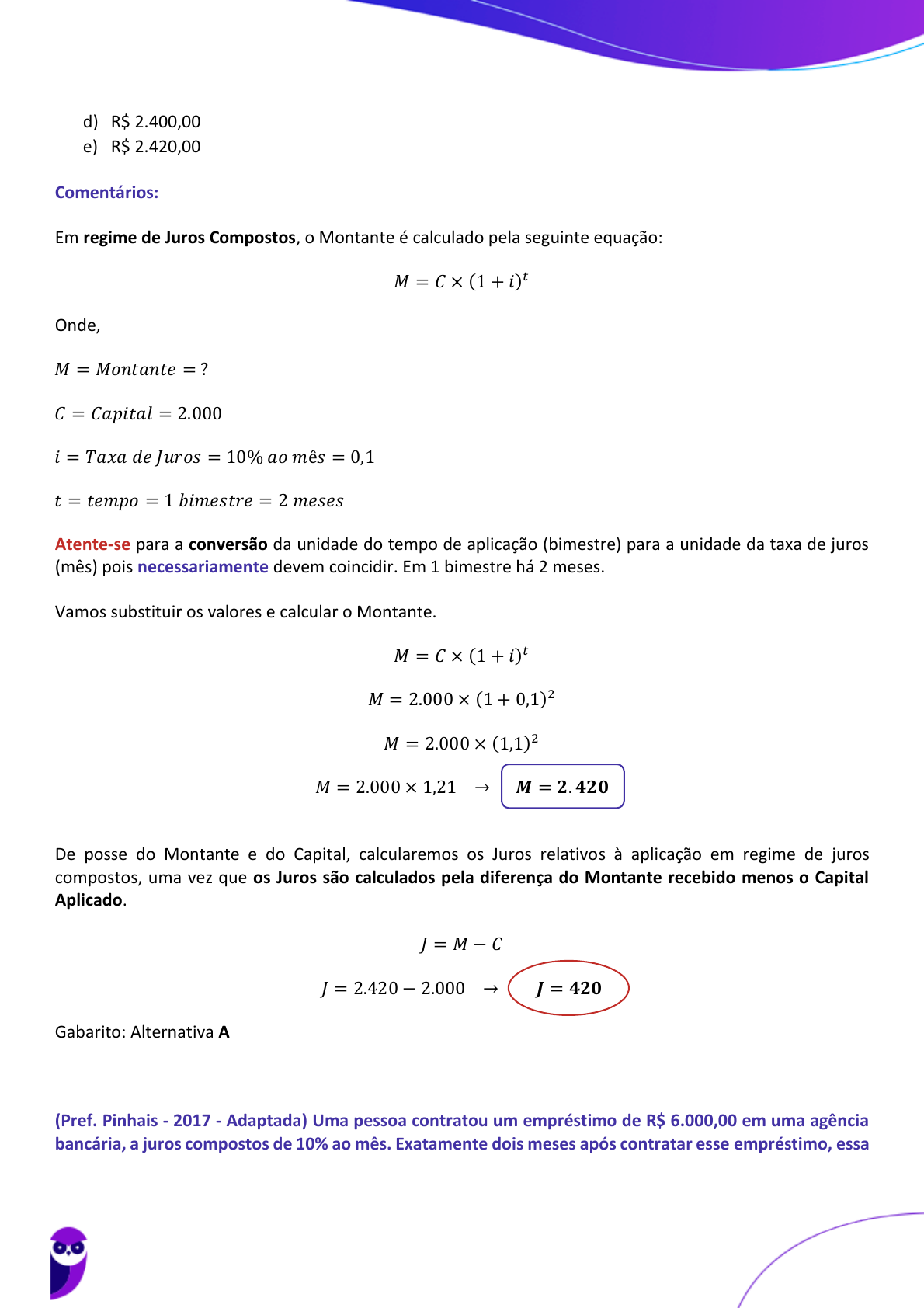 <p>d) R$ 2.400,00</p><p>e) R$ 2.420,00</p><p>Comentários:</p><p>Em regime de Juros Compostos, o Montante é calculado pela seguinte equação:</p><p>𝑀 = 𝐶 × (1 + 𝑖)𝑡</p><p>Onde,</p><p>𝑀 = 𝑀𝑜𝑛𝑡𝑎𝑛𝑡𝑒 = ?</p><p>𝐶 = 𝐶𝑎𝑝𝑖𝑡𝑎𝑙 = 2.000</p><p>𝑖 = 𝑇𝑎𝑥𝑎 𝑑𝑒 𝐽𝑢𝑟𝑜𝑠 = 10% 𝑎𝑜 𝑚ê𝑠 = 0,1</p><p>𝑡 = 𝑡𝑒𝑚𝑝𝑜 = 1 𝑏𝑖𝑚𝑒𝑠𝑡𝑟𝑒 = 2 𝑚𝑒𝑠𝑒𝑠</p><p>Atente-se para a conversão da unidade do tempo de aplicação (bimestre) para a unidade da taxa de juros</p><p>(mês) pois necessariamente devem coincidir. Em 1 bimestre há 2 meses.</p><p>Vamos substituir os valores e calcular o Montante.</p><p>𝑀 = 𝐶 × (1 + 𝑖)𝑡</p><p>𝑀 = 2.000 × (1 + 0,1)2</p><p>𝑀 = 2.000 × (1,1)2</p><p>𝑀 = 2.000 × 1,21 → 𝑴 = 𝟐. 𝟒𝟐𝟎</p><p>De posse do Montante e do Capital, calcularemos os Juros relativos à aplicação em regime de juros</p><p>compostos, uma vez que os Juros são calculados pela diferença do Montante recebido menos o Capital</p><p>Aplicado.</p><p>𝐽 = 𝑀 − 𝐶</p><p>𝐽 = 2.420 − 2.000 → 𝑱 = 𝟒𝟐𝟎</p><p>Gabarito: Alternativa A</p><p>(Pref. Pinhais - 2017 - Adaptada) Uma pessoa contratou um empréstimo de R$ 6.000,00 em uma agência</p><p>bancária, a juros compostos de 10% ao mês. Exatamente dois meses após contratar esse empréstimo, essa</p><p>Equipe Exatas Estratégia Concursos</p><p>Aula 01</p><p>PETROBRAS (Engenharia de Produção) Matemática Financeira - 2023 (Pré-Edital)</p><p>www.estrategiaconcursos.com.br</p><p>- Masterconcursos.com -Agradecemos a preferência</p><p>13</p><p>250</p>