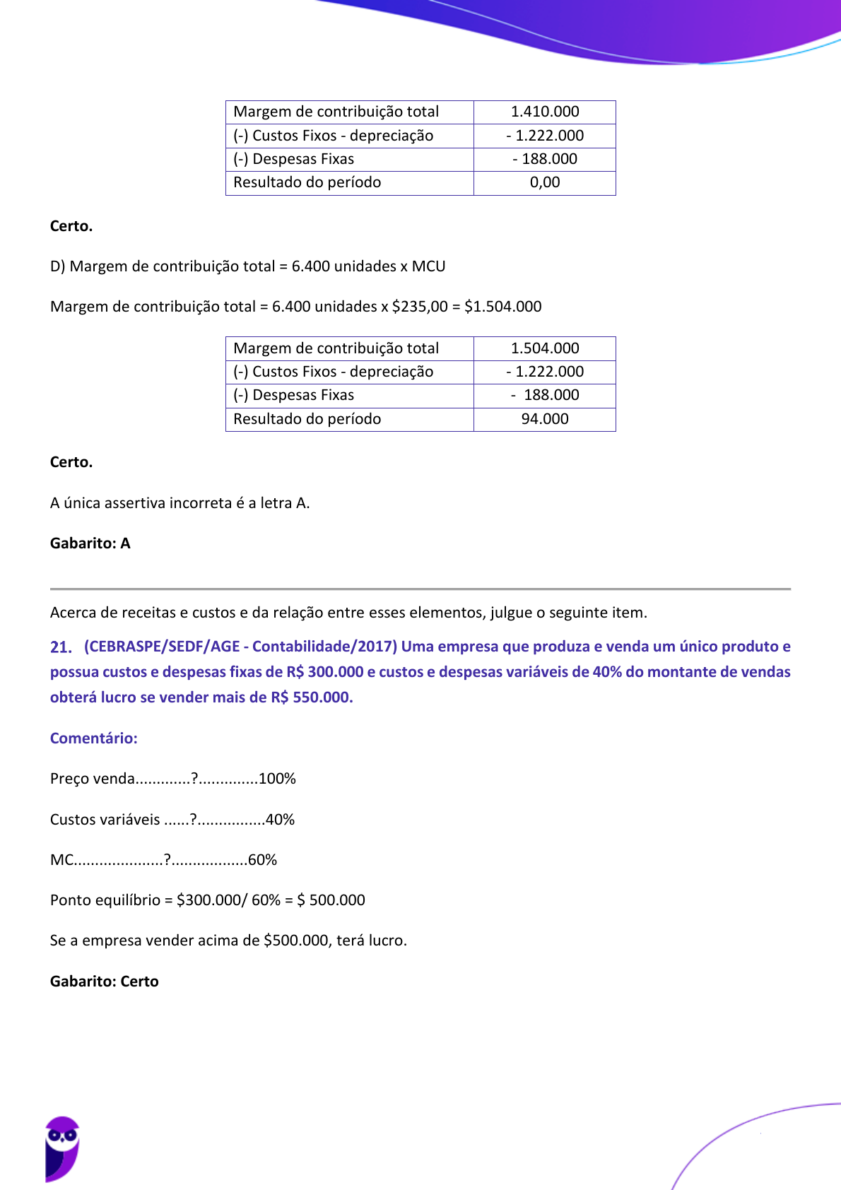 <p>Margem de contribuição total 1.410.000</p><p>(-) Custos Fixos - depreciação - 1.222.000</p><p>(-) Despesas Fixas - 188.000</p><p>Resultado do período 0,00</p><p>Certo.</p><p>D) Margem de contribuição total = 6.400 unidades x MCU</p><p>Margem de contribuição total = 6.400 unidades x $235,00 = $1.504.000</p><p>Margem de contribuição total 1.504.000</p><p>(-) Custos Fixos - depreciação - 1.222.000</p><p>(-) Despesas Fixas - 188.000</p><p>Resultado do período 94.000</p><p>Certo.</p><p>A única assertiva incorreta é a letra A.</p><p>Gabarito: A</p><p>Acerca de receitas e custos e da relação entre esses elementos, julgue o seguinte item.</p><p>(CEBRASPE/SEDF/AGE - Contabilidade/2017) Uma empresa que produza e venda um único produto e</p><p>possua custos e despesas fixas de R$ 300.000 e custos e despesas variáveis de 40% do montante de vendas</p><p>obterá lucro se vender mais de R$ 550.000.</p><p>Comentário:</p><p>Preço venda.............?..............100%</p><p>Custos variáveis ......?................40%</p><p>MC.....................?..................60%</p><p>Ponto equilíbrio = $300.000/ 60% = $ 500.000</p><p>Se a empresa vender acima de $500.000, terá lucro.</p><p>Gabarito: Certo</p><p>Luciano Rosa, Júlio Cardozo</p><p>Aula 05</p><p>SEFAZ-MG (Auditor Fiscal - área Auditoria e Fiscalização) Contabilidade de Custos - 2022 (Pós-Edital) (Prof Julio e Luciano)</p><p>www.estrategiaconcursos.com.br</p><p>68857100346813379 - Naiara Braz Sidrim Nogueira</p><p>91</p><p>200</p>
