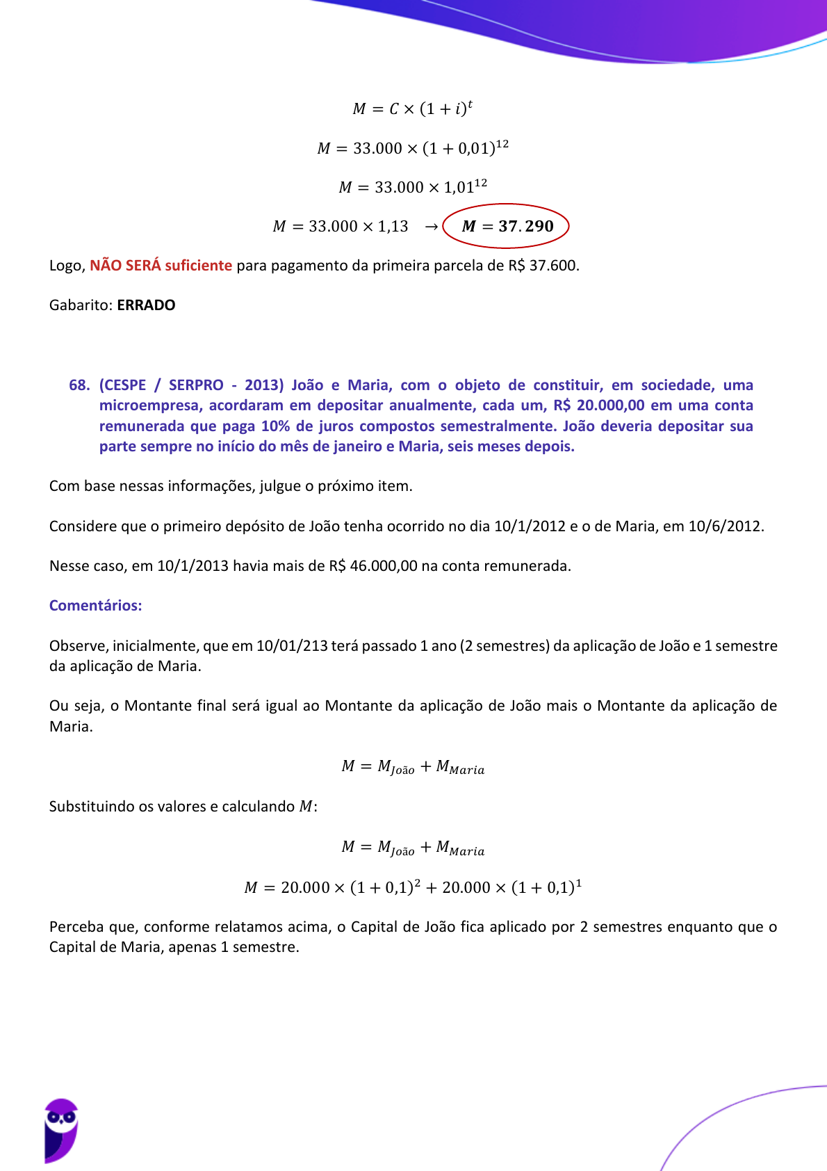 <p>98</p><p>𝑀 = 𝐶 × (1 + 𝑖)𝑡</p><p>𝑀 = 33.000 × (1 + 0,01)12</p><p>𝑀 = 33.000 × 1,0112</p><p>𝑀 = 33.000 × 1,13 → 𝑴 = 𝟑𝟕. 𝟐𝟗𝟎</p><p>Logo, NÃO SERÁ suficiente para pagamento da primeira parcela de R$ 37.600.</p><p>Gabarito: ERRADO</p><p>68. (CESPE / SERPRO - 2013) João e Maria, com o objeto de constituir, em sociedade, uma</p><p>microempresa, acordaram em depositar anualmente, cada um, R$ 20.000,00 em uma conta</p><p>remunerada que paga 10% de juros compostos semestralmente. João deveria depositar sua</p><p>parte sempre no início do mês de janeiro e Maria, seis meses depois.</p><p>Com base nessas informações, julgue o próximo item.</p><p>Considere que o primeiro depósito de João tenha ocorrido no dia 10/1/2012 e o de Maria, em 10/6/2012.</p><p>Nesse caso, em 10/1/2013 havia mais de R$ 46.000,00 na conta remunerada.</p><p>Comentários:</p><p>Observe, inicialmente, que em 10/01/213 terá passado 1 ano (2 semestres) da aplicação de João e 1 semestre</p><p>da aplicação de Maria.</p><p>Ou seja, o Montante final será igual ao Montante da aplicação de João mais o Montante da aplicação de</p><p>Maria.</p><p>𝑀 = 𝑀𝐽𝑜ã𝑜 + 𝑀𝑀𝑎𝑟𝑖𝑎</p><p>Substituindo os valores e calculando 𝑀:</p><p>𝑀 = 𝑀𝐽𝑜ã𝑜 + 𝑀𝑀𝑎𝑟𝑖𝑎</p><p>𝑀 = 20.000 × (1 + 0,1)2 + 20.000 × (1 + 0,1)1</p><p>Perceba que, conforme relatamos acima, o Capital de João fica aplicado por 2 semestres enquanto que o</p><p>Capital de Maria, apenas 1 semestre.</p><p>Equipe Exatas Estratégia Concursos</p><p>Aula 01</p><p>PETROBRAS (Engenharia de Produção) Matemática Financeira - 2023 (Pré-Edital)</p><p>www.estrategiaconcursos.com.br</p><p>- Masterconcursos.com -Agradecemos a preferência</p><p>150</p><p>250</p>