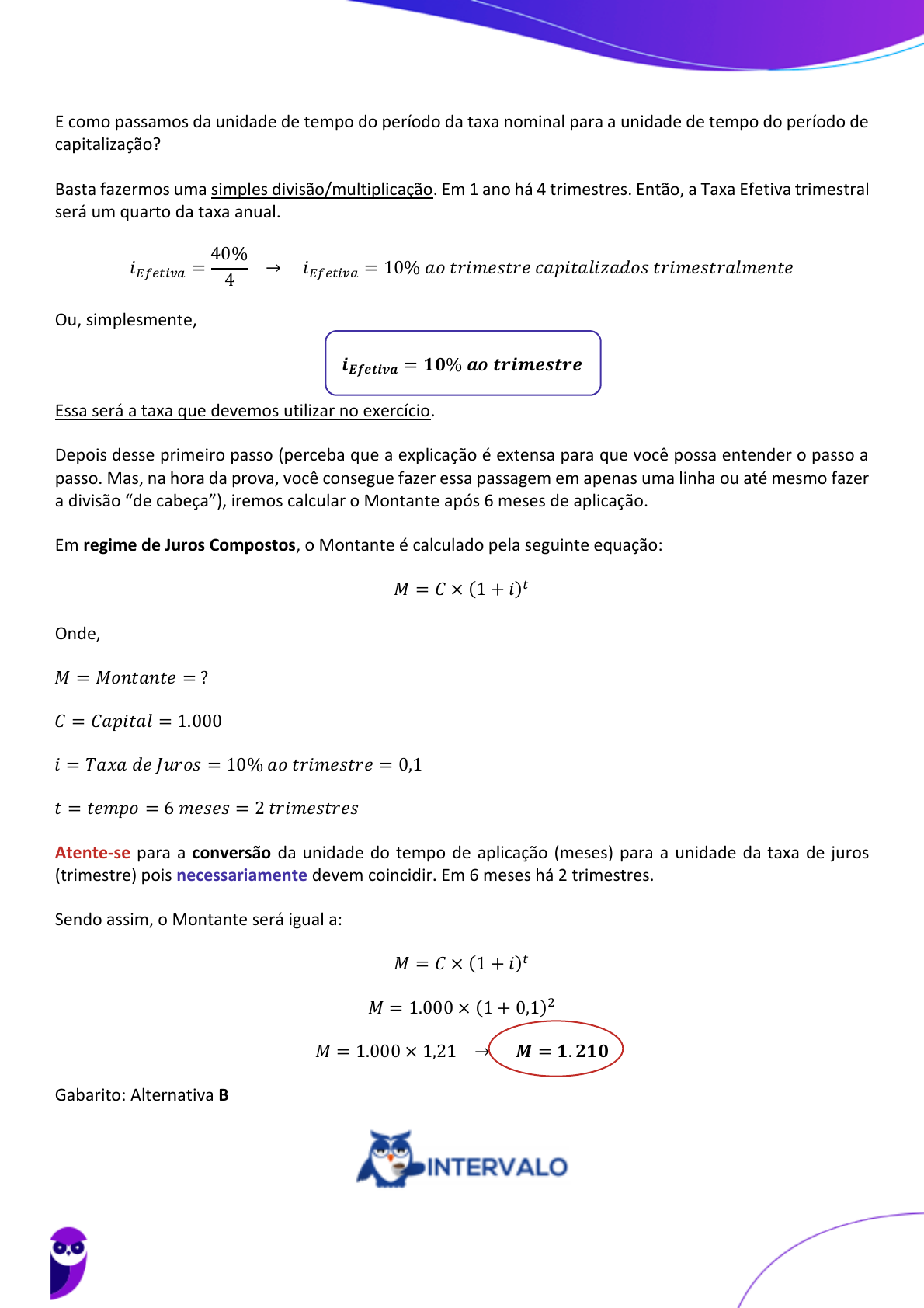<p>E como passamos da unidade de tempo do período da taxa nominal para a unidade de tempo do período de</p><p>capitalização?</p><p>Basta fazermos uma simples divisão/multiplicação. Em 1 ano há 4 trimestres. Então, a Taxa Efetiva trimestral</p><p>será um quarto da taxa anual.</p><p>𝑖𝐸𝑓𝑒𝑡𝑖𝑣𝑎 =</p><p>40%</p><p>4</p><p>→ ��𝐸𝑓𝑒𝑡𝑖𝑣𝑎 = 10% 𝑎𝑜 𝑡𝑟𝑖𝑚𝑒𝑠𝑡𝑟𝑒 𝑐𝑎𝑝𝑖𝑡𝑎𝑙𝑖𝑧𝑎𝑑𝑜𝑠 𝑡𝑟𝑖𝑚𝑒𝑠𝑡𝑟𝑎𝑙𝑚𝑒𝑛𝑡𝑒</p><p>Ou, simplesmente,</p><p>𝒊𝑬𝒇𝒆𝒕𝒊𝒗𝒂 = 𝟏𝟎% 𝒂𝒐 𝒕𝒓𝒊𝒎𝒆𝒔𝒕𝒓𝒆</p><p>Essa será a taxa que devemos utilizar no exercício.</p><p>Depois desse primeiro passo (perceba que a explicação é extensa para que você possa entender o passo a</p><p>passo. Mas, na hora da prova, você consegue fazer essa passagem em apenas uma linha ou até mesmo fazer</p><p>a divisão “de cabeça”), iremos calcular o Montante após 6 meses de aplicação.</p><p>Em regime de Juros Compostos, o Montante é calculado pela seguinte equação:</p><p>𝑀 = 𝐶 × (1 + 𝑖)𝑡</p><p>Onde,</p><p>𝑀 = 𝑀𝑜𝑛𝑡𝑎𝑛𝑡𝑒 = ?</p><p>𝐶 = 𝐶𝑎𝑝𝑖𝑡𝑎𝑙 = 1.000</p><p>𝑖 = 𝑇𝑎𝑥𝑎 𝑑𝑒 𝐽𝑢𝑟𝑜𝑠 = 10% 𝑎𝑜 𝑡𝑟𝑖𝑚𝑒𝑠𝑡𝑟𝑒 = 0,1</p><p>𝑡 = 𝑡𝑒𝑚𝑝𝑜 = 6 𝑚𝑒𝑠𝑒𝑠 = 2 𝑡𝑟𝑖𝑚𝑒𝑠𝑡𝑟𝑒𝑠</p><p>Atente-se para a conversão da unidade do tempo de aplicação (meses) para a unidade da taxa de juros</p><p>(trimestre) pois necessariamente devem coincidir. Em 6 meses há 2 trimestres.</p><p>Sendo assim, o Montante será igual a:</p><p>𝑀 = 𝐶 × (1 + 𝑖)𝑡</p><p>𝑀 = 1.000 × (1 + 0,1)2</p><p>𝑀 = 1.000 × 1,21 → 𝑴 = 𝟏. 𝟐𝟏𝟎</p><p>Gabarito: Alternativa B</p><p>Equipe Exatas Estratégia Concursos</p><p>Aula 01</p><p>PETROBRAS (Engenharia de Produção) Matemática Financeira - 2023 (Pré-Edital)</p><p>www.estrategiaconcursos.com.br</p><p>- Masterconcursos.com -Agradecemos a preferência</p><p>23</p><p>250</p>