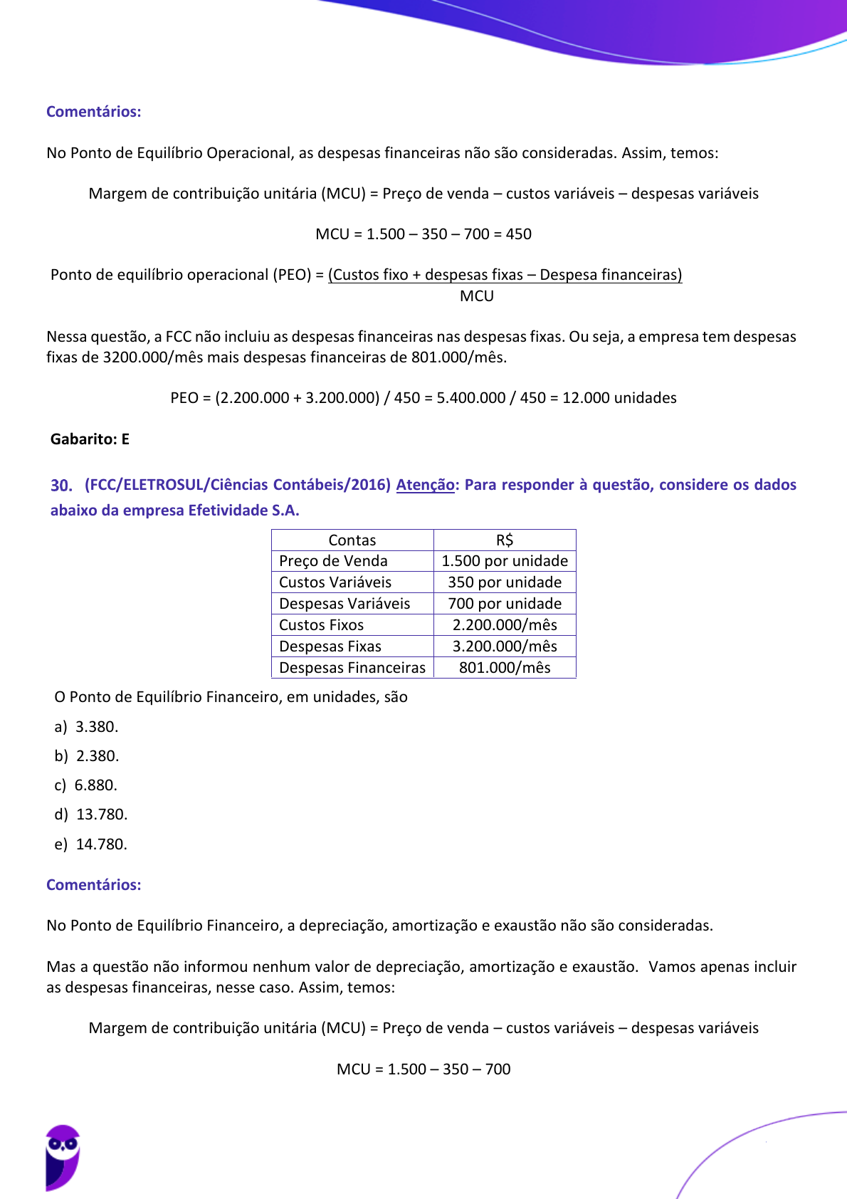 <p>Comentários:</p><p>No Ponto de Equilíbrio Operacional, as despesas financeiras não são consideradas. Assim, temos:</p><p>Margem de contribuição unitária (MCU) = Preço de venda – custos variáveis – despesas variáveis</p><p>MCU = 1.500 – 350 – 700 = 450</p><p>Ponto de equilíbrio operacional (PEO) = (Custos fixo + despesas fixas – Despesa financeiras)</p><p>MCU</p><p>Nessa questão, a FCC não incluiu as despesas financeiras nas despesas fixas. Ou seja, a empresa tem despesas</p><p>fixas de 3200.000/mês mais despesas financeiras de 801.000/mês.</p><p>PEO = (2.200.000 + 3.200.000) / 450 = 5.400.000 / 450 = 12.000 unidades</p><p>Gabarito: E</p><p>(FCC/ELETROSUL/Ciências Contábeis/2016) Atenção: Para responder à questão, considere os dados</p><p>abaixo da empresa Efetividade S.A.</p><p>Contas R$</p><p>Preço de Venda 1.500 por unidade</p><p>Custos Variáveis 350 por unidade</p><p>Despesas Variáveis 700 por unidade</p><p>Custos Fixos 2.200.000/mês</p><p>Despesas Fixas 3.200.000/mês</p><p>Despesas Financeiras 801.000/mês</p><p>O Ponto de Equilíbrio Financeiro, em unidades, são</p><p>a) 3.380.</p><p>b) 2.380.</p><p>c) 6.880.</p><p>d) 13.780.</p><p>e) 14.780.</p><p>Comentários:</p><p>No Ponto de Equilíbrio Financeiro, a depreciação, amortização e exaustão não são consideradas.</p><p>Mas a questão não informou nenhum valor de depreciação, amortização e exaustão. Vamos apenas incluir</p><p>as despesas financeiras, nesse caso. Assim, temos:</p><p>Margem de contribuição unitária (MCU) = Preço de venda – custos variáveis – despesas variáveis</p><p>MCU = 1.500 – 350 – 700</p><p>Luciano Rosa, Júlio Cardozo</p><p>Aula 05</p><p>SEFAZ-MG (Auditor Fiscal - área Auditoria e Fiscalização) Contabilidade de Custos - 2022 (Pós-Edital) (Prof Julio e Luciano)</p><p>www.estrategiaconcursos.com.br</p><p>68857100346813379 - Naiara Braz Sidrim Nogueira</p><p>99</p><p>200</p>