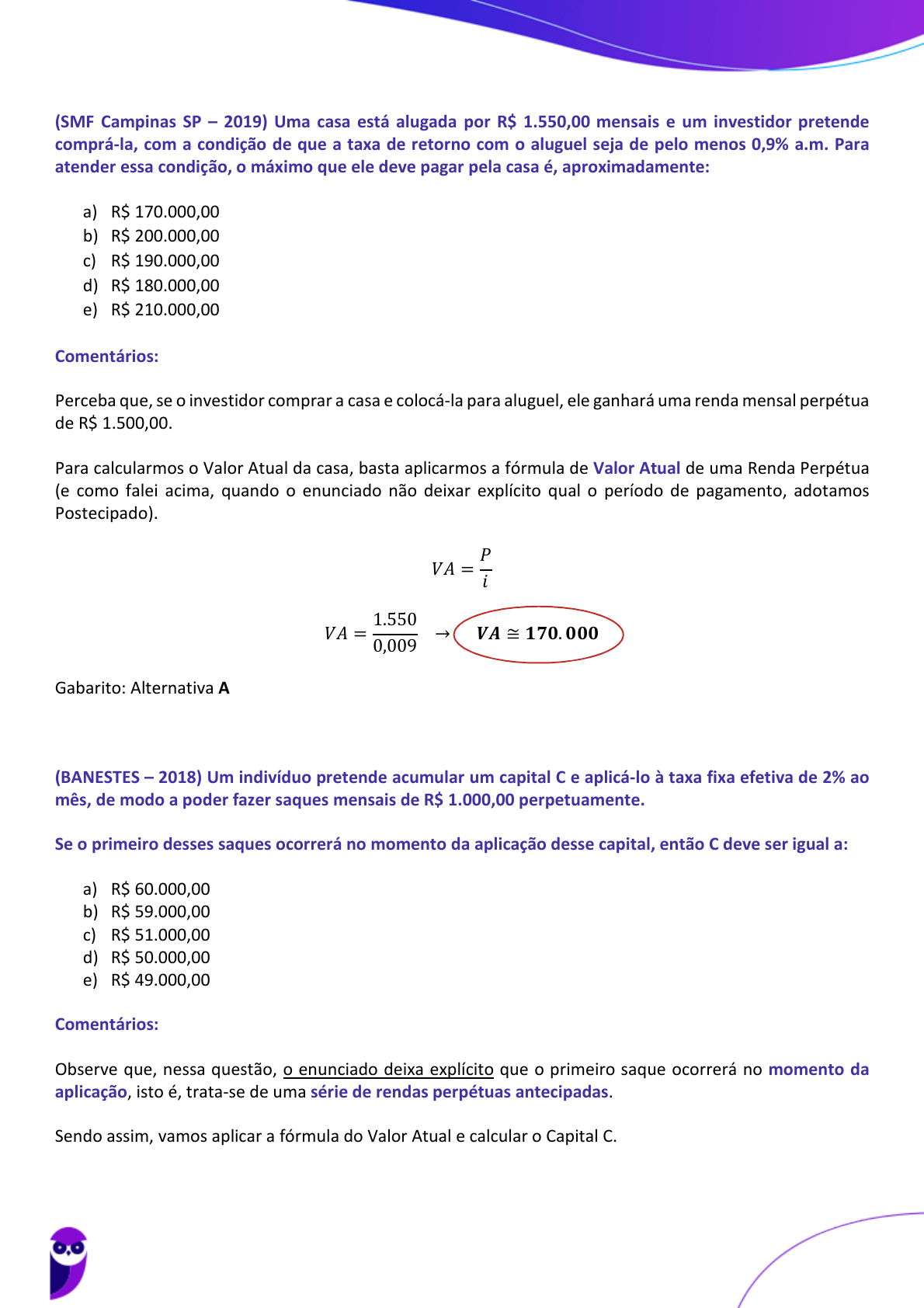 <p>(SMF Campinas SP – 2019) Uma casa está alugada por R$ 1.550,00 mensais e um investidor pretende</p><p>comprá-la, com a condição de que a taxa de retorno com o aluguel seja de pelo menos 0,9% a.m. Para</p><p>atender essa condição, o máximo que ele deve pagar pela casa é, aproximadamente:</p><p>a) R$ 170.000,00</p><p>b) R$ 200.000,00</p><p>c) R$ 190.000,00</p><p>d) R$ 180.000,00</p><p>e) R$ 210.000,00</p><p>Comentários:</p><p>Perceba que, se o investidor comprar a casa e colocá-la para aluguel, ele ganhará uma renda mensal perpétua</p><p>de R$ 1.500,00.</p><p>Para calcularmos o Valor Atual da casa, basta aplicarmos a fórmula de Valor Atual de uma Renda Perpétua</p><p>(e como falei acima, quando o enunciado não deixar explícito qual o período de pagamento, adotamos</p><p>Postecipado).</p><p>�� � �</p><p>�</p><p>�� � 1.550</p><p>0,009 → �� ≅ $/0. 000</p><p>Gabarito: Alternativa A</p><p>(BANESTES – 2018) Um indivíduo pretende acumular um capital C e aplicá-lo à taxa fixa efetiva de 2% ao</p><p>mês, de modo a poder fazer saques mensais de R$ 1.000,00 perpetuamente.</p><p>Se o primeiro desses saques ocorrerá no momento da aplicação desse capital, então C deve ser igual a:</p><p>a) R$ 60.000,00</p><p>b) R$ 59.000,00</p><p>c) R$ 51.000,00</p><p>d) R$ 50.000,00</p><p>e) R$ 49.000,00</p><p>Comentários:</p><p>Observe que, nessa questão, o enunciado deixa explícito que o primeiro saque ocorrerá no momento da</p><p>aplicação, isto é, trata-se de uma série de rendas perpétuas antecipadas.</p><p>Sendo assim, vamos aplicar a fórmula do Valor Atual e calcular o Capital C.</p><p>Equipe Exatas Estratégia Concursos</p><p>Aula 04</p><p>SEFAZ-MG (Auditor Fiscal) Matemática Financeira - 2022 (Pós-Edital)</p><p>www.estrategiaconcursos.com.br</p><p>38260904958130608 - Jose Aluizio Viana filho</p><p>43</p><p>237</p>