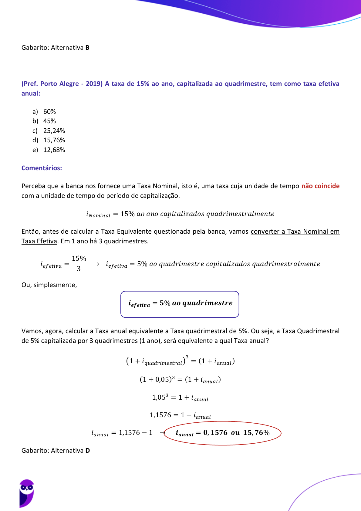 <p>Gabarito: Alternativa B</p><p>(Pref. Porto Alegre - 2019) A taxa de 15% ao ano, capitalizada ao quadrimestre, tem como taxa efetiva</p><p>anual:</p><p>a) 60%</p><p>b) 45%</p><p>c) 25,24%</p><p>d) 15,76%</p><p>e) 12,68%</p><p>Comentários:</p><p>Perceba que a banca nos fornece uma Taxa Nominal, isto é, uma taxa cuja unidade de tempo não coincide</p><p>com a unidade de tempo do período de capitalização.</p><p>𝑖𝑁𝑜𝑚𝑖𝑛𝑎𝑙 = 15% 𝑎𝑜 𝑎𝑛𝑜 𝑐𝑎𝑝𝑖𝑡𝑎𝑙𝑖𝑧𝑎𝑑𝑜𝑠 𝑞𝑢𝑎𝑑𝑟𝑖𝑚𝑒𝑠𝑡𝑟𝑎𝑙𝑚𝑒𝑛𝑡𝑒</p><p>Então, antes de calcular a Taxa Equivalente questionada pela banca, vamos converter a Taxa Nominal em</p><p>Taxa Efetiva. Em 1 ano há 3 quadrimestres.</p><p>𝑖𝑒𝑓𝑒𝑡𝑖𝑣𝑎 =</p><p>15%</p><p>3</p><p>→ 𝑖𝑒𝑓𝑒𝑡𝑖𝑣𝑎 = 5% 𝑎𝑜 𝑞𝑢𝑎𝑑𝑟𝑖𝑚𝑒𝑠𝑡𝑟𝑒 𝑐𝑎𝑝𝑖𝑡𝑎𝑙𝑖𝑧𝑎𝑑𝑜𝑠 𝑞𝑢𝑎𝑑𝑟𝑖𝑚𝑒𝑠𝑡𝑟𝑎𝑙𝑚𝑒𝑛𝑡𝑒</p><p>Ou, simplesmente,</p><p>𝒊𝒆𝒇𝒆𝒕𝒊𝒗𝒂 = 𝟓% 𝒂𝒐 𝒒𝒖𝒂𝒅𝒓𝒊𝒎𝒆𝒔𝒕𝒓𝒆</p><p>Vamos, agora, calcular a Taxa anual equivalente a Taxa quadrimestral de 5%. Ou seja, a Taxa Quadrimestral</p><p>de 5% capitalizada por 3 quadrimestres (1 ano), será equivalente a qual Taxa anual?</p><p>(1 + 𝑖𝑞𝑢𝑎𝑑𝑟𝑖𝑚𝑒𝑠𝑡𝑟𝑎𝑙)</p><p>3</p><p>= (1 + 𝑖𝑎𝑛𝑢𝑎𝑙)</p><p>(1 + 0,05)3 = (1 + 𝑖𝑎𝑛𝑢𝑎𝑙)</p><p>1,053 = 1 + 𝑖𝑎𝑛𝑢𝑎𝑙</p><p>1,1576 = 1 + 𝑖𝑎𝑛𝑢𝑎𝑙</p><p>𝑖𝑎𝑛𝑢𝑎𝑙 = 1,1576 − 1 → 𝒊𝒂𝒏𝒖𝒂𝒍 = 𝟎, 𝟏𝟓𝟕𝟔 𝒐𝒖 𝟏𝟓, 𝟕𝟔%</p><p>Gabarito: Alternativa D</p><p>Equipe Exatas Estratégia Concursos</p><p>Aula 01</p><p>PETROBRAS (Engenharia de Produção) Matemática Financeira - 2023 (Pré-Edital)</p><p>www.estrategiaconcursos.com.br</p><p>- Masterconcursos.com -Agradecemos a preferência</p><p>34</p><p>250</p>