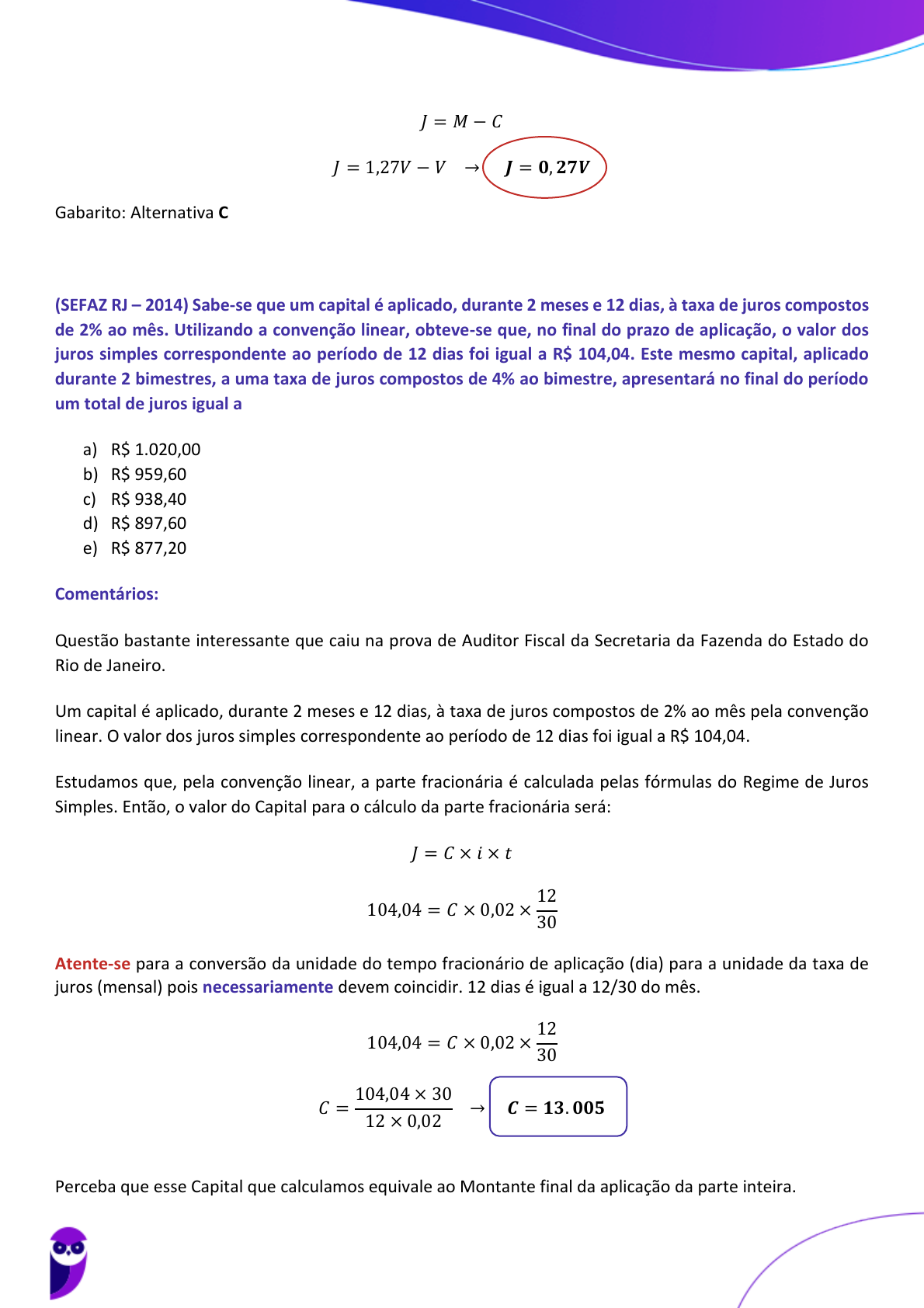 <p>𝐽 = 𝑀 − 𝐶</p><p>𝐽 = 1,27𝑉 − 𝑉 → 𝑱 = 𝟎, 𝟐𝟕𝑽</p><p>Gabarito: Alternativa C</p><p>(SEFAZ RJ – 2014) Sabe-se que um capital é aplicado, durante 2 meses e 12 dias, à taxa de juros compostos</p><p>de 2% ao mês. Utilizando a convenção linear, obteve-se que, no final do prazo de aplicação, o valor dos</p><p>juros simples correspondente ao período de 12 dias foi igual a R$ 104,04. Este mesmo capital, aplicado</p><p>durante 2 bimestres, a uma taxa de juros compostos de 4% ao bimestre, apresentará no final do período</p><p>um total de juros igual a</p><p>a) R$ 1.020,00</p><p>b) R$ 959,60</p><p>c) R$ 938,40</p><p>d) R$ 897,60</p><p>e) R$ 877,20</p><p>Comentários:</p><p>Questão bastante interessante que caiu na prova de Auditor Fiscal da Secretaria da Fazenda do Estado do</p><p>Rio de Janeiro.</p><p>Um capital é aplicado, durante 2 meses e 12 dias, à taxa de juros compostos de 2% ao mês pela convenção</p><p>linear. O valor dos juros simples correspondente ao período de 12 dias foi igual a R$ 104,04.</p><p>Estudamos que, pela convenção linear, a parte fracionária é calculada pelas fórmulas do Regime de Juros</p><p>Simples. Então, o valor do Capital para o cálculo da parte fracionária será:</p><p>𝐽 = 𝐶 × 𝑖 × 𝑡</p><p>104,04 = 𝐶 × 0,02 ×</p><p>12</p><p>30</p><p>Atente-se para a conversão da unidade do tempo fracionário de aplicação (dia) para a unidade da taxa de</p><p>juros (mensal) pois necessariamente devem coincidir. 12 dias é igual a 12/30 do mês.</p><p>104,04 = 𝐶 × 0,02 ×</p><p>12</p><p>30</p><p>𝐶 =</p><p>104,04 × 30</p><p>12 × 0,02</p><p>→ 𝑪 = 𝟏𝟑. 𝟎𝟎𝟓</p><p>Perceba que esse Capital que calculamos equivale ao Montante final da aplicação da parte inteira.</p><p>Equipe Exatas Estratégia Concursos</p><p>Aula 01</p><p>PETROBRAS (Engenharia de Produção) Matemática Financeira - 2023 (Pré-Edital)</p><p>www.estrategiaconcursos.com.br</p><p>- Masterconcursos.com -Agradecemos a preferência</p><p>39</p><p>250</p><p>==13272f==</p>