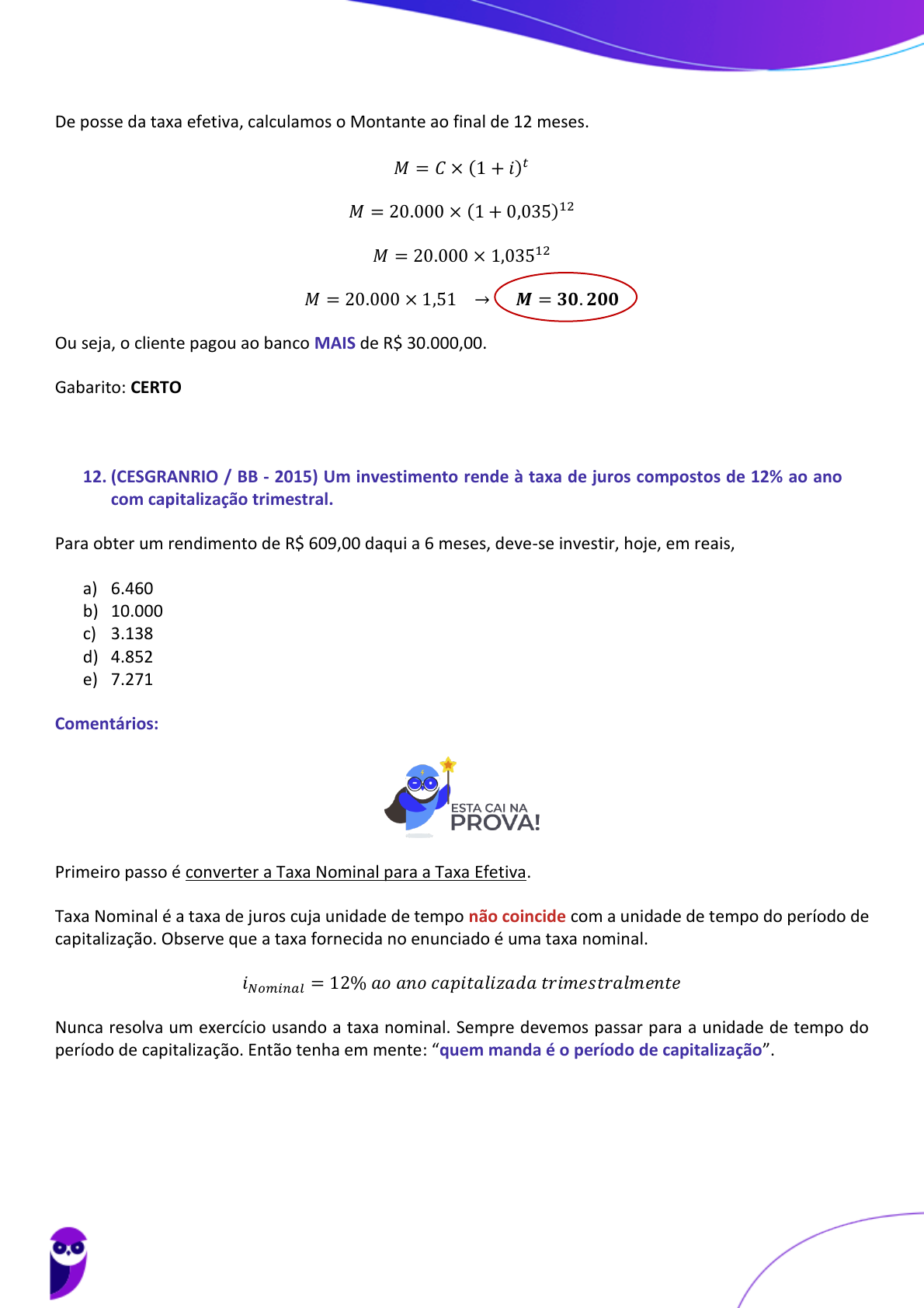 <p>17</p><p>De posse da taxa efetiva, calculamos o Montante ao final de 12 meses.</p><p>𝑀 = 𝐶 × (1 + 𝑖)𝑡</p><p>𝑀 = 20.000 × (1 + 0,035)12</p><p>𝑀 = 20.000 × 1,03512</p><p>𝑀 = 20.000 × 1,51 → 𝑴 = 𝟑𝟎. 𝟐𝟎𝟎</p><p>Ou seja, o cliente pagou ao banco MAIS de R$ 30.000,00.</p><p>Gabarito: CERTO</p><p>12. (CESGRANRIO / BB - 2015) Um investimento rende à taxa de juros compostos de 12% ao ano</p><p>com capitalização trimestral.</p><p>Para obter um rendimento de R$ 609,00 daqui a 6 meses, deve-se investir, hoje, em reais,</p><p>a) 6.460</p><p>b) 10.000</p><p>c) 3.138</p><p>d) 4.852</p><p>e) 7.271</p><p>Comentários:</p><p>Primeiro passo é converter a Taxa Nominal para a Taxa Efetiva.</p><p>Taxa Nominal é a taxa de juros cuja unidade de tempo não coincide com a unidade de tempo do período de</p><p>capitalização. Observe que a taxa fornecida no enunciado é uma taxa nominal.</p><p>𝑖𝑁𝑜𝑚𝑖𝑛𝑎𝑙 = 12% 𝑎𝑜 𝑎𝑛𝑜 𝑐𝑎𝑝𝑖𝑡𝑎𝑙𝑖𝑧𝑎𝑑𝑎 𝑡𝑟𝑖𝑚𝑒𝑠𝑡𝑟𝑎𝑙𝑚𝑒𝑛𝑡𝑒</p><p>Nunca resolva um exercício usando a taxa nominal. Sempre devemos passar para a unidade de tempo do</p><p>período de capitalização. Então tenha em mente: “quem manda é o período de capitalização”.</p><p>Equipe Exatas Estratégia Concursos</p><p>Aula 01</p><p>PETROBRAS (Engenharia de Produção) Matemática Financeira - 2023 (Pré-Edital)</p><p>www.estrategiaconcursos.com.br</p><p>- Masterconcursos.com -Agradecemos a preferência</p><p>169</p><p>250</p>