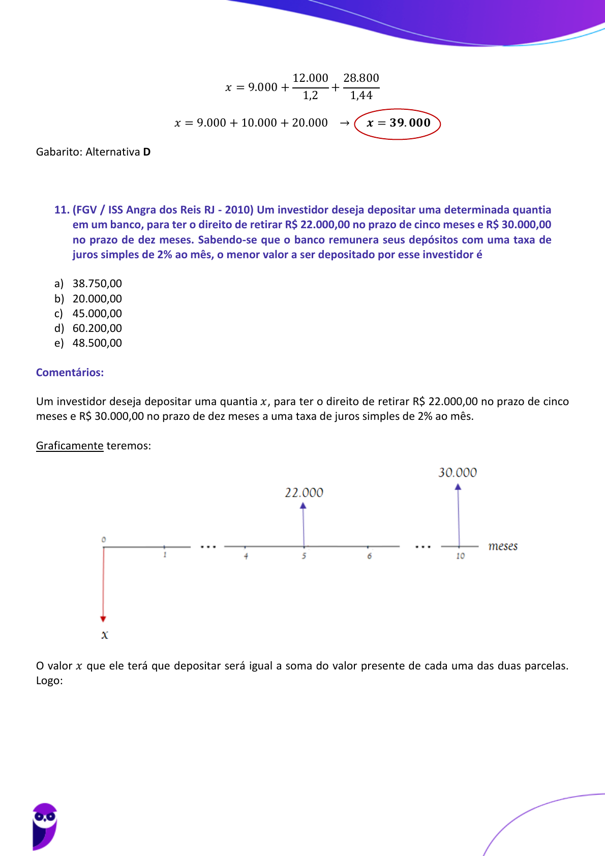 <p>20</p><p>𝑥 = 9.000 +</p><p>12.000</p><p>1,2</p><p>+</p><p>28.800</p><p>1,44</p><p>𝑥 = 9.000 + 10.000 + 20.000 → 𝒙 = 𝟑𝟗. 𝟎𝟎𝟎</p><p>Gabarito: Alternativa D</p><p>11. (FGV / ISS Angra dos Reis RJ - 2010) Um investidor deseja depositar uma determinada quantia</p><p>em um banco, para ter o direito de retirar R$ 22.000,00 no prazo de cinco meses e R$ 30.000,00</p><p>no prazo de dez meses. Sabendo-se que o banco remunera seus depósitos com uma taxa de</p><p>juros simples de 2% ao mês, o menor valor a ser depositado por esse investidor é</p><p>a) 38.750,00</p><p>b) 20.000,00</p><p>c) 45.000,00</p><p>d) 60.200,00</p><p>e) 48.500,00</p><p>Comentários:</p><p>Um investidor deseja depositar uma quantia 𝑥, para ter o direito de retirar R$ 22.000,00 no prazo de cinco</p><p>meses e R$ 30.000,00 no prazo de dez meses a uma taxa de juros simples de 2% ao mês.</p><p>Graficamente teremos:</p><p>O valor 𝑥 que ele terá que depositar será igual a soma do valor presente de cada uma das duas parcelas.</p><p>Logo:</p><p>Equipe Exatas Estratégia Concursos</p><p>Aula 04</p><p>SEFAZ-MG (Auditor Fiscal) Matemática Financeira - 2022 (Pós-Edital)</p><p>www.estrategiaconcursos.com.br</p><p>38260904958130608 - Jose Aluizio Viana filho</p><p>68</p><p>237</p>