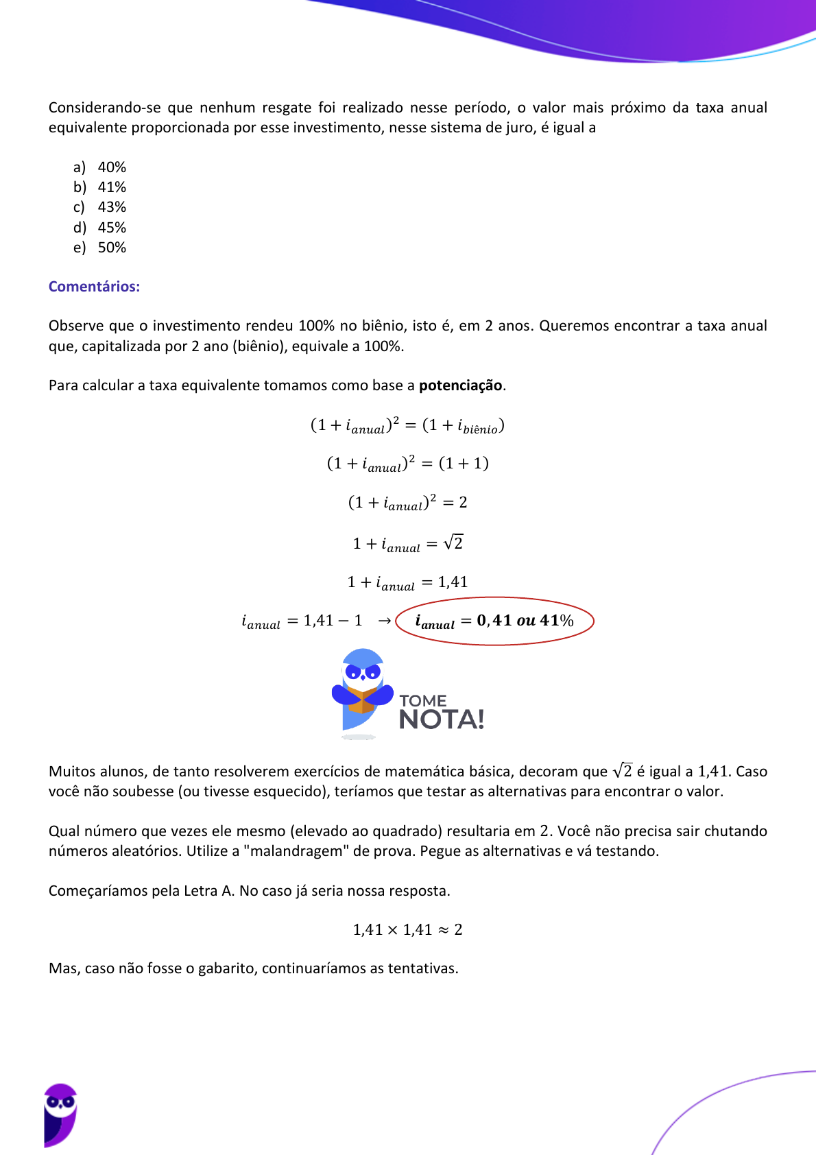 <p>14</p><p>Considerando-se que nenhum resgate foi realizado nesse período, o valor mais próximo da taxa anual</p><p>equivalente proporcionada por esse investimento, nesse sistema de juro, é igual a</p><p>a) 40%</p><p>b) 41%</p><p>c) 43%</p><p>d) 45%</p><p>e) 50%</p><p>Comentários:</p><p>Observe que o investimento rendeu 100% no biênio, isto é, em 2 anos. Queremos encontrar a taxa anual</p><p>que, capitalizada por 2 ano (biênio), equivale a 100%.</p><p>Para calcular a taxa equivalente tomamos como base a potenciação.</p><p>(1 + 𝑖𝑎𝑛𝑢𝑎𝑙)2 = (1 + 𝑖𝑏𝑖ê𝑛𝑖𝑜)</p><p>(1 + 𝑖𝑎𝑛𝑢𝑎𝑙)2 = (1 + 1)</p><p>(1 + 𝑖𝑎𝑛𝑢𝑎𝑙)2 = 2</p><p>1 + 𝑖𝑎𝑛𝑢𝑎𝑙 = √2</p><p>1 + 𝑖𝑎𝑛𝑢𝑎𝑙 = 1,41</p><p>𝑖𝑎𝑛𝑢𝑎𝑙 = 1,41 − 1 → 𝒊𝒂𝒏𝒖𝒂𝒍 = 𝟎, 𝟒𝟏 𝒐𝒖 𝟒𝟏%</p><p>Muitos alunos, de tanto resolverem exercícios de matemática básica, decoram que √2 é igual a 1,41. Caso</p><p>você não soubesse (ou tivesse esquecido), teríamos que testar as alternativas para encontrar o valor.</p><p>Qual número que vezes ele mesmo (elevado ao quadrado) resultaria em 2. Você não precisa sair chutando</p><p>números aleatórios. Utilize a "malandragem" de prova. Pegue as alternativas e vá testando.</p><p>Começaríamos pela Letra A. No caso já seria nossa resposta.</p><p>1,41 × 1,41 ≈ 2</p><p>Mas, caso não fosse o gabarito, continuaríamos as tentativas.</p><p>Equipe Exatas Estratégia Concursos</p><p>Aula 01</p><p>PETROBRAS (Engenharia de Produção) Matemática Financeira - 2023 (Pré-Edital)</p><p>www.estrategiaconcursos.com.br</p><p>- Masterconcursos.com -Agradecemos a preferência</p><p>193</p><p>250</p>