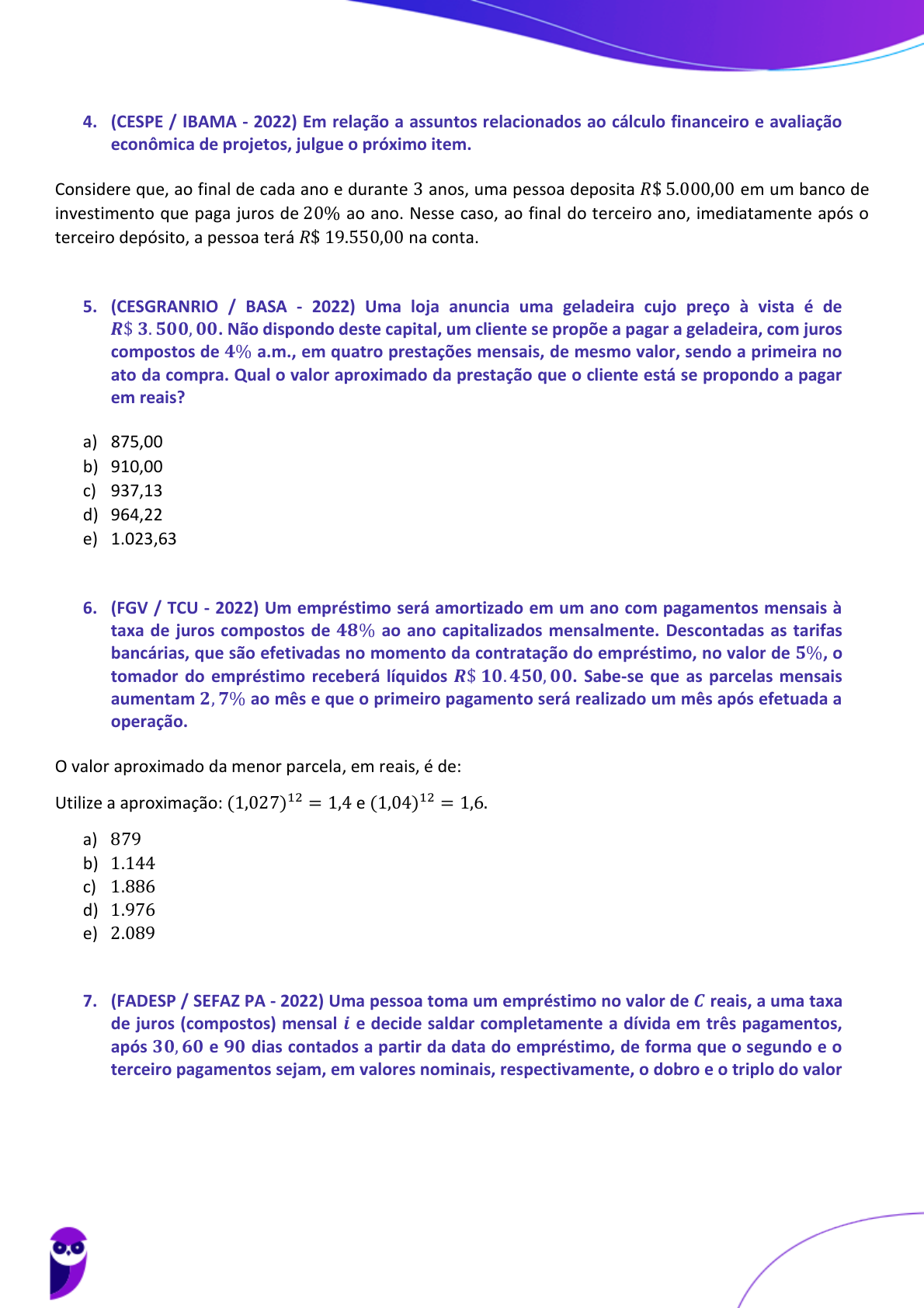 <p>2</p><p>4. (CESPE / IBAMA - 2022) Em relação a assuntos relacionados ao cálculo financeiro e avaliação</p><p>econômica de projetos, julgue o próximo item.</p><p>Considere que, ao final de cada ano e durante 3 anos, uma pessoa deposita 𝑅$ 5.000,00 em um banco de</p><p>investimento que paga juros de 20% ao ano. Nesse caso, ao final do terceiro ano, imediatamente após o</p><p>terceiro depósito, a pessoa terá 𝑅$ 19.550,00 na conta.</p><p>5. (CESGRANRIO / BASA - 2022) Uma loja anuncia uma geladeira cujo preço à vista é de</p><p>𝑹$ 𝟑. 𝟓𝟎𝟎, 𝟎𝟎. Não dispondo deste capital, um cliente se propõe a pagar a geladeira, com juros</p><p>compostos de 𝟒% a.m., em quatro prestações mensais, de mesmo valor, sendo a primeira no</p><p>ato da compra. Qual o valor aproximado da prestação que o cliente está se propondo a pagar</p><p>em reais?</p><p>a) 875,00</p><p>b) 910,00</p><p>c) 937,13</p><p>d) 964,22</p><p>e) 1.023,63</p><p>6. (FGV / TCU - 2022) Um empréstimo será amortizado em um ano com pagamentos mensais à</p><p>taxa de juros compostos de 𝟒𝟖% ao ano capitalizados mensalmente. Descontadas as tarifas</p><p>bancárias, que são efetivadas no momento da contratação do empréstimo, no valor de 𝟓%, o</p><p>tomador do empréstimo receberá líquidos 𝑹$ 𝟏𝟎. 𝟒𝟓𝟎, 𝟎𝟎. Sabe-se que as parcelas mensais</p><p>aumentam 𝟐, 𝟕% ao mês e que o primeiro pagamento será realizado um mês após efetuada a</p><p>operação.</p><p>O valor aproximado da menor parcela, em reais, é de:</p><p>Utilize a aproximação: (1,027)12 = 1,4 e (1,04)12 = 1,6.</p><p>a) 879</p><p>b) 1.144</p><p>c) 1.886</p><p>d) 1.976</p><p>e) 2.089</p><p>7. (FADESP / SEFAZ PA - 2022) Uma pessoa toma um empréstimo no valor de 𝑪 reais, a uma taxa</p><p>de juros (compostos) mensal 𝒊 e decide saldar completamente a dívida em três pagamentos,</p><p>após 𝟑𝟎, 𝟔𝟎 e 𝟗𝟎 dias contados a partir da data do empréstimo, de forma que o segundo e o</p><p>terceiro pagamentos sejam, em valores nominais, respectivamente, o dobro e o triplo do valor</p><p>Equipe Exatas Estratégia Concursos</p><p>Aula 04</p><p>SEFAZ-MG (Auditor Fiscal) Matemática Financeira - 2022 (Pós-Edital)</p><p>www.estrategiaconcursos.com.br</p><p>38260904958130608 - Jose Aluizio Viana filho</p><p>211</p><p>237</p>