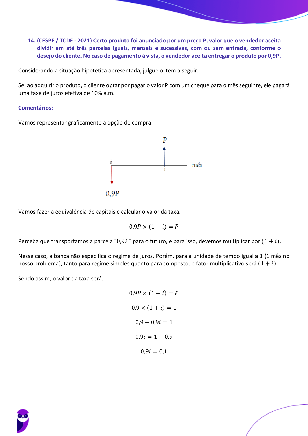 <p>23</p><p>14. (CESPE / TCDF - 2021) Certo produto foi anunciado por um preço P, valor que o vendedor aceita</p><p>dividir em até três parcelas iguais, mensais e sucessivas, com ou sem entrada, conforme o</p><p>desejo do cliente. No caso de pagamento à vista, o vendedor aceita entregar o produto por 0,9P.</p><p>Considerando a situação hipotética apresentada, julgue o item a seguir.</p><p>Se, ao adquirir o produto, o cliente optar por pagar o valor P com um cheque para o mês seguinte, ele pagará</p><p>uma taxa de juros efetiva de 10% a.m.</p><p>Comentários:</p><p>Vamos representar graficamente a opção de compra:</p><p>Vamos fazer a equivalência de capitais e calcular o valor da taxa.</p><p>0,9𝑃 × (1 + 𝑖) = 𝑃</p><p>Perceba que transportamos a parcela "0,9𝑃" para o futuro, e para isso, devemos multiplicar por (1 + 𝑖).</p><p>Nesse caso, a banca não especifica o regime de juros. Porém, para a unidade de tempo igual a 1 (1 mês no</p><p>nosso problema), tanto para regime simples quanto para composto, o fator multiplicativo será (1 + 𝑖).</p><p>Sendo assim, o valor da taxa será:</p><p>0,9𝑃 × (1 + 𝑖) = 𝑃</p><p>0,9 × (1 + 𝑖) = 1</p><p>0,9 + 0,9𝑖 = 1</p><p>0,9𝑖 = 1 − 0,9</p><p>0,9𝑖 = 0,1</p><p>Equipe Exatas Estratégia Concursos</p><p>Aula 04</p><p>SEFAZ-MG (Auditor Fiscal) Matemática Financeira - 2022 (Pós-Edital)</p><p>www.estrategiaconcursos.com.br</p><p>38260904958130608 - Jose Aluizio Viana filho</p><p>118</p><p>237</p>