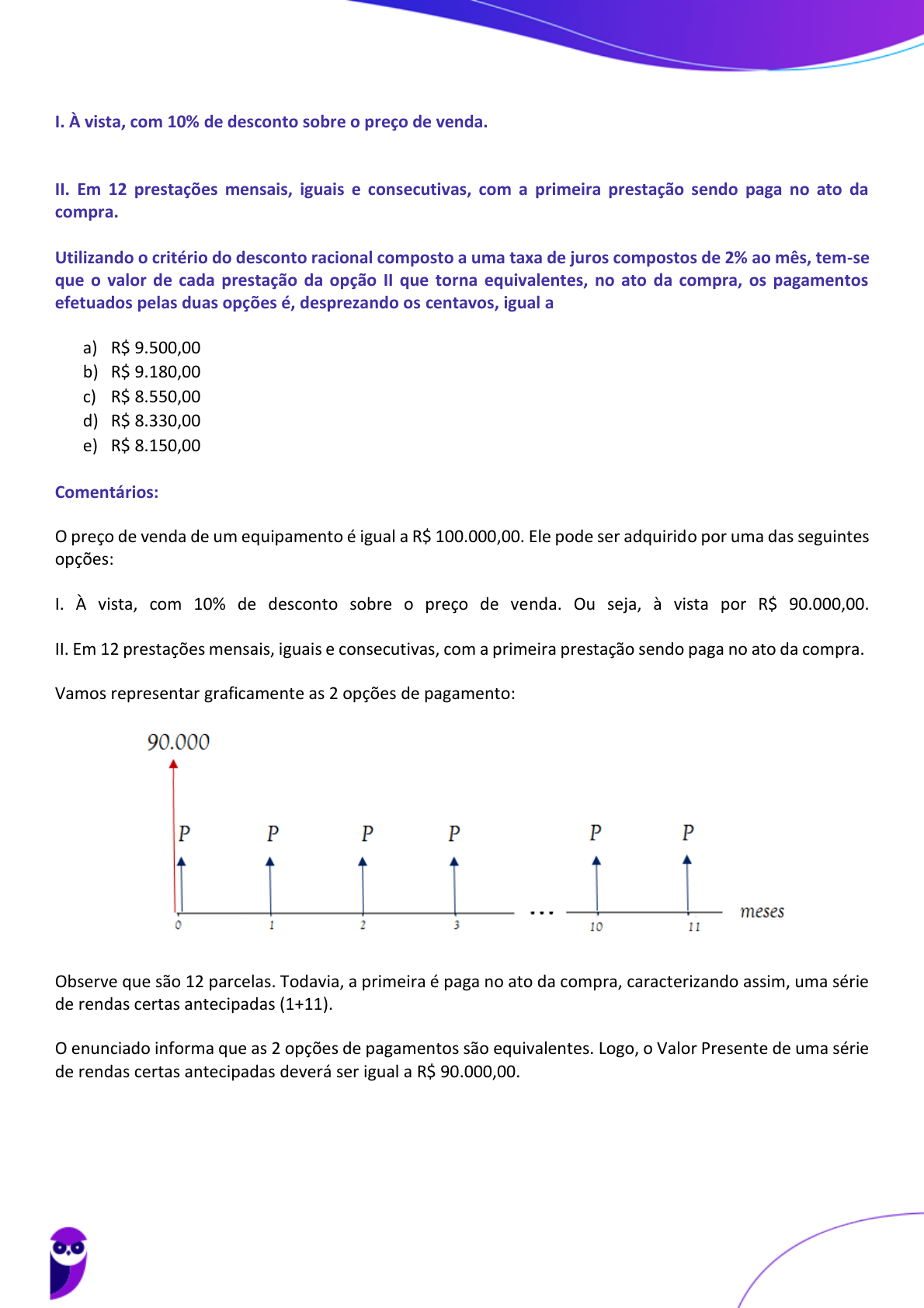 <p>50</p><p>I. À vista, com 10% de desconto sobre o preço de venda.</p><p>II. Em 12 prestações mensais, iguais e consecutivas, com a primeira prestação sendo paga no ato da</p><p>compra.</p><p>Utilizando o critério do desconto racional composto a uma taxa de juros compostos de 2% ao mês, tem-se</p><p>que o valor de cada prestação da opção II que torna equivalentes, no ato da compra, os pagamentos</p><p>efetuados pelas duas opções é, desprezando os centavos, igual a</p><p>a) R$ 9.500,00</p><p>b) R$ 9.180,00</p><p>c) R$ 8.550,00</p><p>d) R$ 8.330,00</p><p>e) R$ 8.150,00</p><p>Comentários:</p><p>O preço de venda de um equipamento é igual a R$ 100.000,00. Ele pode ser adquirido por uma das seguintes</p><p>opções:</p><p>I. À vista, com 10% de desconto sobre o preço de venda. Ou seja, à vista por R$ 90.000,00.</p><p>II. Em 12 prestações mensais, iguais e consecutivas, com a primeira prestação sendo paga no ato da compra.</p><p>Vamos representar graficamente as 2 opções de pagamento:</p><p>Observe que são 12 parcelas. Todavia, a primeira é paga no ato da compra, caracterizando assim, uma série</p><p>de rendas certas antecipadas (1+11).</p><p>O enunciado informa que as 2 opções de pagamentos são equivalentes. Logo, o Valor Presente de uma série</p><p>de rendas certas antecipadas deverá ser igual a R$ 90.000,00.</p><p>Equipe Exatas Estratégia Concursos</p><p>Aula 04</p><p>SEFAZ-MG (Auditor Fiscal) Matemática Financeira - 2022 (Pós-Edital)</p><p>www.estrategiaconcursos.com.br</p><p>38260904958130608 - Jose Aluizio Viana filho</p><p>145</p><p>237</p>