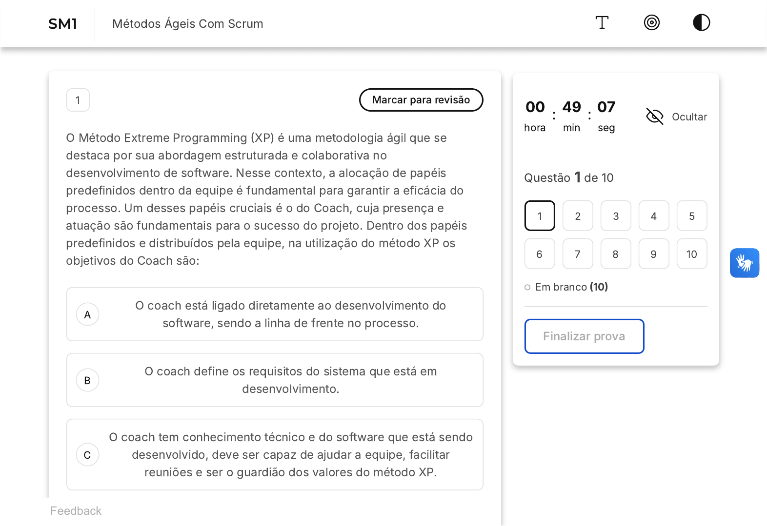 <p>A</p><p>B</p><p>C</p><p>1 Marcar para revisão</p><p>O Método Extreme Programming �XP) é uma metodologia ágil que se</p><p>destaca por sua abordagem estruturada e colaborativa no</p><p>desenvolvimento de software. Nesse contexto, a alocação de papéis</p><p>predefinidos dentro da equipe é fundamental para garantir a eficácia do</p><p>processo. Um desses papéis cruciais é o do Coach, cuja presença e</p><p>atuação são fundamentais para o sucesso do projeto. Dentro dos papéis</p><p>predefinidos e distribuídos pela equipe, na utilização do método XP os</p><p>objetivos do Coach são:</p><p>O coach está ligado diretamente ao desenvolvimento do</p><p>software, sendo a linha de frente no processo.</p><p>O coach define os requisitos do sistema que está em</p><p>desenvolvimento.</p><p>O coach tem conhecimento técnico e do software que está sendo</p><p>desenvolvido, deve ser capaz de ajudar a equipe, facilitar</p><p>reuniões e ser o guardião dos valores do método XP.</p><p>00</p><p>hora</p><p>: 49</p><p>min</p><p>: 07</p><p>seg</p><p>Ocultar</p><p>Questão 1 de 10</p><p>Em branco �10�</p><p>Finalizar prova</p><p>1 2 3 4 5</p><p>6 7 8 9 10</p><p>Feedback</p><p>SM1 Métodos Ágeis Com Scrum</p><p>D</p><p>E</p><p>A</p><p>B</p><p>C</p><p>O coach fornece feedback à equipe mantendo o equilíbrio entre o</p><p>que foi e precisa ser realizado.</p><p>O coach realiza medições para avaliar o processo de</p><p>desenvolvimento.</p><p>2 Marcar para revisão</p><p>Qual das opções a seguir é o maior obstáculo na adoção dos métodos</p><p>ágeis segundo a 15ª edição da pesquisa State of Agile?</p><p>Processos e práticas inconsistentes entre as equipes.</p><p>Treinamento e educação insuficientes.</p><p>Profissionais não certificados como Scrum master.</p><p>D</p><p>E</p><p>A</p><p>B</p><p>C</p><p>Cultura organizacional em conflito com valores ágeis.</p><p>Resistência geral da organização à mudança.</p><p>3 Marcar para revisão</p><p>XP é o mais específico dos frameworks ágeis de desenvolvimento de</p><p>software. Apresenta como ideia precípua produzir software de elevada</p><p>qualidade, ao mesmo tempo em que promove qualidade de vida para a</p><p>equipe de desenvolvimento. Nesse sentido, Diversidade, Melhoria e</p><p>Responsabilidade Aceita são alguns dos _______________ definidos na XP.</p><p>Conceitos.</p><p>Práticas.</p><p>Princípios.</p><p>D</p><p>E</p><p>A</p><p>B</p><p>C</p><p>Atributos da Equipe.</p><p>Valores.</p><p>4 Marcar para revisão</p><p>Qual alternativa contém somente tópicos tratados na seção "um sistema</p><p>de entrega de valor" do padrão de gerenciamento de projetos do Guia</p><p>PMBOK?</p><p>Gerenciamento das partes interessadas, Entrega de Valor.</p><p>Gerenciamento das entregas, Valor.</p><p>Governança, Gerenciamento das entregas.</p><p>D</p><p>E</p><p>A</p><p>B</p><p>C</p><p>Governança, funções associadas a projetos, ambiente do projeto</p><p>e gerenciamento de produto.</p><p>Ambiente do projeto, gerenciamento das entregas.</p><p>5 Marcar para revisão</p><p>O SCRUM considera que o conhecimento vem através da experiência, este</p><p>método de gestão possui valores e pilares. São pilares do SCRUM�</p><p>Agilidade, transparência e foco.</p><p>Adaptação, transparência e inspeção.</p><p>Adaptação, comprometimento e coragem.</p><p>D</p><p>E</p><p>Inspeção, transparência e foco.</p><p>Inspeção, adaptação e respeito.</p><p>6 Marcar para revisão</p><p>Diferentemente do método XP, o modelo SCRUM possui apenas três</p><p>papéis para seu time. Dessa forma visa otimizar a criatividade,</p><p>produtividade e flexibilidade, tornando-os multifuncionais e auto-</p><p>organizáveis. Analise as afirmativas abaixo:</p><p>I. O time de desenvolvimento, DEV team, deve possuir de 3 a 9</p><p>componentes.</p><p>II. O Dono do produto, Product Owner, define e transmite o que se espera</p><p>do produto.</p><p>III. O Líder SCRUM, SCRUM Master, deve apoiar sua equipe de transmitir o</p><p>entendimento do SCRUM.</p><p>É correto o que se afirma em:</p><p>A</p><p>B</p><p>C</p><p>D</p><p>E</p><p>A</p><p>B</p><p>I, apenas.</p><p>II, apenas.</p><p>I e III, apenas.</p><p>II e III, apenas.</p><p>I, II e III.</p><p>7 Marcar para revisão</p><p>Qual das alternativas a seguir sobre o Scrum poker é falsa?</p><p>Somente os developers participam do processo de estimativa do</p><p>Scrum poker.</p><p>Tem como premissa que quem executa deve ser o mesmo que</p><p>estima.</p><p>C</p><p>D</p><p>E</p><p>A</p><p>B</p><p>C</p><p>É uma técnica para estimar por meio de um jogo de cartas</p><p>baseado em consenso.</p><p>Todos os developers selecionam uma carta para cada item do</p><p>Sprint Backlog.</p><p>Também é conhecido como planning poker.</p><p>8 Marcar para revisão</p><p>Qual das opções não é uma prática do Kanban essencial para o Scrum?</p><p>Visualização do fluxo de trabalho.</p><p>Limitação do trabalho em progresso.</p><p>Gestão ativa de itens de trabalho em andamento.</p><p>D</p><p>E</p><p>A</p><p>B</p><p>C</p><p>Inspeção e adaptação da definição do ''fluxo de trabalho''.</p><p>Monitoramento do trabalho em progresso por meio do</p><p>cronograma.</p><p>9 Marcar para revisão</p><p>XP e Kanban são práticas de gerenciamento de projetos de software</p><p>populares entre praticantes do desenvolvimento ágil.</p><p>Um aspecto de divergência entre as duas práticas é:</p><p>Processo incremental.</p><p>Processo iterativo.</p><p>Uso de quadro de tarefas.</p><p>D</p><p>E</p><p>A</p><p>B</p><p>C</p><p>Representação do estágio de desenvolvimento de uma tarefa.</p><p>Valorização de feedback.</p><p>10 Marcar para revisão</p><p>O Guia PMBOK é um framework que fornece princípios e domínios de</p><p>desempenho que podem ser usados pelos métodos ágeis com o intuito de</p><p>entregar valor nos projetos. Quais são os domínios de desempenho do</p><p>Guia PMBOK?</p><p>Integração, Escopo, Cronograma, Custos, Qualidade,
