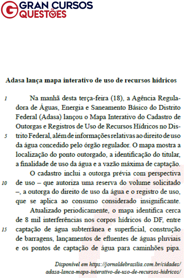 <p>Simulado</p><p>Criado em: 23/10/2024 às 10:14:05</p><p>1. [Q1230638]</p><p>Quanto à tipologia, o texto classifica-se como, essencialmente:</p><p>a ) descritivo.</p><p>b ) narrativo.</p><p>c ) argumentativo.</p><p>d ) injuntivo.</p><p>e ) expositivo.</p><p>Disciplinas/Assuntos vinculados: Língua Portuguesa > Texto expositivo, Tipologias Textuais.</p><p>Fonte: Instituto Americano de Desenvolvimento - IADES 2020 / Agência Reguladora de Águas e Saneamento do Distrito Federal ADASA -</p><p>DF / Regulador de Serviços Públicos - Área Gestão e Regulação / Questão: 1</p><p>2. [Q1230641]</p><p>No período “O cadastro inclui a outorga prévia” (l. 9), caso o termo destacado fosse substituído</p><p>por Grande parte dos cadastros, de acordo com o que prescreve a norma-padrão acerca da</p><p>concordância verbal, a forma verbal “inclui”:</p><p>a ) deveria obrigatoriamente permanecer na terceira pessoa do singular.</p><p>b ) deveria obrigatoriamente passar para a terceira pessoa do plural.</p><p>c ) poderia tanto permanecer na terceira pessoa do singular quanto passar para a terceira</p><p>pessoa do plural.</p><p>d ) não poderia passar para a terceira pessoa do plural.</p><p>e ) não poderia passar para a terceira pessoa do singular.</p><p>Disciplinas/Assuntos vinculados: Língua Portuguesa > Equivalência, substituição, reorganização e transformação de palavras ou</p><p>trechos do texto, Concordância verbal.</p><p>Fonte: Instituto Americano de Desenvolvimento - IADES 2020 / Agência Reguladora de Águas e Saneamento do Distrito Federal ADASA -</p><p>DF / Regulador de Serviços Públicos - Área Gestão e Regulação / Questão: 2</p><p>3. [Q1230643] Na linha 11, a vírgula utilizada é</p><p>a ) obrigatória, pois marca inserção da expressão de natureza adverbial.</p><p>b ) opção estilística do autor.</p><p>c ) opcional, devido ao travessão que também é sinal indicativo de pausa.</p><p>d ) necessária para o deslocamento do sujeito.</p><p>e ) obrigatória para indicar uma enumeração.</p><p>Disciplinas/Assuntos vinculados: Língua Portuguesa > Uso da Vírgula.</p><p>Fonte: Instituto Americano de Desenvolvimento - IADES 2020 / Agência Reguladora de Águas e Saneamento do Distrito Federal ADASA -</p><p>DF / Regulador de Serviços Públicos - Área Gestão e Regulação / Questão: 3</p><p>4. [Q1230644]</p><p>O pronome relativo “que” no trecho “O cadastro inclui a outorga prévia com perspectiva de uso –</p><p>que autoriza uma reserva do volume solicitado” (linhas 9 e 10) desempenha a função sintática de</p><p>a ) sujeito.</p><p>b ) objeto direto.</p><p>c ) objeto indireto.</p><p>d ) complemento nominal.</p><p>e ) predicativo do sujeito.</p><p>Disciplinas/Assuntos vinculados: Língua Portuguesa > Pronomes relativos, Análise sintática.</p><p>Fonte: Instituto Americano de Desenvolvimento - IADES 2020 / Agência Reguladora de Águas e Saneamento do Distrito Federal ADASA -</p><p>DF / Regulador de Serviços Públicos - Área Gestão e Regulação / Questão: 4</p><p>5. [Q1230647]</p><p>Assinale a alternativa que reproduz uma mensagem compatível com a do período “A ação também</p><p>reitera o histórico da Adasa nos últimos anos e atua como base para fortalecer os títulos de agência</p><p>eficiente e transparente” (l. 13 a 15).</p><p>a ) A ação reitera o histórico da Adasa nos últimos anos e atua como base para fortalecer</p><p>também os títulos de agência eficiente e transparente.</p><p>b ) Para também fortalecer os títulos de agência eficiente e transparente, a ação reitera o</p><p>histórico da Adasa nos últimos anos e atua como base.</p><p>c ) Para fortalecer os títulos de agência eficiente e transparente, a ação também reitera o</p><p>histórico da Adasa nos últimos anos e atua como base.</p><p>d ) A ação reitera o histórico da Adasa nos últimos anos e atua como base para fortalecer os</p><p>títulos de agência eficiente e transparente também.</p><p>e ) A ação reitera o histórico da Adasa nos últimos anos e atua como base para também</p><p>fortalecer os títulos de agência eficiente e transparente.</p><p>Disciplinas/Assuntos vinculados: Língua Portuguesa > Norma culta ou norma padrão.</p><p>Fonte: Instituto Americano de Desenvolvimento - IADES 2020 / Agência Reguladora de Águas e Saneamento do Distrito Federal ADASA -</p><p>DF / Regulador de Serviços Públicos - Área Gestão e Regulação / Questão: 5</p><p>6. [Q1230651]</p><p>“A ação também reitera o histórico da Adasa nos últimos anos e atua como base para fortalecer os</p><p>títulos de agência eficiente e transparente” (l. 13 a 15).</p><p>Sob o ponto de vista da estruturação sintática, a oração sublinhada trata-se de uma</p><p>a ) oração subordinada substantiva subjetiva reduzida de infinitivo.</p><p>b ) oração subordinada adverbial condicional.</p><p>c ) oração subordinada adverbial temporal reduzida de infinitivo.</p><p>d ) oração subordinada adjetiva explicativa.</p><p>e ) oração coordenada assindética conclusiva.</p><p>Disciplinas/Assuntos vinculados: Língua Portuguesa > Morfossintaxe do período, Análise sintática.</p><p>Fonte: Instituto Americano de Desenvolvimento - IADES 2020 / Agência Reguladora de Águas e Saneamento do Distrito Federal ADASA -</p><p>DF / Regulador de Serviços Públicos - Área Gestão e Regulação / Questão: 6</p><p>7. [Q1230653]</p><p>As palavras retiradas do texto foram acentuadas com base na mesma regra de acentuação, exceto</p><p>em:</p><p>a ) Águas.</p><p>b ) Básico.</p><p>c ) Título.</p><p>d ) Hídricos.</p><p>e ) Últimos.</p><p>Disciplinas/Assuntos vinculados: Língua Portuguesa > Regras de acentuação, Acentuação gráfica.</p><p>Fonte: Instituto Americano de Desenvolvimento - IADES 2020 / Agência Reguladora de Águas e Saneamento do Distrito Federal ADASA -</p><p>DF / Regulador de Serviços Públicos - Área Gestão e Regulação / Questão: 7</p><p>8. [Q1230656]</p