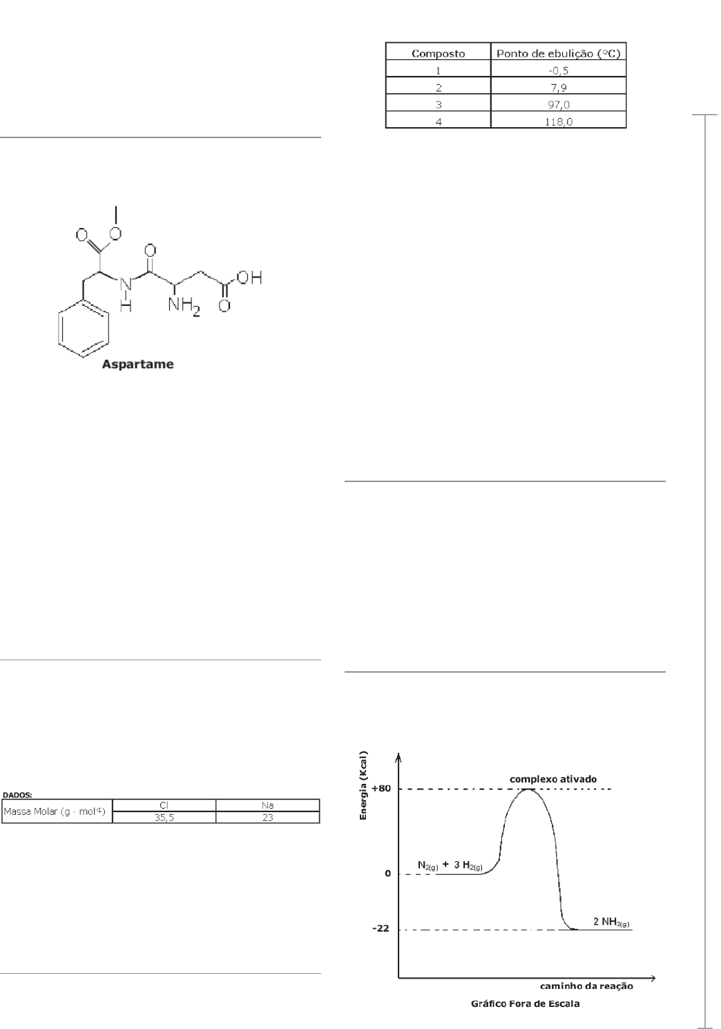 <p>Q</p><p>U</p><p>ÍM</p><p>IC</p><p>A</p><p>41</p><p>a) 28 anos</p><p>b) 56 anos</p><p>c) 84 anos</p><p>d) 112 anos</p><p>e) 124,5 anos</p><p>85. (EsPCEx – DECEX – 2011) O aspartame é um adoçante artifi-</p><p>cial usado para adoçar bebidas e alimentos.</p><p>Abaixo está representada a sua fórmula estrutural.</p><p>Sobre essa estrutura, são feitas as seguintes afirmações</p><p>I- As funções orgânicas existentes na molécula dessa substân-</p><p>cia são características, apenas, de éter, amina, amida, ácido car-</p><p>boxílico e aldeído.</p><p>II- A fórmula molecular do aspartame é C13H15N2O5.</p><p>III- A função amina presente na molécula do aspartame é</p><p>classificada como primária, porque só tem um hidrogênio</p><p>substituido.</p><p>IV- A molécula de aspartame possui 7 carbonos com hibridiza-</p><p>ção sp3 e 4 carbonos com hibridização sp2.</p><p>V- O aspartame possui 6 ligações π (pi) na sua estrutura.</p><p>Das afirmações feitas está(ão) corretas:</p><p>a) apenas I e III.</p><p>b) apenas II e III.</p><p>c) apenas III e V.</p><p>d) apenas II e IV.</p><p>e) apenas I e IV.</p><p>86. (EsPCEx – DECEX – 2011) Em uma eletrólise ígnea do cloreto</p><p>de sódio, uma corrente elétrica, de intensidade igual a 5 ampè-</p><p>res, atravessa uma cuba eletrolítica, com o auxilio de dois ele-</p><p>trodos inertes, durante 1930 segundos.</p><p>O volume do gás cloro, em litros, medido nas CNTP, e a</p><p>massa de sódio, em gramas, obtidos nessa eletrólise, são,</p><p>respectivamente:</p><p>Volume Molar nas CNTP=22,71 L· mol-1</p><p>1 Faraday (F)=96500 Coulombs (C)</p><p>a) 2,4155 L e 3,5 g</p><p>b) 1,1355 L e 2,3 g</p><p>c) 2,3455 L e 4,5 g</p><p>d) 3,5614 L e 3,5 g</p><p>e) 4,5558 L e 4,8 g</p><p>87. (EsPCEx – DECEX – 2011) Em uma tabela, são dados 4(quatro)</p><p>compostos orgânicos, representados pelos algarismos 1,2,3 e 4,</p><p>e seus respectivos pontos de ebulição, à pressão de 1 atm. Esses</p><p>compostos são propan-1-ol, ácido etanóico, butano e metoxie-</p><p>tano, não necessariamente nessa ordem.</p><p>Sobre os compostos e a tabela acima são feitas as seguintes</p><p>afirmações:</p><p>I- Os compostos 1, 2, 3 e 4 são respectivamente butano, meto-</p><p>xietano, propan-1-ol e ácido etanóico.</p><p>II- As moléculas do propan-1-ol, por apresentarem o grupo car-</p><p>boxila em sua estrutura, possuem interações moleculares mais</p><p>fortes do que as moléculas do ácido etanóico.</p><p>III- O composto orgânico propan-1-ol é um álcool insolúvel em</p><p>água, pois suas moléculas fazem ligações predominantemente</p><p>do tipo dipolo induzido-dipolo induzido.</p><p>IV- O composto butano tem o menor ponto de ebulição, pois</p><p>suas moléculas se unem por forças do tipo dipolo induzido-di-</p><p>polo induzido, que são pouco intensas.</p><p>V- O composto metoxietano é um éster que apresenta em sua</p><p>estrutura um átomo de oxigênio.</p><p>Das afirmações feitas está(ão) corretas:</p><p>a) apenas I e III.</p><p>b) apenas I, II e IV.</p><p>c) apenas I e IV.</p><p>d) apenas II, III e V.</p><p>e) todas.</p><p>88. (EsPCEx – DECEX – 2011) Uma solução aquosa, à temperatu-</p><p>ra de 25°C, apresenta um potencial hidrogeniônico (pH) igual a</p><p>6 (seis). A concentração em mol · L-1 de íons OH1-, e seu potencial</p><p>hidroxiliônico (pOH) nesta solução são, respectivamente:</p><p>Dados: Kw = 10-14 (mol · L-1)2</p><p>a) 10-6 , 8</p><p>b) 10-8 , 8</p><p>c) 10-7 , 7</p><p>d) 10-5 , 9</p><p>e) 10-10 , 4</p><p>89. (EsPCEx – DECEX – 2010) Considere o gráfico abaixo da rea-</p><p>ção representada pela equação química:</p><p>N2(g)+3H2(g)→2NH3(g)N2(g)+3H2(g)→2NH3(g)</p><p>Relativo ao gráfico envolvendo essa reação e suas informações,</p><p>são feitas as seguintes afirmações:</p>