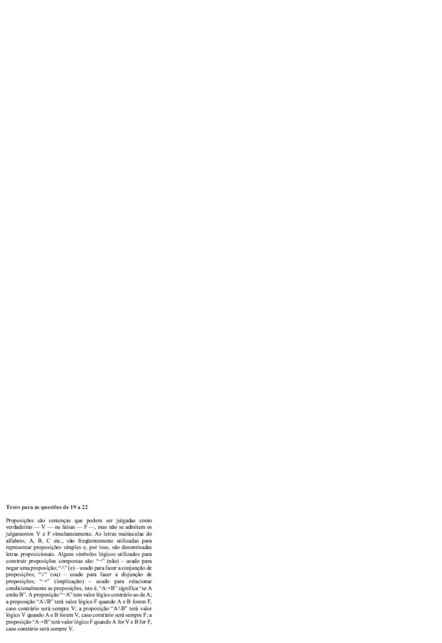 <p>Argumento 2:</p><p>Q1: O governo federal constrói a ferrovia com recursos da União ou toma emprestados 70% dos recursos necessários à construção da ferrovia, via</p><p>Tesouro Direto, pagando juros à taxa SELIC de 9% a.a., e empresta ao empresário, via banco público de desenvolvimento, à taxa subsidiada de 3% a.a.</p><p>Q2: Se o governo constrói a ferrovia com recursos da União, remunera o capital do construtor segundo sua taxa mínima de atratividade, que é de 16%</p><p>a.a.</p><p>Q3: É menos oneroso para o governo tomar emprestado via Tesouro Direto, pagando juros à taxa SELIC de 9% a.a. e financiar a construção à taxa</p><p>subsidiada de 3% a.a, do que remunerar o capital do construtor segundo sua taxa mínima de atratividade, de 16% a.a.</p><p>Q4: Se o governo empresta para o empresário 70% dos recursos necessários à construção da ferrovia, à taxa subsidiada de 3% a.a., então a taxa</p><p>interna de retorno do acionista no negócio supera sua taxa mínima de atratividade.</p><p>Q5: Se a taxa interna de retorno do acionista no negócio supera sua taxa mínima de atratividade, então o empresário tem interesse em investir seus</p><p>recursos próprios em parte da construção e na operação da ferrovia.</p><p>C2: Logo, se é menos oneroso para o governo tomar emprestado via Tesouro Direto, pagando juros à taxa SELIC de 9% a.a. e financiar à taxa</p><p>subsidiada de 3% a.a., do que remunerar o capital do construtor segundo sua taxa mínima de atratividade, de 16% a.a., então o governo toma</p><p>emprestados 70% dos recursos necessários à construção da ferrovia, via Tesouro Direto, pagando juros à taxa SELIC de 9% a.a., empresta ao</p><p>empresário, via banco público de desenvolvimento, à taxa subsidiada de 3% a.a., e o empresário terá interesse em investir seus recursos próprios em</p><p>parte da construção e na operação da ferrovia.</p><p>Com referência aos argumentos hipotéticos apresentados, julgue os itens seguintes, relativos à lógica sentencial.</p><p>Se o argumento 2 for válido, então a proposição Q3 será verdadeira.</p><p>( ) Certo</p><p>( ) Errado</p><p>198. Id: 273535 Ano: 2011 Bancas: CESPE/ CEBRASPE Instituições: EBC Provas: Cargos de Nível Superior Disciplina: Raciocínio</p><p>Lógico Matemático (RLM) Assuntos: 1.1.1 Sentenças e Proposições, 1.1.3 Proposições Simples e Compostas, Conectivos lógicos</p><p>Considerando as proposições simples P e Q e a proposição composta R simbolizada por (P∨Q) ∧ (~P) → (P∧Q) ∨ (~Q), julgue.</p><p>Se P tem valor lógico F, então, independentemente de Q ser V ou F, R será sempre F.</p><p>( ) Certo</p><p>( ) Errado</p><p>199. Id: 211987 Ano: 2013 Bancas: FCC Instituições: Sergipe Gás S.A. Provas: Administrador Disciplina: Estatística Assuntos:</p><p>2.6 Medidas de Posição ou Tendência Central, 2.7 Medidas de Dispersão ou Variação</p><p>Em uma empresa pública há 150 funcionários do sexo masculino e 100 do sexo feminino. As médias aritméticas dos salários dos funcionários do sexo</p><p>masculino e feminino são iguais. Os coeficientes de variação dos salários dos funcionários do sexo masculino e feminino são dados, respectivamente, por</p><p>0,15 e 0,10. O desvio padrão dos salários dos funcionários do sexo masculino supera em 40 reais o desvio padrão dos salários dos funcionários do sexo</p><p>feminino. Nessas condições, o quadrado do coeficiente de variação de todos os funcionários da empresa é igual a</p><p>a) 0,0156.</p><p>b) 0,0182.</p><p>c) 0,0170.</p><p>d) 0,0175.</p><p>e) 0,0164.</p><p>200. Id: 266735 Ano: 2011 Bancas: FCC Instituições: TCE-PR Provas: Analista de Controle Disciplina: Matemática Financeira</p><p>Assuntos: 2.2 Juros Compostos</p><p>Um capital é aplicado, durante dois anos, a juros compostos e o valor dos juros foi igual a R$ 3.052,80. Se a taxa de juros é de 12% ao ano, então o</p><p>montante correspondente desta aplicação, no final do período, é igual a</p><p>a) R$ 19.052,80.</p><p>b) R$ 18.052,80.</p><p>c) R$ 15.552,80.</p><p>d) R$ 15.052,80.</p><p>e) R$ 14.552,80.</p><p>Direitos autorais reservados (Lei 9610/98). Proibida a reprodução, venda ou compartilhamento deste arquivo. Uso individual</p><p>Cópia registrada para (CPF:)</p><p>201. Id: 595502 Ano: 2008 Bancas: CESPE/ CEBRASPE Instituições: TRT - 1ª REGIÃO (RJ) Provas: Analista Judiciário - Área</p><p>Administrativa Disciplina: Raciocínio Lógico Matemático (RLM) Assuntos: 1.2 Equivalências e Negações Lógicas</p><p>Proposições compostas são denominadas equivalentes quando possuem os mesmos valores lógicos V ou F, para todas as possíveis valorações V ou F</p><p>Firefox https://www.exponencialconcursos.com.br/questoes/main/imprimir_meus_cadernos_html/875467</p><p>38 of 197 28/05/2021 20:53</p>