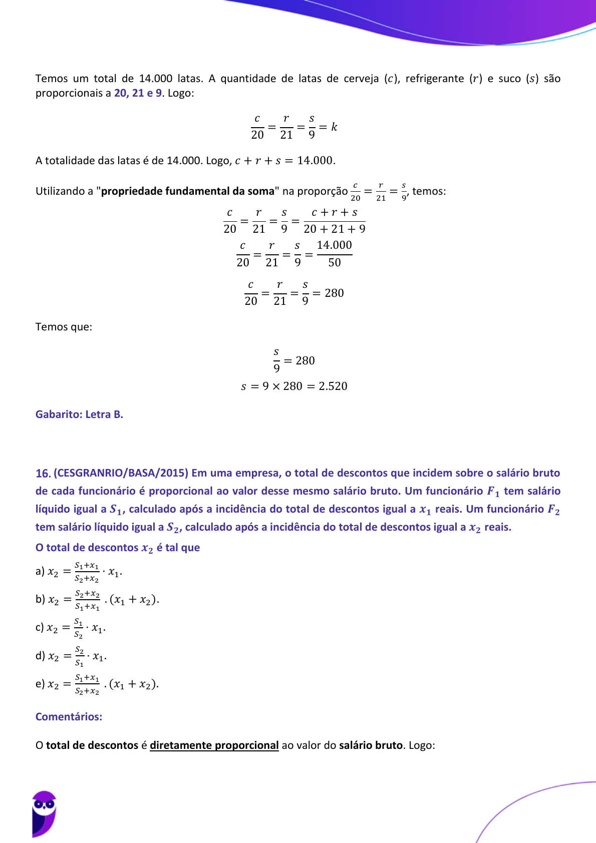 <p>Temos um total de 14.000 latas. A quantidade de latas de cerveja (𝑐), refrigerante (𝑟) e suco (𝑠) são</p><p>proporcionais a 20, 21 e 9. Logo:</p><p>𝑐</p><p>20</p><p>=</p><p>𝑟</p><p>21</p><p>=</p><p>𝑠</p><p>9</p><p>= 𝑘</p><p>A totalidade das latas é de 14.000. Logo, 𝑐 + 𝑟 + 𝑠 = 14.000.</p><p>Utilizando a "propriedade fundamental da soma" na proporção</p><p>𝑐</p><p>20</p><p>=</p><p>𝑟</p><p>21</p><p>=</p><p>𝑠</p><p>9</p><p>, temos:</p><p>𝑐</p><p>20</p><p>=</p><p>𝑟</p><p>21</p><p>=</p><p>𝑠</p><p>9</p><p>=</p><p>𝑐 + 𝑟 + 𝑠</p><p>20 + 21 + 9</p><p>𝑐</p><p>20</p><p>=</p><p>𝑟</p><p>21</p><p>=</p><p>𝑠</p><p>9</p><p>=</p><p>14.000</p><p>50</p><p>𝑐</p><p>20</p><p>=</p><p>𝑟</p><p>21</p><p>=</p><p>𝑠</p><p>9</p><p>= 280</p><p>Temos que:</p><p>𝑠</p><p>9</p><p>= 280</p><p>𝑠 = 9 × 280 = 2.520</p><p>Gabarito: Letra B.</p><p>(CESGRANRIO/BASA/2015) Em uma empresa, o total de descontos que incidem sobre o salário bruto</p><p>de cada funcionário é proporcional ao valor desse mesmo salário bruto. Um funcionário 𝑭𝟏 tem salário</p><p>líquido igual a 𝑺𝟏, calculado após a incidência do total de descontos igual a 𝒙𝟏 reais. Um funcionário 𝑭𝟐</p><p>tem salário líquido igual a 𝑺𝟐, calculado após a incidência do total de descontos igual a 𝒙𝟐 reais.</p><p>O total de descontos 𝒙𝟐 é tal que</p><p>a) 𝑥2 =</p><p>𝑆1+𝑥1</p><p>𝑆2+𝑥2</p><p>⋅ 𝑥1.</p><p>b) 𝑥2 =</p><p>𝑆2+𝑥2</p><p>𝑆1+𝑥1</p><p>. (𝑥1 + 𝑥2).</p><p>c) 𝑥2 =</p><p>𝑆1</p><p>𝑆2</p><p>⋅ 𝑥1.</p><p>d) 𝑥2 =</p><p>𝑆2</p><p>𝑆1</p><p>⋅ 𝑥1.</p><p>e) 𝑥2 =</p><p>𝑆1+𝑥1</p><p>𝑆2+𝑥2</p><p>. (𝑥1 + 𝑥2).</p><p>Comentários:</p><p>O total de descontos é diretamente proporcional ao valor do salário bruto. Logo:</p><p>Equipe Exatas Estratégia Concursos</p><p>Aula 00</p><p>Câmara Municipal de Guarulhos-SP - Matemática Financeira (Nível Superior) - 2023 (Pós-Edital)</p><p>www.estrategiaconcursos.com.br</p><p>183</p><p>269</p>