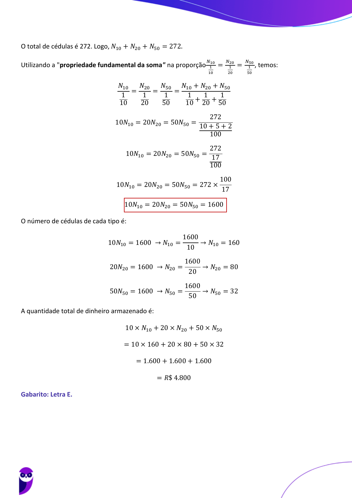 <p>O total de cédulas é 272. Logo, 𝑁10 + 𝑁20 + 𝑁50 = 272.</p><p>Utilizando a "propriedade fundamental da soma" na proporção</p><p>𝑁10</p><p>1</p><p>10</p><p>=</p><p>𝑁20</p><p>1</p><p>20</p><p>=</p><p>𝑁50</p><p>1</p><p>50</p><p>, temos:</p><p>𝑁10</p><p>1</p><p>10</p><p>=</p><p>𝑁20</p><p>1</p><p>20</p><p>=</p><p>𝑁50</p><p>1</p><p>50</p><p>=</p><p>𝑁10 + 𝑁20 + 𝑁50</p><p>1</p><p>10 +</p><p>1</p><p>20 +</p><p>1</p><p>50</p><p>10𝑁10 = 20𝑁20 = 50𝑁50 =</p><p>272</p><p>10 + 5 + 2</p><p>100</p><p>10𝑁10 = 20𝑁20 = 50𝑁50 =</p><p>272</p><p>17</p><p>100</p><p>10𝑁10 = 20𝑁20 = 50𝑁50 = 272 ×</p><p>100</p><p>17</p><p>10𝑁10 = 20𝑁20 = 50𝑁50 = 1600</p><p>O número de cédulas de cada tipo é:</p><p>10𝑁10 = 1600 → 𝑁10 =</p><p>1600</p><p>10</p><p>→ 𝑁10 = 160</p><p>20𝑁20 = 1600 → 𝑁20 =</p><p>1600</p><p>20</p><p>→ 𝑁20 = 80</p><p>50𝑁50 = 1600 → 𝑁50 =</p><p>1600</p><p>50</p><p>→ 𝑁50 = 32</p><p>A quantidade total de dinheiro armazenado é:</p><p>10 × 𝑁10 + 20 × 𝑁20 + 50 × 𝑁50</p><p>= 10 × 160 + 20 × 80 + 50 × 32</p><p>= 1.600 + 1.600 + 1.600</p><p>= 𝑅$ 4.800</p><p>Gabarito: Letra E.</p><p>Equipe Exatas Estratégia Concursos</p><p>Aula 00</p><p>Câmara Municipal de Guarulhos-SP - Matemática Financeira (Nível Superior) - 2023 (Pós-Edital)</p><p>www.estrategiaconcursos.com.br</p><p>207</p><p>269</p>