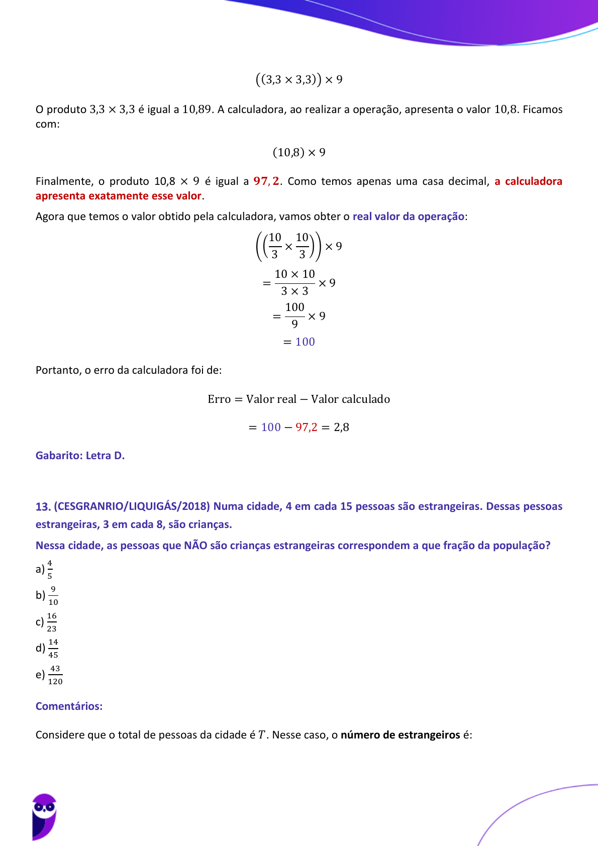 <p>((3,3 × 3,3)) × 9</p><p>O produto 3,3 × 3,3 é igual a 10,89. A calculadora, ao realizar a operação, apresenta o valor 10,8. Ficamos</p><p>com:</p><p>(10,8) × 9</p><p>Finalmente, o produto 10,8 × 9 é igual a 𝟗𝟕, 𝟐. Como temos apenas uma casa decimal, a calculadora</p><p>apresenta exatamente esse valor.</p><p>Agora que temos o valor obtido pela calculadora, vamos obter o real valor da operação:</p><p>((</p><p>10</p><p>3</p><p>×</p><p>10</p><p>3</p><p>)) × 9</p><p>=</p><p>10 × 10</p><p>3 × 3</p><p>× 9</p><p>=</p><p>100</p><p>9</p><p>× 9</p><p>= 100</p><p>Portanto, o erro da calculadora foi de:</p><p>Erro = Valor real − Valor calculado</p><p>= 100 − 97,2 = 2,8</p><p>Gabarito: Letra D.</p><p>(CESGRANRIO/LIQUIGÁS/2018) Numa cidade, 4 em cada 15 pessoas são estrangeiras. Dessas pessoas</p><p>estrangeiras, 3 em cada 8, são crianças.</p><p>Nessa cidade, as pessoas que NÃO são crianças estrangeiras correspondem a que fração da população?</p><p>a)</p><p>4</p><p>5</p><p>b)</p><p>9</p><p>10</p><p>c)</p><p>16</p><p>23</p><p>d)</p><p>14</p><p>45</p><p>e)</p><p>43</p><p>120</p><p>Comentários:</p><p>Considere que o total de pessoas da cidade é 𝑇. Nesse caso, o número de estrangeiros é:</p><p>Equipe Exatas Estratégia Concursos</p><p>Aula 00</p><p>Câmara Municipal de Guarulhos-SP - Matemática Financeira (Nível Superior) - 2023 (Pós-Edital)</p><p>www.estrategiaconcursos.com.br</p><p>84</p><p>269</p>