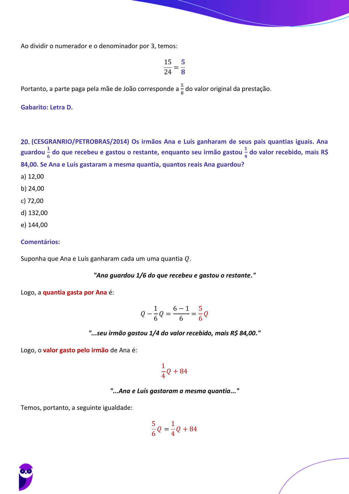 <p>Ao dividir o numerador e o denominador por 3, temos:</p><p>15</p><p>24</p><p>=</p><p>𝟓</p><p>𝟖</p><p>Portanto, a parte paga pela mãe de João corresponde a</p><p>5</p><p>8</p><p>do valor original da prestação.</p><p>Gabarito: Letra D.</p><p>(CESGRANRIO/PETROBRAS/2014) Os irmãos Ana e Luís ganharam de seus pais quantias iguais. Ana</p><p>guardou</p><p>𝟏</p><p>𝟔</p><p>do que recebeu e gastou o restante, enquanto seu irmão gastou</p><p>𝟏</p><p>𝟒</p><p>do valor recebido, mais R$</p><p>84,00. Se Ana e Luís gastaram a mesma quantia, quantos reais Ana guardou?</p><p>a) 12,00</p><p>b) 24,00</p><p>c) 72,00</p><p>d) 132,00</p><p>e) 144,00</p><p>Comentários:</p><p>Suponha que Ana e Luís ganharam cada um uma quantia 𝑄.</p><p>"Ana guardou 1/6 do que recebeu e gastou o restante."</p><p>Logo, a quantia gasta por Ana é:</p><p>𝑄 −</p><p>1</p><p>6</p><p>𝑄 =</p><p>6 − 1</p><p>6</p><p>=</p><p>5</p><p>6</p><p>𝑄</p><p>"...seu irmão gastou 1/4 do valor recebido, mais R$ 84,00."</p><p>Logo, o valor gasto pelo irmão de Ana é:</p><p>1</p><p>4</p><p>𝑄 + 84</p><p>"...Ana e Luís gastaram a mesma quantia..."</p><p>Temos, portanto, a seguinte igualdade:</p><p>5</p><p>6</p><p>𝑄 =</p><p>1</p><p>4</p><p>𝑄 + 84</p><p>Equipe Exatas Estratégia Concursos</p><p>Aula 00</p><p>Câmara Municipal de Guarulhos-SP - Matemática Financeira (Nível Superior) - 2023 (Pós-Edital)</p><p>www.estrategiaconcursos.com.br</p><p>92</p><p>269</p>
