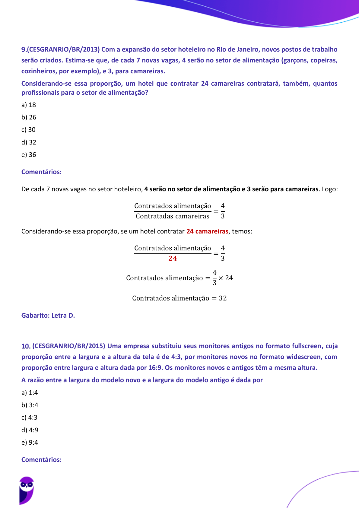 <p>(CESGRANRIO/BR/2013) Com a expansão do setor hoteleiro no Rio de Janeiro, novos postos de trabalho</p><p>serão criados. Estima-se que, de cada 7 novas vagas, 4 serão no setor de alimentação (garçons, copeiras,</p><p>cozinheiros, por exemplo), e 3, para camareiras.</p><p>Considerando-se essa proporção, um hotel que contratar 24 camareiras contratará, também, quantos</p><p>profissionais para o setor de alimentação?</p><p>a) 18</p><p>b) 26</p><p>c) 30</p><p>d) 32</p><p>e) 36</p><p>Comentários:</p><p>De cada 7 novas vagas no setor hoteleiro, 4 serão no setor de alimentação e 3 serão para camareiras. Logo:</p><p>Contratados alimentação</p><p>Contratadas camareiras</p><p>=</p><p>4</p><p>3</p><p>Considerando-se essa proporção, se um hotel contratar 24 camareiras, temos:</p><p>Contratados alimentação</p><p>𝟐𝟒</p><p>=</p><p>4</p><p>3</p><p>Contratados alimentação =</p><p>4</p><p>3</p><p>× 24</p><p>Contratados alimentação = 32</p><p>Gabarito: Letra D.</p><p>(CESGRANRIO/BR/2015) Uma empresa substituiu seus monitores antigos no formato fullscreen, cuja</p><p>proporção entre a largura e a altura da tela é de 4:3, por monitores novos no formato widescreen, com</p><p>proporção entre largura e altura dada por 16:9. Os monitores novos e antigos têm a mesma altura.</p><p>A razão entre a largura do modelo novo e a largura do modelo antigo é dada por</p><p>a) 1:4</p><p>b) 3:4</p><p>c) 4:3</p><p>d) 4:9</p><p>e) 9:4</p><p>Comentários:</p><p>Equipe Exatas Estratégia Concursos</p><p>Aula 00</p><p>Câmara Municipal de Guarulhos-SP - Matemática Financeira (Nível Superior) - 2023 (Pós-Edital)</p><p>www.estrategiaconcursos.com.br</p><p>130</p><p>269</p>