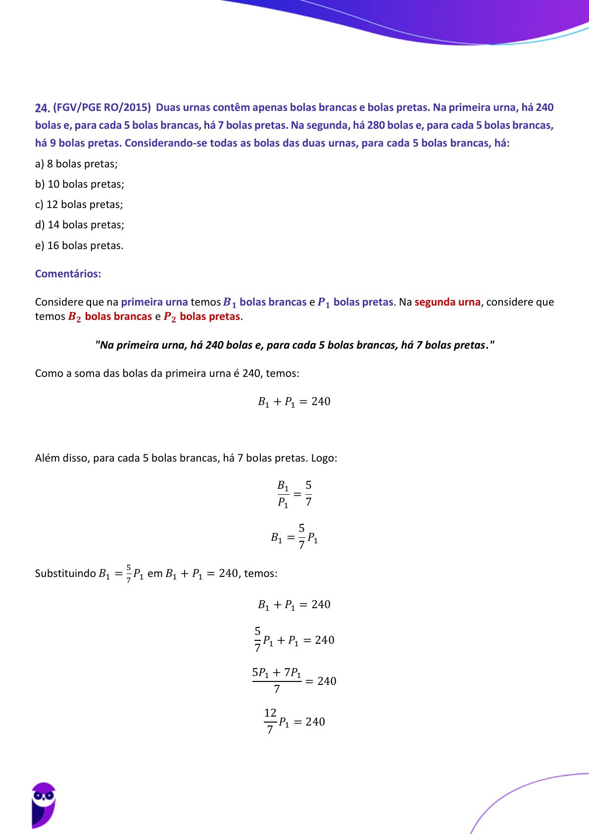 <p>(FGV/PGE RO/2015) Duas urnas contêm apenas bolas brancas e bolas pretas. Na primeira urna, há 240</p><p>bolas e, para cada 5 bolas brancas, há 7 bolas pretas. Na segunda, há 280 bolas e, para cada 5 bolas brancas,</p><p>há 9 bolas pretas. Considerando-se todas as bolas das duas urnas, para cada 5 bolas brancas, há:</p><p>a) 8 bolas pretas;</p><p>b) 10 bolas pretas;</p><p>c) 12 bolas pretas;</p><p>d) 14 bolas pretas;</p><p>e) 16 bolas pretas.</p><p>Comentários:</p><p>Considere que na primeira urna temos 𝑩𝟏 bolas brancas e 𝑷𝟏 bolas pretas. Na segunda urna, considere que</p><p>temos 𝑩𝟐 bolas brancas e 𝑷𝟐 bolas pretas.</p><p>"Na primeira urna, há 240 bolas e, para cada 5 bolas brancas, há 7 bolas pretas."</p><p>Como a soma das bolas da primeira urna é 240, temos:</p><p>𝐵1 + 𝑃1 = 240</p><p>Além disso, para cada 5 bolas brancas, há 7 bolas pretas. Logo:</p><p>𝐵1</p><p>𝑃1</p><p>=</p><p>5</p><p>7</p><p>𝐵1 =</p><p>5</p><p>7</p><p>𝑃1</p><p>Substituindo 𝐵1 =</p><p>5</p><p>7</p><p>𝑃1 em 𝐵1 + 𝑃1 = 240, temos:</p><p>𝐵1 + 𝑃1 = 240</p><p>5</p><p>7</p><p>𝑃1 + 𝑃1 = 240</p><p>5𝑃1 + 7𝑃1</p><p>7</p><p>= 240</p><p>12</p><p>7</p><p>𝑃1 = 240</p><p>Equipe Exatas Estratégia Concursos</p><p>Aula 00</p><p>Câmara Municipal de Guarulhos-SP - Matemática Financeira (Nível Superior) - 2023 (Pós-Edital)</p><p>www.estrategiaconcursos.com.br</p><p>149</p><p>269</p>