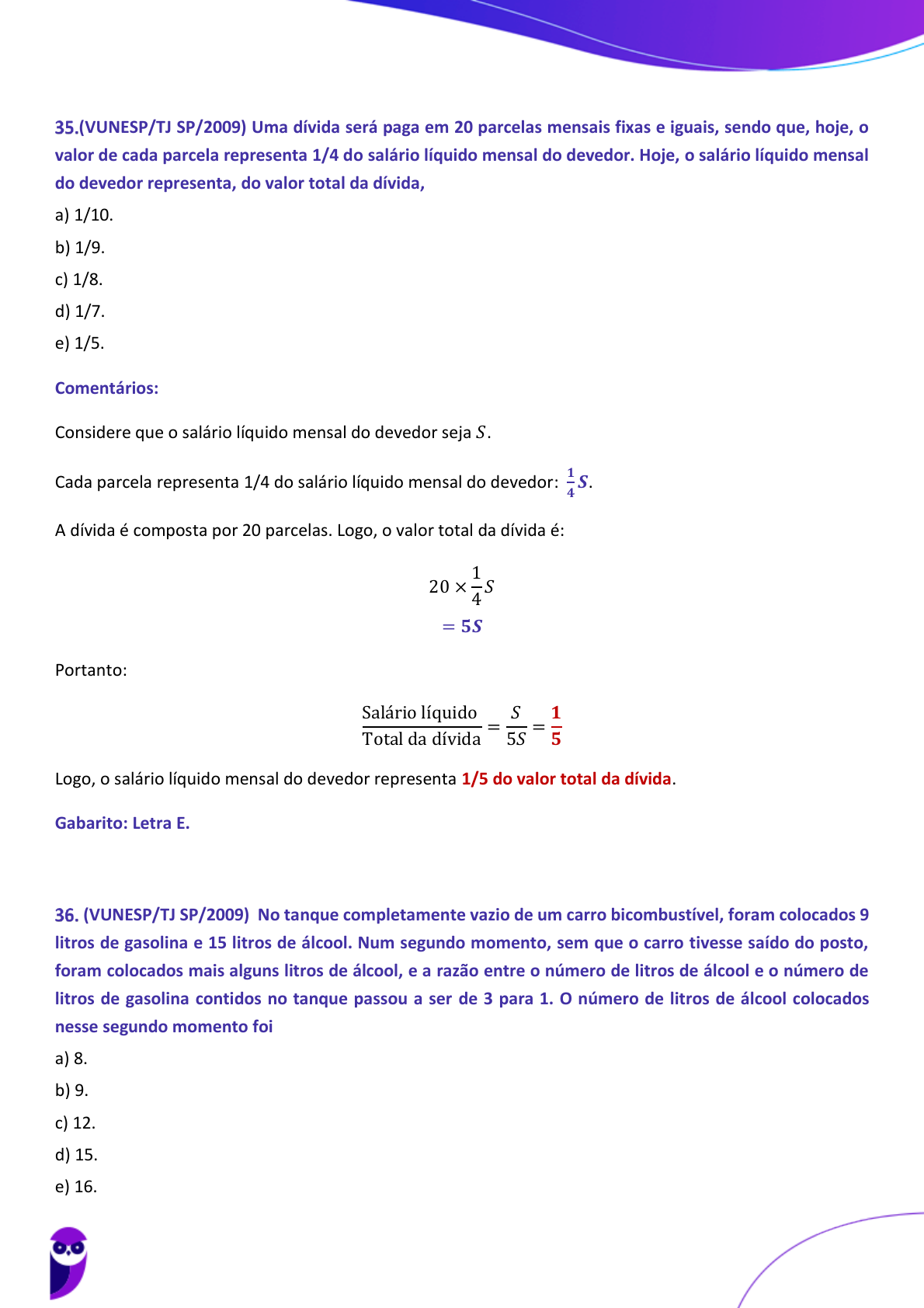 <p>(VUNESP/TJ SP/2009) Uma dívida será paga em 20 parcelas mensais fixas e iguais, sendo que, hoje, o</p><p>valor de cada parcela representa 1/4 do salário líquido mensal do devedor. Hoje, o salário líquido mensal</p><p>do devedor representa, do valor total da dívida,</p><p>a) 1/10.</p><p>b) 1/9.</p><p>c) 1/8.</p><p>d) 1/7.</p><p>e) 1/5.</p><p>Comentários:</p><p>Considere que o salário líquido mensal do devedor seja 𝑆.</p><p>Cada parcela representa 1/4 do salário líquido mensal do devedor:</p><p>𝟏</p><p>𝟒</p><p>𝑺.</p><p>A dívida é composta por 20 parcelas. Logo, o valor total da dívida é:</p><p>20 ×</p><p>1</p><p>4</p><p>𝑆</p><p>= 𝟓𝑺</p><p>Portanto:</p><p>Salário líquido</p><p>Total da dívida</p><p>=</p><p>𝑆</p><p>5𝑆</p><p>=</p><p>𝟏</p><p>𝟓</p><p>Logo, o salário líquido mensal do devedor representa 1/5 do valor total da dívida.</p><p>Gabarito: Letra E.</p><p>(VUNESP/TJ SP/2009) No tanque completamente vazio de um carro bicombustível, foram colocados 9</p><p>litros de gasolina e 15 litros de álcool. Num segundo momento, sem que o carro tivesse saído do posto,</p><p>foram colocados mais alguns litros de álcool, e a razão entre o número de litros de álcool e o número de</p><p>litros de gasolina contidos no tanque passou a ser de 3 para 1. O número de litros de álcool colocados</p><p>nesse segundo momento foi</p><p>a) 8.</p><p>b) 9.</p><p>c) 12.</p><p>d) 15.</p><p>e) 16.</p><p>Equipe Exatas Estratégia Concursos</p><p>Aula 00</p><p>Câmara Municipal de Guarulhos-SP - Matemática Financeira (Nível Superior) - 2023 (Pós-Edital)</p><p>www.estrategiaconcursos.com.br</p><p>163</p><p>269</p>