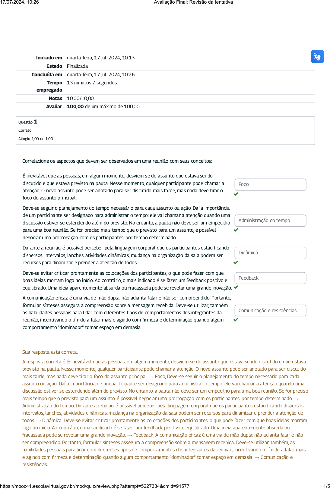 <p>Iniciado em quarta-feira, 17 jul. 2024, 10:13</p><p>Estado Finalizada</p><p>Concluída em quarta-feira, 17 jul. 2024, 10:26</p><p>Tempo</p><p>empregado</p><p>13 minutos 7 segundos</p><p>Notas 10,00/10,00</p><p>Avaliar 100,00 de um máximo de 100,00</p><p>Questão 1</p><p>Correto</p><p>Atingiu 1,00 de 1,00</p><p>Correlacione os aspectos que devem ser observados em uma reunião com seus conceitos:</p><p>É inevitável que as pessoas, em algum momento, desviem-se do assunto que estava sendo</p><p>discutido e que estava previsto na pauta. Nesse momento, qualquer participante pode chamar a</p><p>atenção. O novo assunto pode ser anotado para ser discutido mais tarde, mas nada deve tirar o</p><p>foco do assunto principal.</p><p></p><p>Deve-se seguir o planejamento do tempo necessário para cada assunto ou ação. Daí a importância</p><p>de um participante ser designado para administrar o tempo: ele vai chamar a atenção quando uma</p><p>discussão estiver se estendendo além do previsto. No entanto, a pauta não deve ser um empecilho</p><p>para uma boa reunião. Se for preciso mais tempo que o previsto para um assunto, é possível</p><p>negociar uma prorrogação com os participantes, por tempo determinado.</p><p></p><p>Durante a reunião, é possível perceber pela linguagem corporal que os participantes estão �cando</p><p>dispersos. Intervalos, lanches, atividades dinâmicas, mudança na organização da sala podem ser</p><p>recursos para dinamizar e prender a atenção de todos. </p><p>Deve-se evitar criticar prontamente as colocações dos participantes, o que pode fazer com que</p><p>boas ideias morram logo no início. Ao contrário, o mais indicado é se fazer um feedback positivo e</p><p>equilibrado. Uma ideia aparentemente absurda ou fracassada pode se revelar uma grande inovação. </p><p>A comunicação e�caz é uma via de mão dupla: não adianta falar e não ser compreendido. Portanto,</p><p>formular sínteses assegura a compreensão sobre a mensagem recebida. Deve-se utilizar, também,</p><p>as habilidades pessoais para lidar com diferentes tipos de comportamentos dos integrantes da</p><p>reunião, incentivando o tímido a falar mais e agindo com �rmeza e determinação quando algum</p><p>comportamento “dominador” tomar espaço em demasia.</p><p></p><p>Foco</p><p>Administração do tempo</p><p>Dinâmica</p><p>Feedback</p><p>Comunicação e resistências</p><p>Sua resposta está correta.</p><p>A resposta correta é: É inevitável que as pessoas, em algum momento, desviem-se do assunto que estava sendo discutido e que estava</p><p>previsto na pauta. Nesse momento, qualquer participante pode chamar a atenção. O novo assunto pode ser anotado para ser discutido</p><p>mais tarde, mas nada deve tirar o foco do assunto principal. → Foco, Deve-se seguir o planejamento do tempo necessário para cada</p><p>assunto ou ação. Daí a importância de um participante ser designado para administrar o tempo: ele vai chamar a atenção quando uma</p><p>discussão estiver se estendendo além do previsto. No entanto, a pauta não deve ser um empecilho para uma boa reunião. Se for preciso</p><p>mais tempo que o previsto para um assunto, é possível negociar uma prorrogação com os participantes, por tempo determinado. →</p><p>Administração do tempo, Durante a reunião, é possível perceber pela linguagem corporal que os participantes estão �cando dispersos.</p><p>Intervalos, lanches, atividades dinâmicas, mudança na organização da sala podem ser recursos para dinamizar e prender a atenção de</p><p>todos. → Dinâmica, Deve-se evitar criticar prontamente as colocações dos participantes, o que pode fazer com que boas ideias morram</p><p>logo no início. Ao contrário, o mais indicado é se fazer um feedback positivo e equilibrado. Uma ideia aparentemente absurda ou</p><p>fracassada pode se revelar uma grande inovação. → Feedback, A comunicação e�caz é uma via de mão dupla: não adianta falar e não</p><p>ser compreendido. Portanto, formular sínteses assegura a compreensão sobre a mensagem recebida. Deve-se utilizar, também, as</p><p>habilidades pessoais para lidar com diferentes tipos de comportamentos dos integrantes da reunião, incentivando o tímido a falar mais</p><p>e agindo com �rmeza e determinação quando algum comportamento “dominador” tomar espaço em demasia. → Comunicação e</p><p>resistências.</p><p>17/07/2024, 10:26 Avaliação Final: Revisão da tentativa</p><p>https://mooc41.escolavirtual.gov.br/mod/quiz/review.php?attempt=5227384&cmid=91577 1/5</p><p>Questão 2</p><p>Correto</p><p>Atingiu 1,00 de 1,00</p><p>Questão 3</p><p>Correto</p><p>Atingiu 1,00 de 1,00</p><p>As decisões podem ser autocráticas, por consenso ou por voto.</p><p>Correlacione as formas de decisões com suas características.</p><p>Os participantes da reunião contribuem apenas com pareceres a serem levados em conta por quem</p><p>vai decidir.</p><p></p><p>Todos os participantes assumem a responsabilidade pelo encaminhamento e sucesso da decisão</p><p>tomada. A decisão deve ser construída levando em conta todos os argumentos e dúvidas levantados.</p><p></p><p>Tipo de decisão em que ocorre quando há grandes divergências entre os participantes. Embora seja</p><p>uma solução mais rápida que o consenso, ela tem o inconveniente de criar uma divisão entre</p><p>vencedores e vencidos. </p><p>Decisão Autocrática</p><p>Decisões por consenso</p><p>Decisão por voto</p><p>Sua resposta está correta.</p><p>A resposta correta é: Os participantes da reunião contribuem apenas com pareceres a serem levados em conta por quem vai decidir. →</p><p>Decisão Autocrática, Todos os participantes assumem a responsabilidade pelo encaminhamento e sucesso da decisão tomada. A</p><p>decisão deve ser construída levando em conta todos os argumentos e dúvidas levantados. → Decisões por consenso, Tipo de decisão</p><p>em que ocorre quando há grandes dive