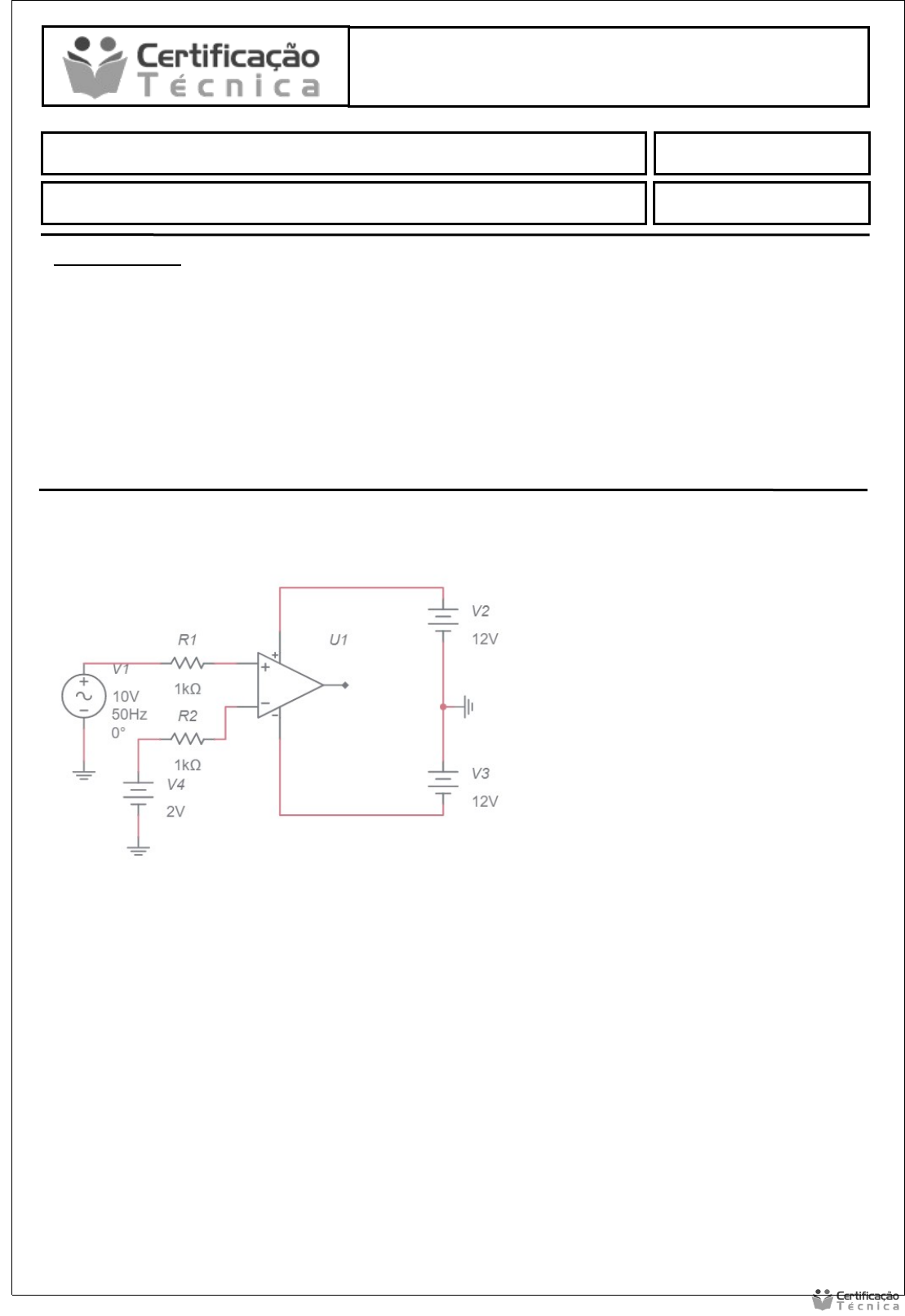 <p>Amplificadores Operacionais</p><p>Data: .</p><p>Aluno (a):</p><p>Avaliação Pratica</p><p>INSTRUÇÕES:</p><p>· Esta Avaliação contém 1 (uma) questão, totalizando 10 (dez) pontos;</p><p>· Baixe o arquivo disponível com a Atividade Pratica;</p><p>· Você deve preencher dos dados no Cabeçalho para sua identificação:</p><p>· Nome / Data de entrega.</p><p>· As respostas devem ser digitadas abaixo de cada pergunta;</p><p>· Ao terminar grave o arquivo com o nome Atividade Prática;</p><p>· Quando solicitado</p><p>· Envio o arquivo pelo sistema no local indicado;</p><p>· Em caso de dúvidas consulte o seu Tutor.</p><p>Simule o circuito abaixo, use um osciloscópio para medir o sinal de saída e o apresente aqui:</p><p>image1.emf</p><p>image2.png</p><p>image3.png</p><p>INSTRUÇÕES</p><p>:</p><p>v</p><p>Esta</p><p>Avaliação</p><p>contém</p><p>1</p><p>(</p><p>uma</p><p>) quest</p><p>ão</p><p>, totalizando 10 (dez) pontos</p><p>;</p><p>v</p><p>Baixe o arquivo dispon</p><p>ível com a Atividade Pratica</p><p>;</p><p>v</p><p>Você deve preencher dos dados no Cabeçalho para sua identificação</p><p>:</p><p>o</p><p>Nome / Data de entrega</p><p>.</p><p>v</p><p>As respostas devem ser digitadas abaixo de</p><p>cada pergunta</p><p>;</p><p>v</p><p>Ao terminar</p><p>grave o arquivo com o nome Atividade Prática</p><p>;</p><p>o</p><p>Quando solicitado</p><p>v</p><p>Envio o arquivo pelo sistema no local indicado</p><p>;</p><p>v</p><p>Em caso de dúvidas consulte o seu Tutor</p><p>.</p><p>Aluno</p><p>(a):</p><p>Data</p><p>:</p><p>.</p><p>Amplificadores Operacionais</p><p>A</p><p>valiação Pratica</p><p>Simule o circuito abaixo, use um osciloscópio para medir o sinal de saída e o apresente aqui:</p><p>INSTRUÇÕES:</p><p> Esta Avaliação contém 1 (uma) questão, totalizando 10 (dez) pontos;</p><p> Baixe o arquivo disponível com a Atividade Pratica;</p><p> Você deve preencher dos dados no Cabeçalho para sua identificação:</p><p>o Nome / Data de entrega.</p><p> As respostas devem ser digitadas abaixo de cada pergunta;</p><p> Ao terminar grave o arquivo com o nome Atividade Prática;</p><p>o Quando solicitado</p><p> Envio o arquivo pelo sistema no local indicado;</p><p> Em caso de dúvidas consulte o seu Tutor.</p><p>Aluno (a):</p><p>Data: .</p><p>Amplificadores Operacionais</p><p>Avaliação Pratica</p><p>Simule o circuito abaixo, use um osciloscópio para medir o sinal de saída e o apresente aqui:</p>