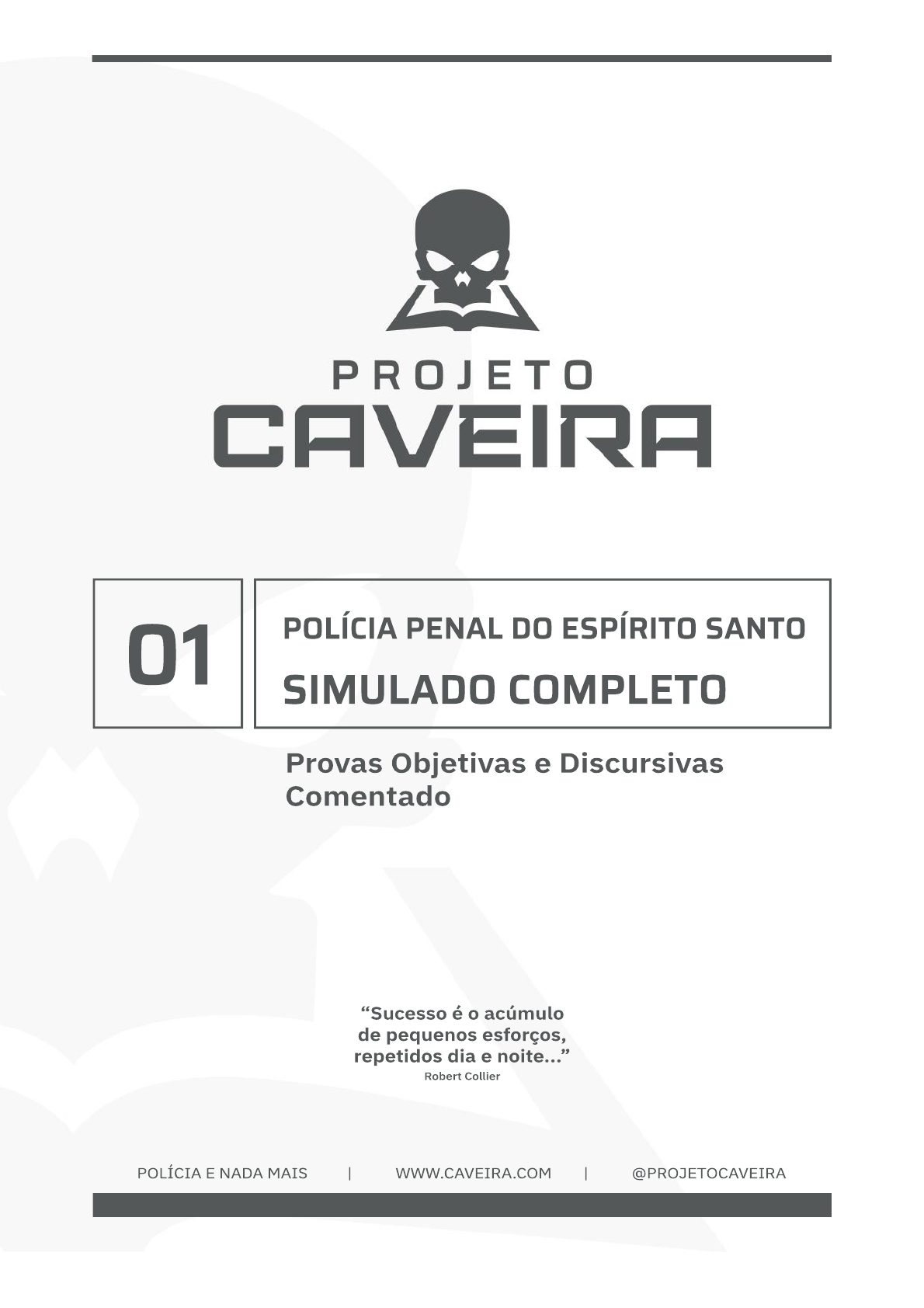 <p>01</p><p>Provas Objetivas e Discursivas</p><p>Comentado</p><p>POLÍCIA PENAL DO ESPÍRITO SANTO</p><p>SIMULADO COMPLETO</p><p>POLÍCIA E NADA MAIS | WWW.CAVEIRA.COM | @PROJETOCAVEIRA</p><p>“Sucesso é o acúmulo</p><p>de pequenos esforços,</p><p>repetidos dia e noite...”</p><p>Robert Collier</p><p>1119987.12/07/2024</p><p>815.378.917-15.141582</p><p>GABARITO - 1º Simulado PPES (Pós-Edital)</p><p>1 2 3 4 5 6 7 8 9 10</p><p>D A D C A E C D X C</p><p>11 12 13 14 15 16 17 18 19 20</p><p>C D B D C B A C E C</p><p>21 22 23 24 25 26 27 28 29 30</p><p>C A B E B D C A E D</p><p>31 32 33 34 35 36 37 38 39 40</p><p>B D E A D A C E B E</p><p>41 42 43 44 45 46 47 48 49 50</p><p>A C B E D C C E D B</p><p>51 52 53 54 55 56 57 58 59 60</p><p>E D C E C B D C B A</p><p>1119987.12/07/2024</p><p>815.378.917-15.141582</p><p>1</p><p>PROVA DISCURSIVA – PROJETO CAVEIRA</p><p>TEMA 02 – PP-ES</p><p>Uma pesquisa realizada pelo Datafolha, encomendada pelo Fórum Brasileiro de Segurança</p><p>Pública, em 2016, apontou que 57% da população de grandes cidades brasileiras concorda com</p><p>a frase "bandido bom é bandido morto". Na prática, a afirmação é uma violação aos direitos</p><p>humanos. Significa que mais da metade da população de grandes cidades defende a justiça feita</p><p>pelas próprias mãos, atropelando o devido processo penal do Estado democrático de direito e</p><p>defendendo o fim da vida de alguém, ou seja, violando o princípio mais básico dos direitos</p><p>humanos: o direito à vida. Zylbersztajn lembra que "uma pessoa que comete crime tem direito à</p><p>defesa, ao devido processo legal, e que cumpra pena à qual ela foi julgada. Os direitos humanos</p><p>não vão garantir impunidade, vão garantir que a pessoa tenha defesa, tenha um processo justo.</p><p>Isso é difícil de entender, às vezes", diz, citando os sentimentos de "vingança", de "não querer</p><p>que criminosos tenham direitos protegidos". A proteção dos direitos humanos de criminosos</p><p>garante que os direitos humanos sejam universais. Ou seja, direitos humanos serem coisa de</p><p>"bandido" seria muito mais um discurso do que uma crença verdadeira. Quando questionadas,</p><p>as pessoas identificaram direitos básicos como o que são de fato: saúde e educação para todos,</p><p>entre outros.</p><p>GRAGANI, J. BBC NEWS. O que são direitos humanos e por que há quem acredite que seu</p><p>propósito é a defesa de 'bandidos'? Publicado em 25/03/18. Disponível em [link].</p><p>Com base na reflexão promovida pelo texto acima elencado e nos seus conhecimentos gerais,</p><p>redija um texto dissertativo-argumentativo, com 20 a 50 linhas, considerando a seguinte temática:</p><p>Segurança pública e direitos humanos: Como garantir a proteção dos cidadãos sem violar</p><p>seus direitos fundamentais?</p><p>1119987.12/07/2024</p><p>815.378.917-15.141582</p><p>https://www.bbc.com/portuguese/brasil-43465988</p><p>2</p><p>TEMA 01 – COMENTADO – PP-ES</p><p>PONTO DE IGNIÇÃO</p><p>Aquecendo os motores!</p><p>Olá, Caveira! Pronto para treinar para a sua discursiva? O primeiro ponto que você deve</p><p>voltar a sua atenção é quanto ao gênero solicitado pela banca. Com base na sua última prova,</p><p>a banca pode solicitar ou um texto com o gênero descritivo, ou um texto com o gênero</p><p>dissertativo.</p><p>Devido à maior complexidade desse segundo tipo textual, hoje, nosso treinamento estará</p><p>voltado a ele. Destaca-se que, no gênero dissertativo, estão presentes argumentação, valores,</p><p>crenças, hipóteses.</p><p>O gênero dissertativo-argumentativo demanda que você escreva sobre o tema sugerido</p><p>sob determinado ponto de vista (ou tese), e busque justificar esse ponto de vista com</p><p>argumentos que o validem.</p><p>Deve-se voltar à atenção, a seguir, ao atendimento da estrutura introdução-</p><p>desenvolvimento-conclusão, pois as bancas também atribuem pontos ao atendimento dessa</p><p>estrutura, típica da dissertação.</p><p>Sugerimos que, em um texto de 20 a 50 linhas, você utilize dois a três parágrafos de</p><p>desenvolvimento para validar o seu ponto de vista, assim, proporcionando distintos pontos de</p><p>convencimento do leitor/examinador, e fazendo a banca atribuir uma melhor pontuação ao seu</p><p>texto!</p><p>E aí, bora treinar?</p><p>DUAS TESES E ARGUMENTOS POSSÍVEIS</p><p>Depois de aquecer os motores... aceleramos.</p><p>Nada mais justo, Caveira!</p><p>Na primeira parte dessa apresentação eu te mostrei como lidar com a estrutura de um</p><p>texto dissertativo-argumentativo.</p><p>Só para ajudar a memória, você vai lidar com: introdução – desenvolvimento –</p><p>conclusão.</p><p>Agora, nas linhas abaixo, você vai ter a chance de verificar alguns modelos de teses e</p><p>argumentos possíveis para encaixar no tema proposto. Desde já, eu preciso combinar algumas</p><p>coisas com você:</p><p>1. As teses e argumentos apresentados são exemplos, apenas;</p><p>2. Você não precisa concordar com nenhuma das teses/argumentos. Você é totalmente</p><p>livre para desenvolver os seus! Lembre-se, contudo, de sempre embasar o seu ponto de</p><p>vista.</p><p>3. Existem infindos tipos de teses e argumentos além dos apresentados aqui, e você pode</p><p>usar, estes últimos, em outros tipos de teses.</p><p>1119987.12/07/2024</p><p>815.378.917-15.141582</p><p>3</p><p>EXEMPLO DE TESE 1</p><p>O equilíbrio entre segurança pública e direitos humanos deve ser alcançado através do</p><p>fortalecimento de políticas de prevenção e inteligência, priorizando abordagens não</p><p>violentas e garantindo o devido processo legal para suspeitos</p><p>A) Primeiro argumento em defesa da tese: Investimento em políticas de prevenção e</p><p>inteligência</p><p>A segurança pública é uma preocupação constante das sociedades, e encontrar</p><p>meios eficazes de combater a criminalidade sem comprometer os direitos fundamentais dos</p><p>