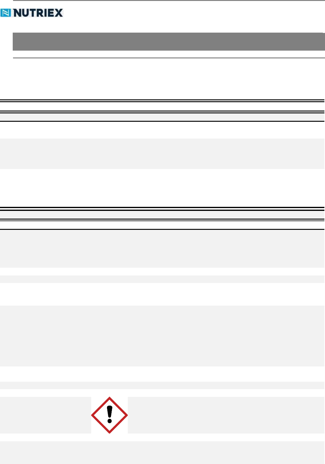<p>FISPQ</p><p>Em conformidade com NBR 14725</p><p>FICHA DE INFORMAÇÕES DE SEGURANÇA DE PRODUTOS QUÍMICOS</p><p>Produto: CITRIC POWER - SABONETE LÍQUIDO DESENGRAXANTE PARA AS MÃOS COM</p><p>ESFOLIANTE NUTRIEX PROFISSIONAL</p><p>Código: FISPQ – 021 Versão: 06 Data da Última Revisão: 08/2019 Página 1 de 7</p><p>1- Identificação do Produto e da Empresa</p><p>Nome do produto: CITRIC POWER - SABONETE LÍQUIDO DESENGRAXANTE PARA AS MÃOS COM</p><p>ESFOLIANTE NUTRIEX PROFISSIONAL</p><p>Principais usos recomendados: Sabonete líquido para a limpeza pesada das mãos. Remove facilmente sujeiras como óleos,</p><p>fuligem, graxa, cimento e poeiras. Deixa a pele macia, hidratada e suavemente perfumada</p><p>Aplique uma pequena quantidade sobre as mãos secas e esfregue bem para a remoção total</p><p>do produto. Adicione um pouco de água e lave. Enxágue até retirar todo o produto</p><p>Empresa: NUTRIEX INDÚSTRIA DE COSMÉTICOS LTDA</p><p>RUA 7, QD.ÁREA 1, LT. C. SETOR ARAGUAIA. APARECIDA DE GOIÂNIA-GO. CEP: 74981-070</p><p>e-mail: sac@nutriex.com.br</p><p>TELEFONE DE EMERGÊNCIA: (62) 3954-9616</p><p>Responsável Técnica: Daniele Aparecida Santos de Carvalho - CRQ XII Reg: 12300706</p><p>2- Identificação de perigos</p><p>Perigos mais importantes:</p><p>Pode causar reações alérgicas na pele, em caso de exposição continuada por mais de 1 hora</p><p>ou em casos de pessoas sensíveis aos componentes da fórmula</p><p>Manter fora do alcance das crianças e animais domésticos, em local fresco, seco e ao abrigo</p><p>da luz. Em contato com os olhos, lavar abundantemente com água corrente. Suspender o</p><p>uso em caso de irritação e procure orientação médica. USO EXTERNO</p><p>Efeitos do produto</p><p>Classificação de perigo do</p><p>produto químico:</p><p>Sensibilização à pele - categoria 1</p><p>Toxidade aguda - oral - categoria 5</p><p>Lesões oculares graves/irritação ocular - categoria 2B</p><p>Sistema de Classificação</p><p>utilizado:</p><p>Norma ABNT NBR 14725-2:2009 Versão Corrigida:2010</p><p>Produtos químicos - Informações sobre segurança, saúde e meio ambiente</p><p>Parte 2: Sistema de classificação de perigo</p><p>Norma ABNT NBR 14725-3:2017</p><p>Produtos químicos - Informações sobre segurança, saúde e meio ambiente</p><p>Parte 3: Rotulagem</p><p>Adoção do Sistema Globalmente Harmonizado para sua Classificação e Rotulagem de</p><p>Produtos Químicos, ONU</p><p>Visão geral de Emergências: Este produto é um sabonete desengraxante, sua utilização é de uso intencional e deve ser</p><p>realizada de acordo com as indicações do fabricante</p><p>Elementos apropriados da rotulagem</p><p>Pictogramas:</p><p>Palavra de Advertência: Atenção</p><p>Frases de perigo:</p><p>H317 - Pode provocar reações alérgicas na pele</p><p>H303 - Pode ser nocivo se ingerido</p><p>H320 - Provoca irritação ocular</p><p>Frases de precaução: P280 - Use luvas de proteção/roupa de proteção/proteção ocular/proteção facial</p><p>mailto:sac@nutriex.com.br</p><p>http://www.abntcatalogo.com.br/norma.aspx?ID=62390</p><p>http://www.abntcatalogo.com.br/norma.aspx?ID=62390</p><p>http://www.abntcatalogo.com.br/norma.aspx?ID=62390</p><p>http://www.abntcatalogo.com.br/norma.aspx?ID=374798</p><p>http://www.abntcatalogo.com.br/norma.aspx?ID=374798</p><p>http://www.abntcatalogo.com.br/norma.aspx?ID=374798</p><p>FISPQ</p><p>Em conformidade com NBR 14725</p><p>FICHA DE INFORMAÇÕES DE SEGURANÇA DE PRODUTOS QUÍMICOS</p><p>Produto: CITRIC POWER - SABONETE LÍQUIDO DESENGRAXANTE PARA AS MÃOS COM</p><p>ESFOLIANTE NUTRIEX PROFISSIONAL</p><p>Código: FISPQ – 021 Versão: 06 Data da Última Revisão: 08/2019 Página 2 de 7</p><p>prevenção P264 - Lave cuidadosamente após o manuseio</p><p>Frases de precaução: resposta à</p><p>emergência</p><p>P333 + P313 - Em caso de irritação ou erupção cutânea: Consulte um médico</p><p>P321 - Tratamento específico (veja... neste rótulo)</p><p>P362 + P364 - Retire a roupa contaminada. Lave-a antes de usá-la novamente</p><p>P312 - Caso sinta indisposição, contate um CENTRO DE INFORMAÇÃO</p><p>TOXICOLÓGICA/médico</p><p>P305 + P351 + P338 + P337 + P313 – EM CASO DE CONTATO COM OS OLHOS: Enxágue</p><p>cuidadosamente com água durante vários minutos. No caso de uso de lentes de contato,</p><p>remova-as, se for fácil. Continue enxaguando. Caso a irritação ocular persista: Consulte um</p><p>medico</p><p>Frases de precaução:</p><p>armazenamento</p><p>Não exigidas</p><p>Frases de precaução:</p><p>disposição</p><p>P501 – Descarte o conteúdo/recipiente conforme as regulamentações locais</p><p>Diamante de Hummel:</p><p>4 = Extremo</p><p>3 = Alto</p><p>2 = Moderado</p><p>1 = Leve</p><p>0 = Sem risco</p><p># = Risco crônico à saúde</p><p>3- Composição e Informações sobre os Ingredientes</p><p>Mistura</p><p>CITRIC POWER - SABONETE LÍQUIDO DESENGRAXANTE PARA AS MÃOS COM ESFOLIANTE</p><p>NUTRIEX PROFISSIONAL</p><p>Natureza química: Cosmético - mistura de tensoativos aniônicos em veículo aquoso</p><p>Ingredientes que contribuem</p><p>para o perigo (%m):</p><p>Ingredientes Faixa de Concentração (%) Nº CAS</p><p>Os ingredientes não listados não apresentam concentrações que contribuam para o perigo</p><p>4- Medidas de primeiros-socorros</p><p>Inalação:</p><p>Remova a vítima para local arejado e mantenha-a em repouso</p><p>Caso sinta indisposição, contate o Disque-Intoxicação/ANVISA: 0800-722-6001 ou Procure</p><p>atendimento médico especializado</p><p>Leve esta FISPQ</p><p>Contato com a pele:</p><p>Em caso de irritação, lave com água em abundância</p><p>Remova as roupas impregnadas com o produto</p><p>Procure atendimento médico especializado</p><p>Leve esta FISPQ</p><p>Contato com os olhos:</p><p>Lave com água corrente por pelo menos 15 minutos, mantendo as pálpebras abertas</p><p>Retire lentes de contato quando for o caso</p><p>Procure atendimento médico especializado</p